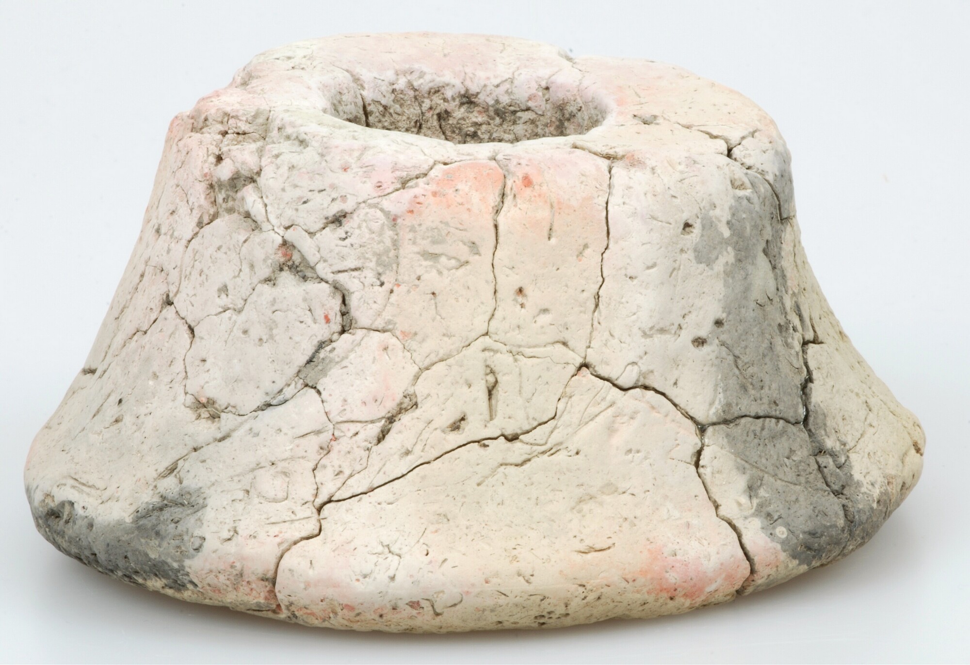 Netverzwaarder; inheems-Romeins aardewerk; conisch met centrale doorboring (diameter: 3.5 cm)