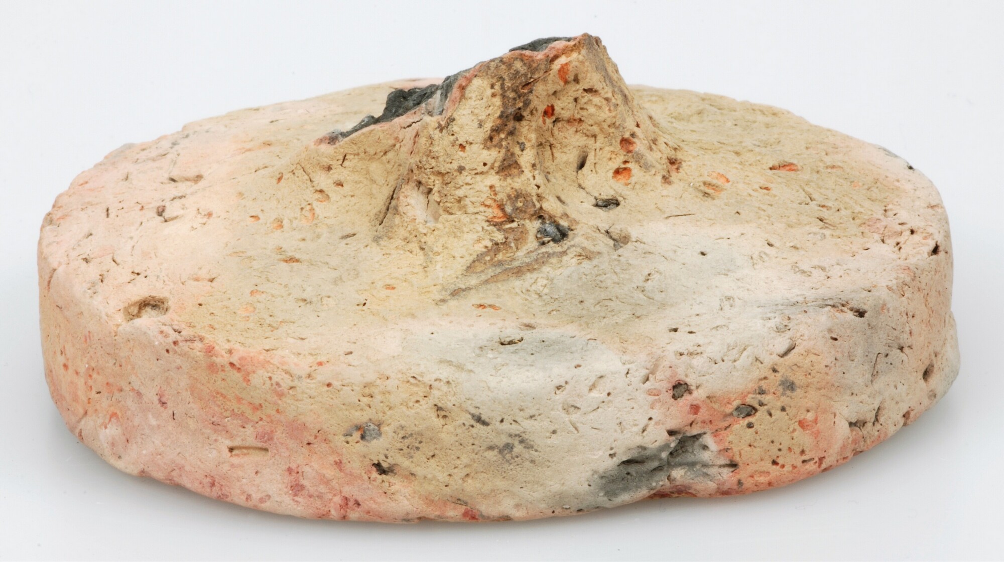 Deksel; inheems-romeins aardewerk; ronde deksel met afgebroken greep; lichtbruin/oranje baksel met donkergrijze kern; potgruis magering