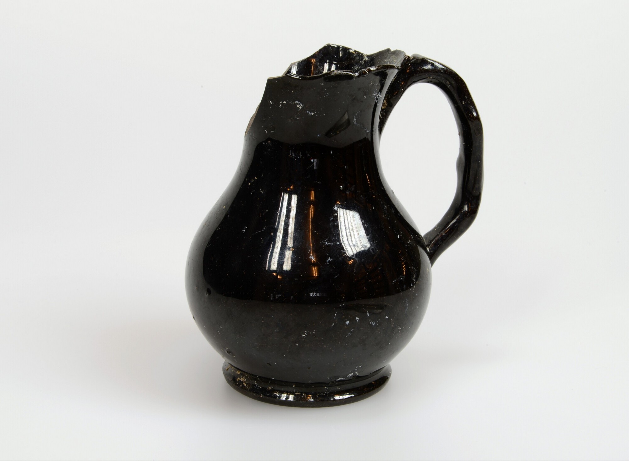 Kan; iz-kan-1; peervormige kan met uitgebogen brede rand, rand in model gesneden; industrieel zwart; Jackfield ware; loodglazuur; één vormoor; standring; herkomst: Engeland