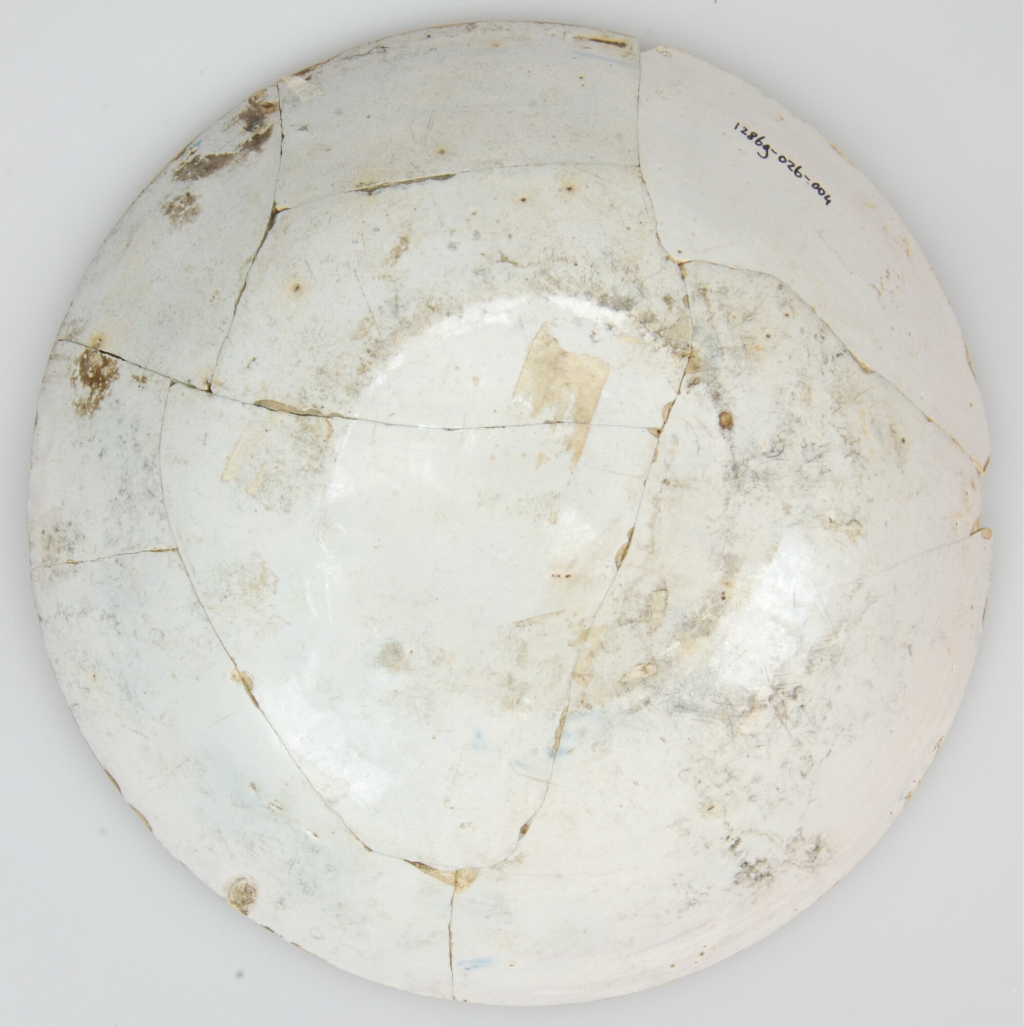 Bord; f-bor-3; afgerond bord met platte bodem en vrij brede vlag; Nederlandse faience; tinglazuur; blauw op wit: strooibloemen en twijgjes op spiegel; twijgjes op vlag; standvlak; herkomst: Nederland