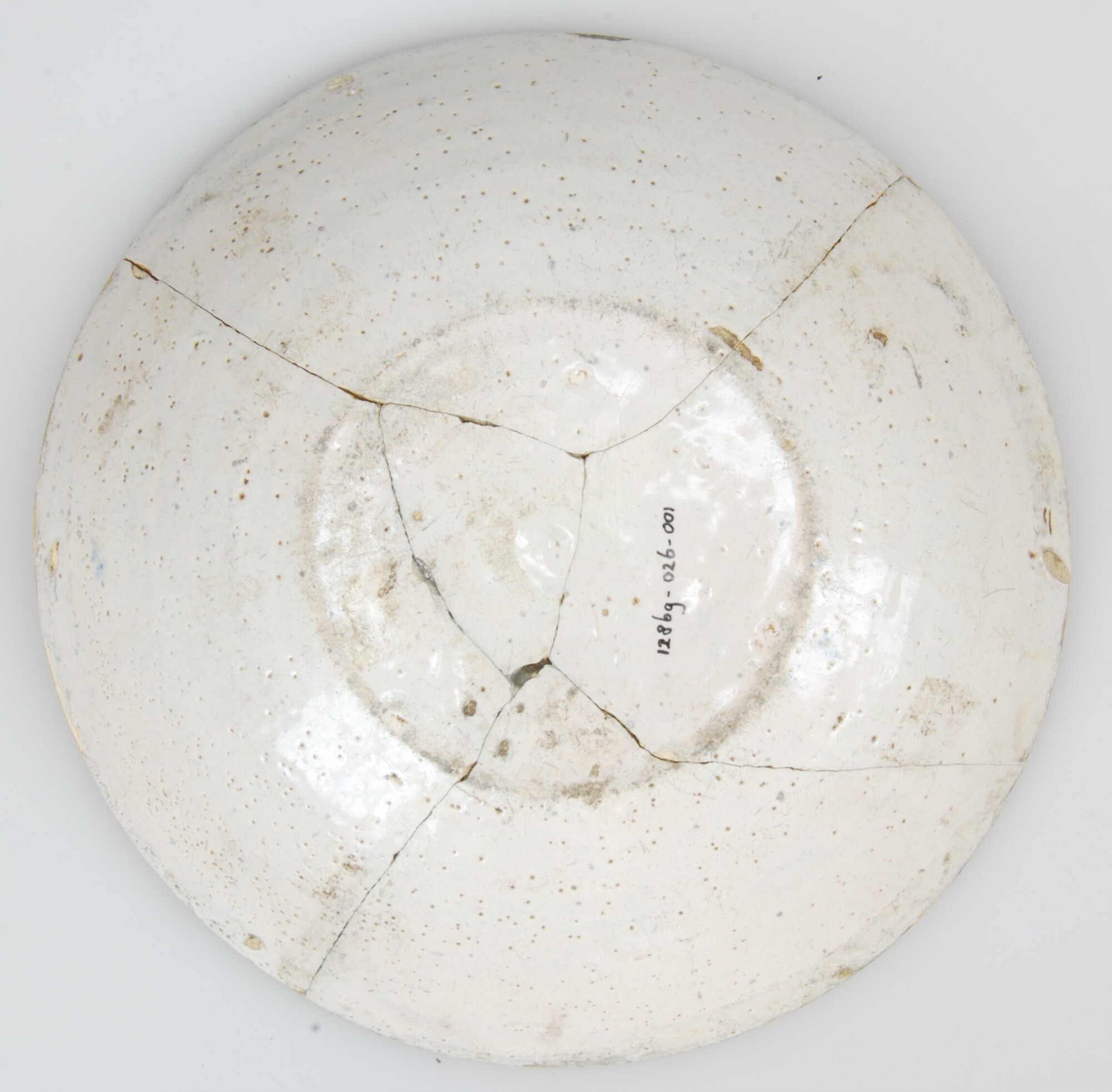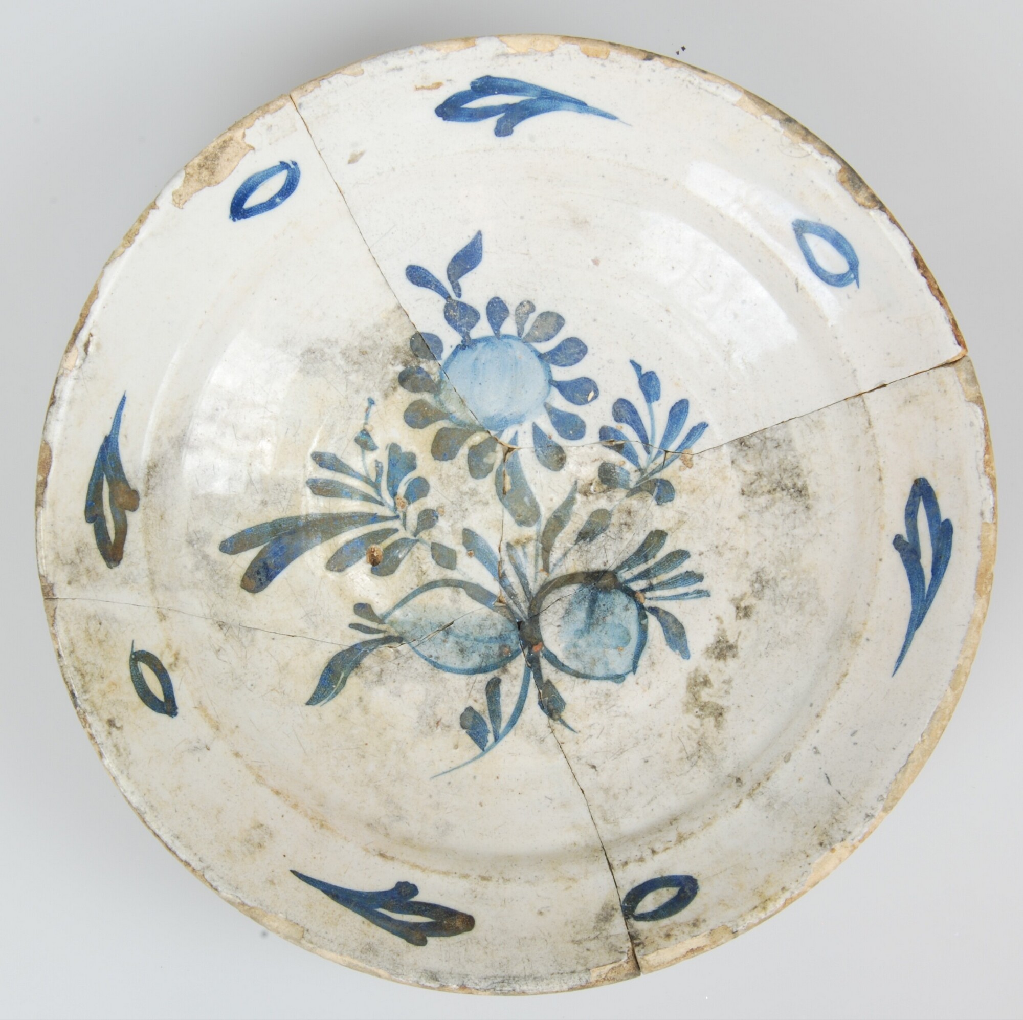 Bord; f-bor-3; afgerond bord met platte bodem en vrij brede vlag; Nederlandse faience; tinglazuur; blauw op wit: strooibloemen en twijgjes op spiegel; twijgjes op vlag; standvlak; herkomst: Nederland