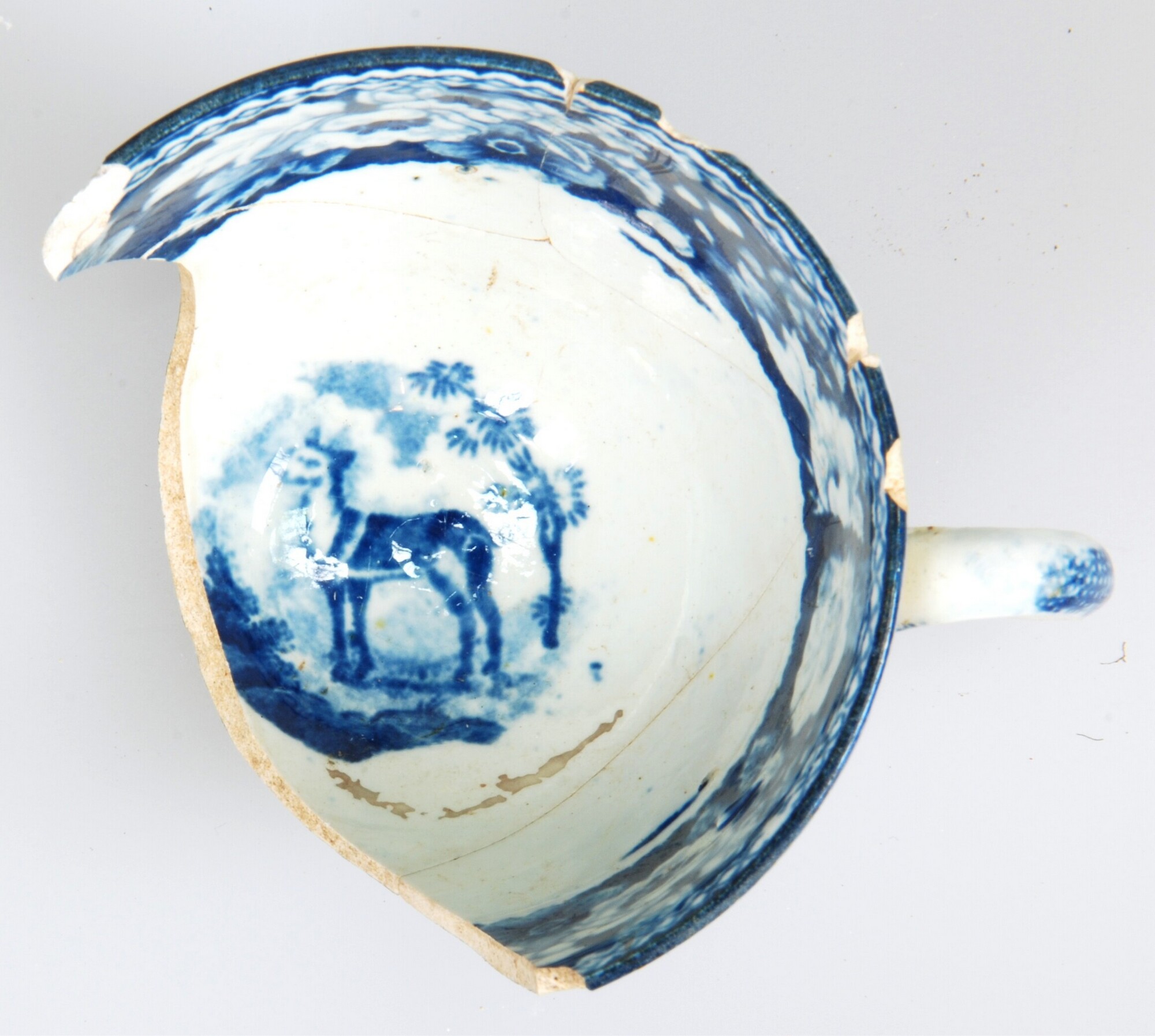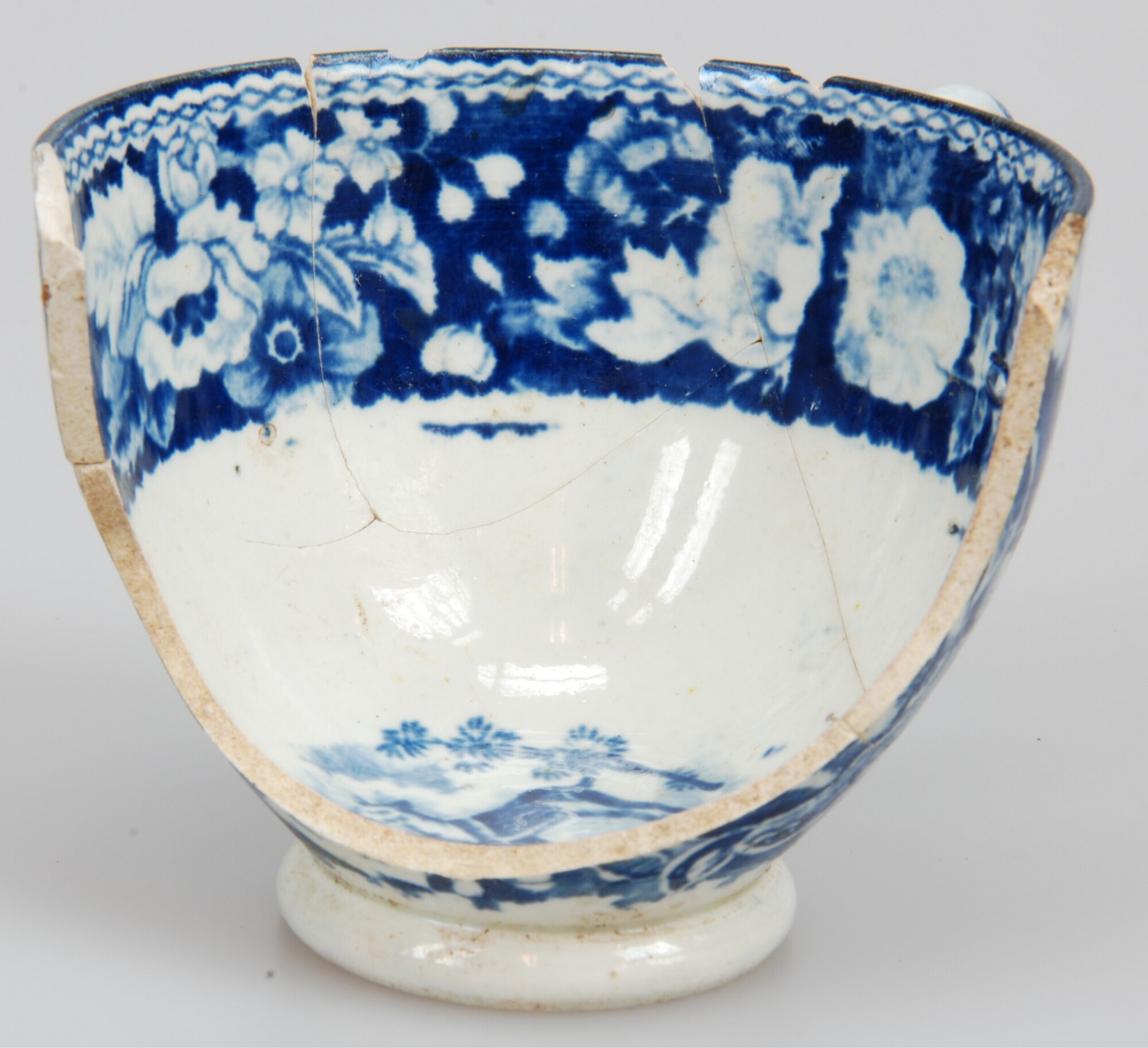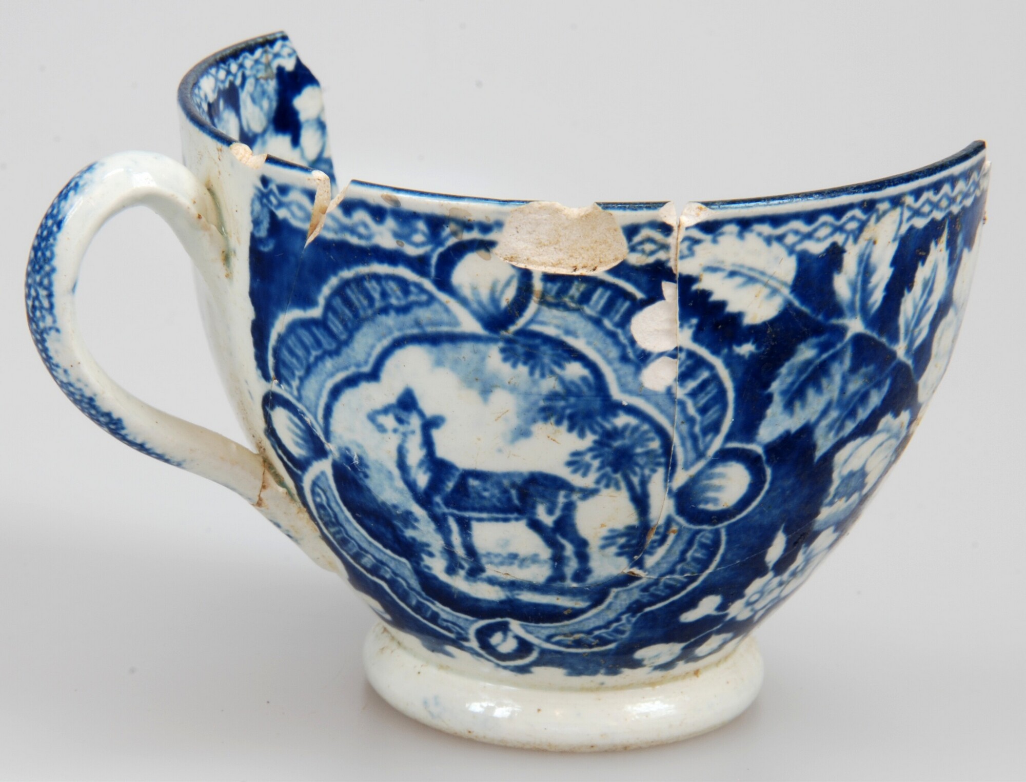 Kop; iw-kop-?; witgoed; loodglazuur; drukdecor in blauw: inw. schaap (?) in landschap met langs de rand bloemmotief, uitw.: schaap (?) tussen bloemdecor; standring; herkomst: Engeland