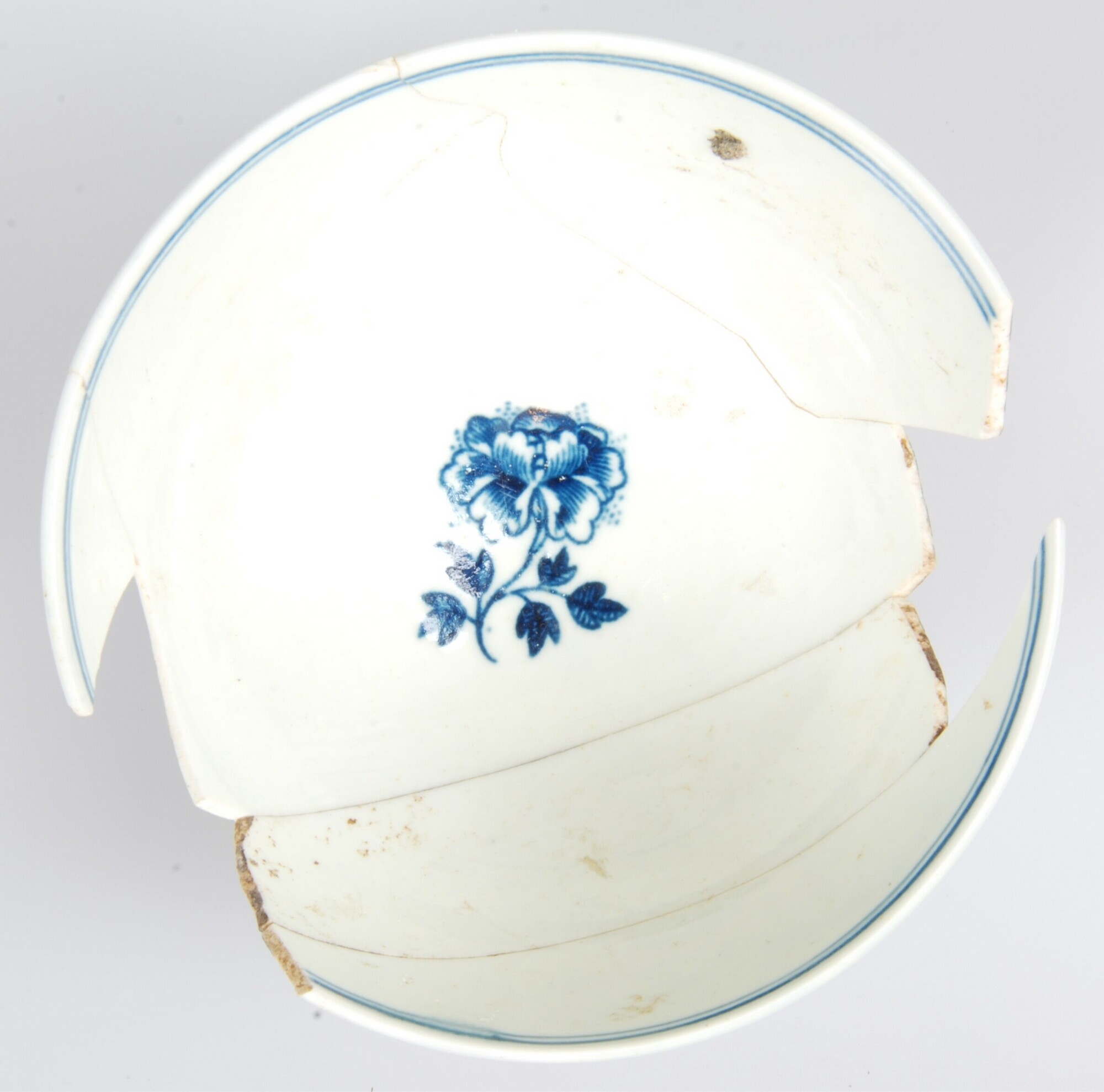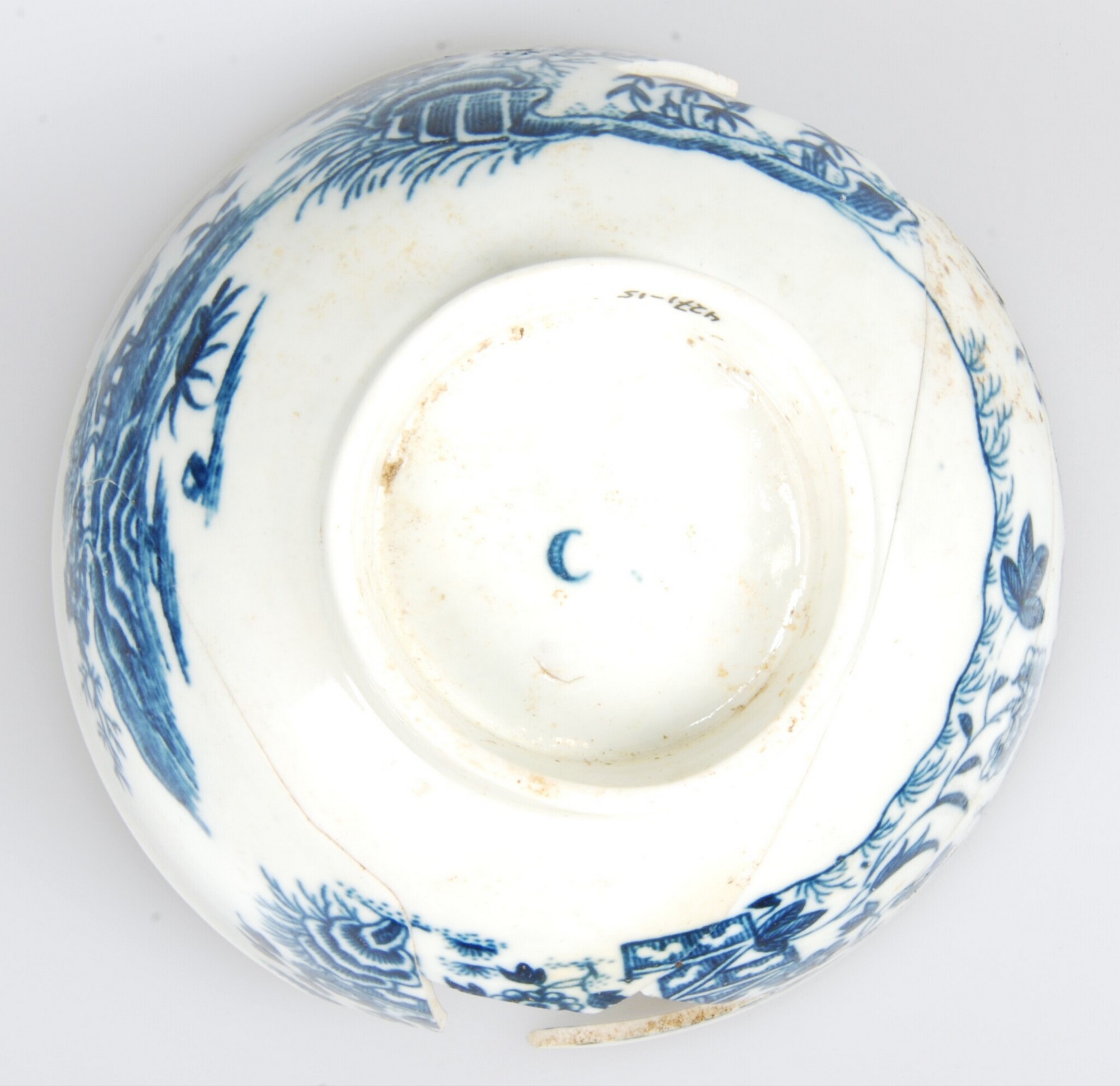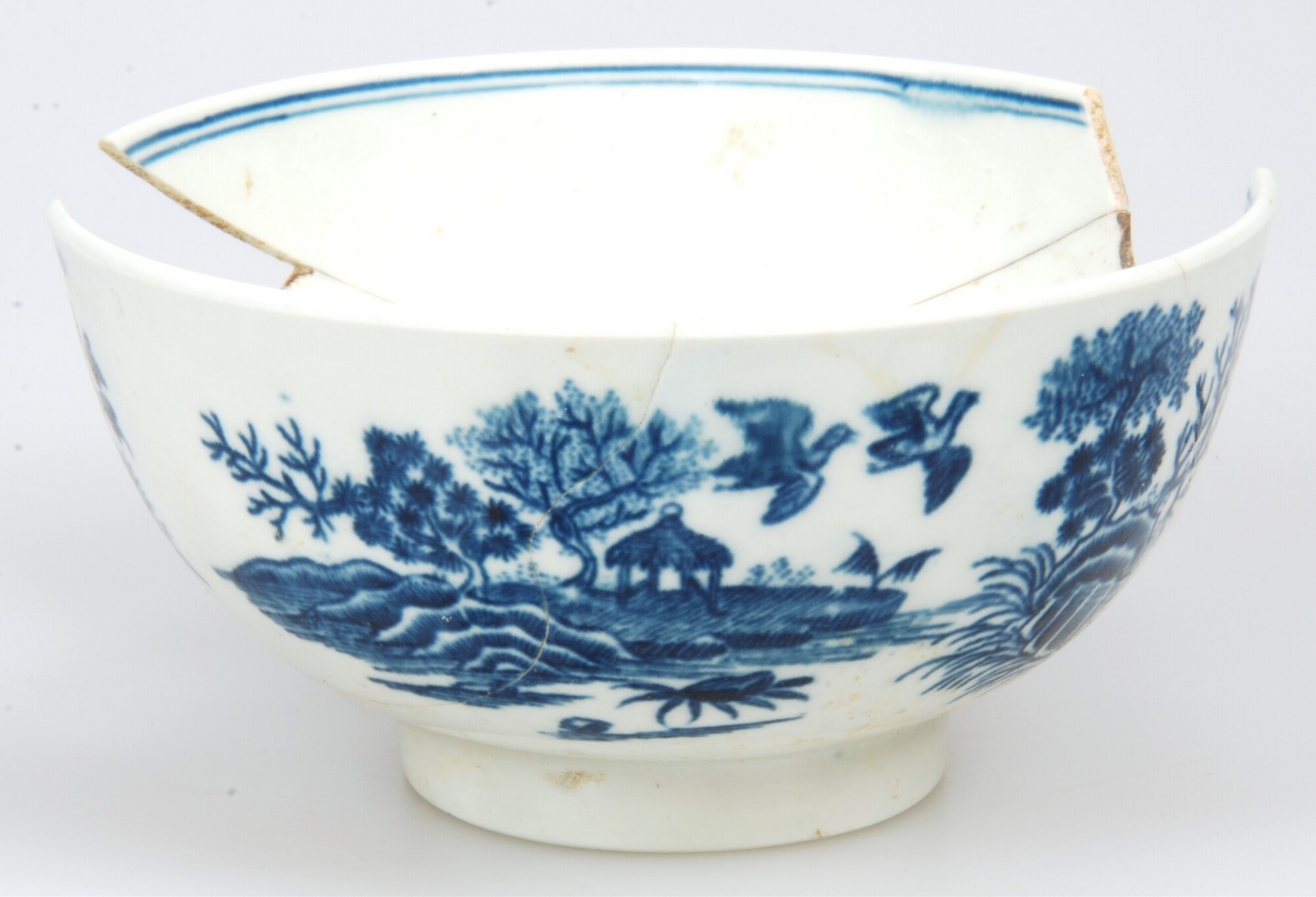 Kom; iw-kom-5; bolle kom met rechte rand, standring; industrieel Engels porselein (soft-paste porcelain); loodglazuur; onderglazuur blauw drukdecor: Chinees landschap; herkomst: Worcester, Engeland