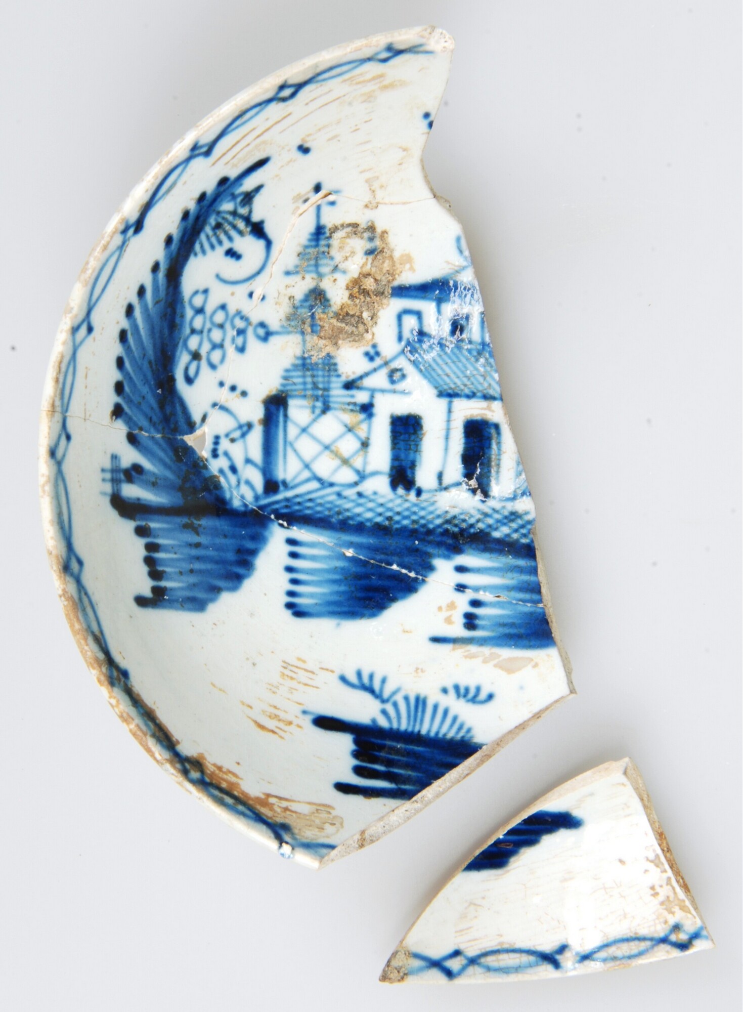 Schotel; iw-bor-3; afgerond bord zonder vlag, standring; industrieel wit aardewerk (pearlware); in- en uitw: loodglazuur, inw: onderglazuur blauwe beschildering; pagode in landschap (Chinese house pattern), boogjes langs rand; herkomst: Engeland