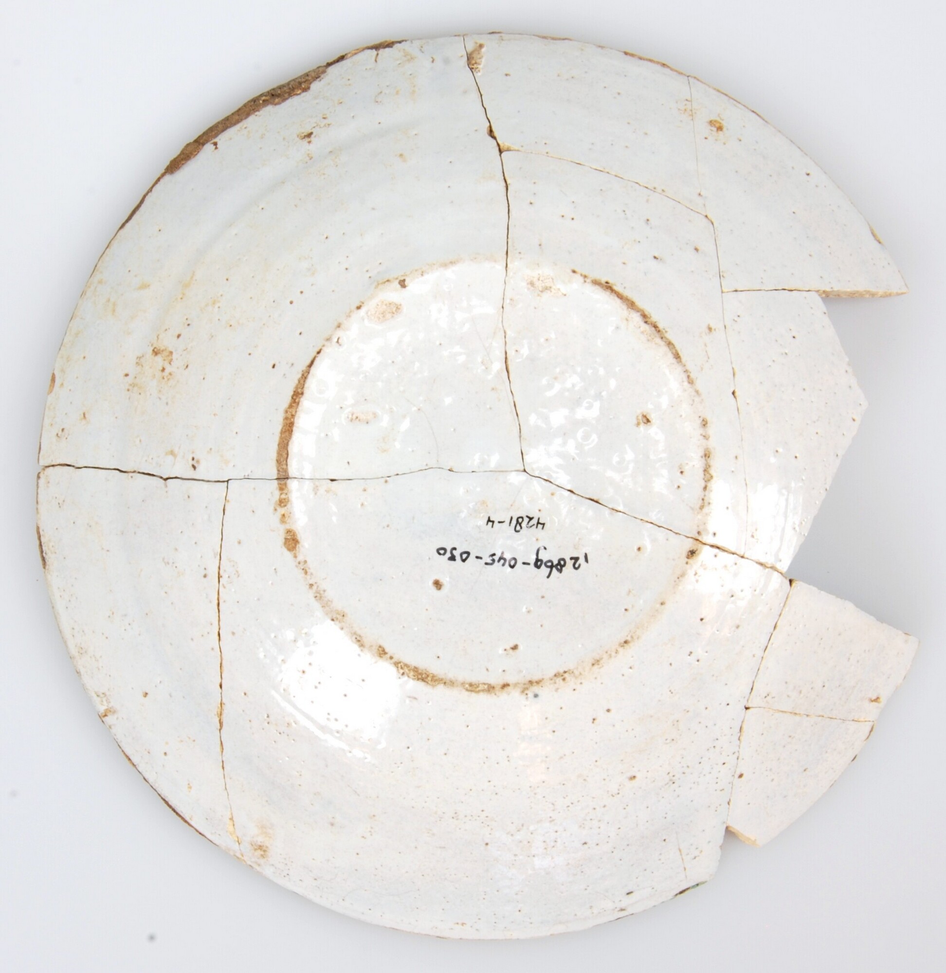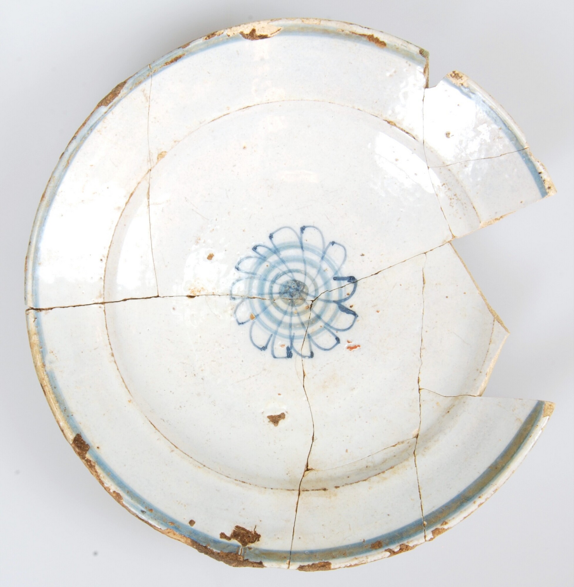 Bord; f-bor-3; afgerond bord met platte bodem en vrij brede vlag; Nederlandse faience; tinglazuur; blauw op wit: centrale rozet op spiegel; cirkel op rand; standvlak