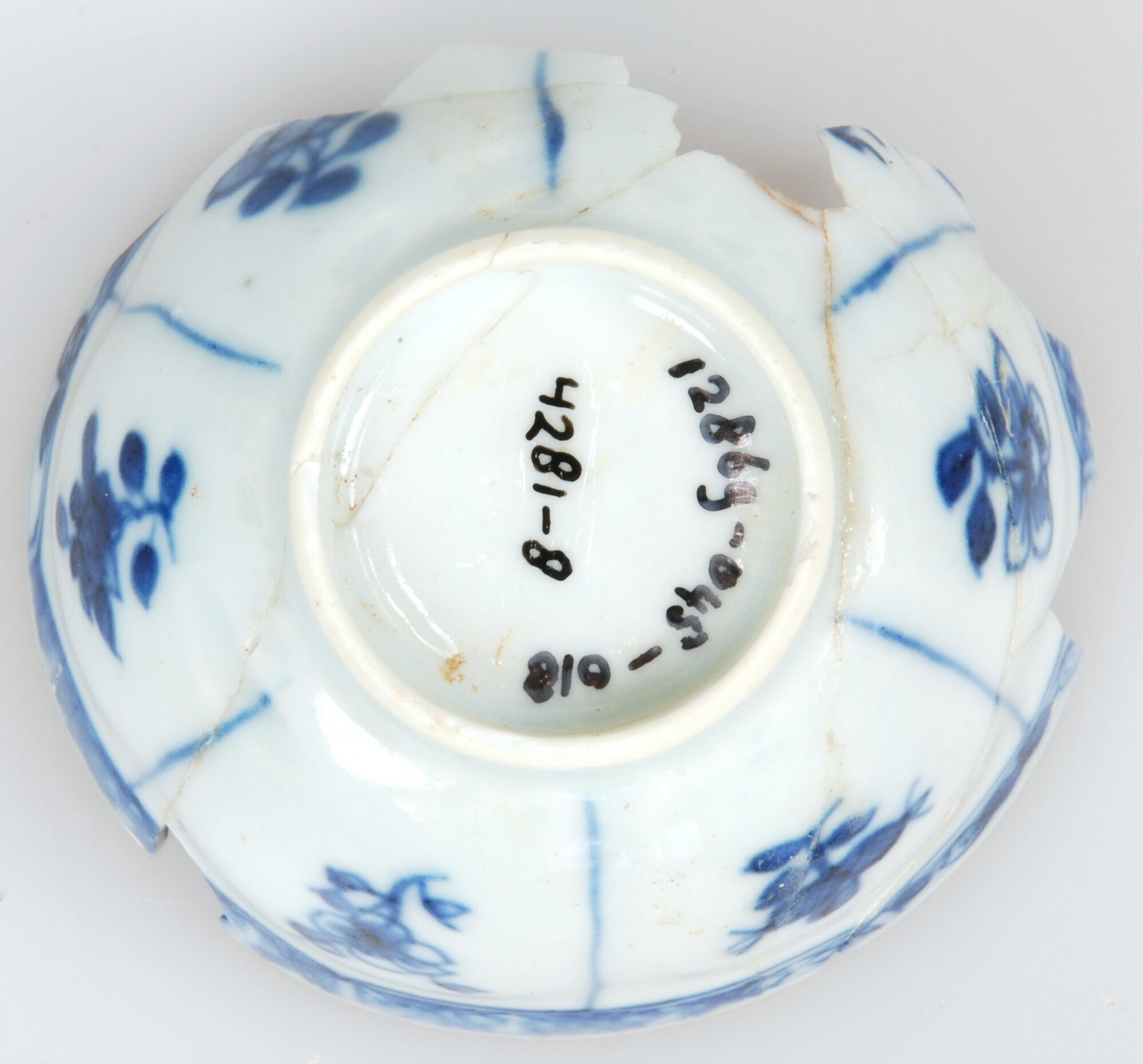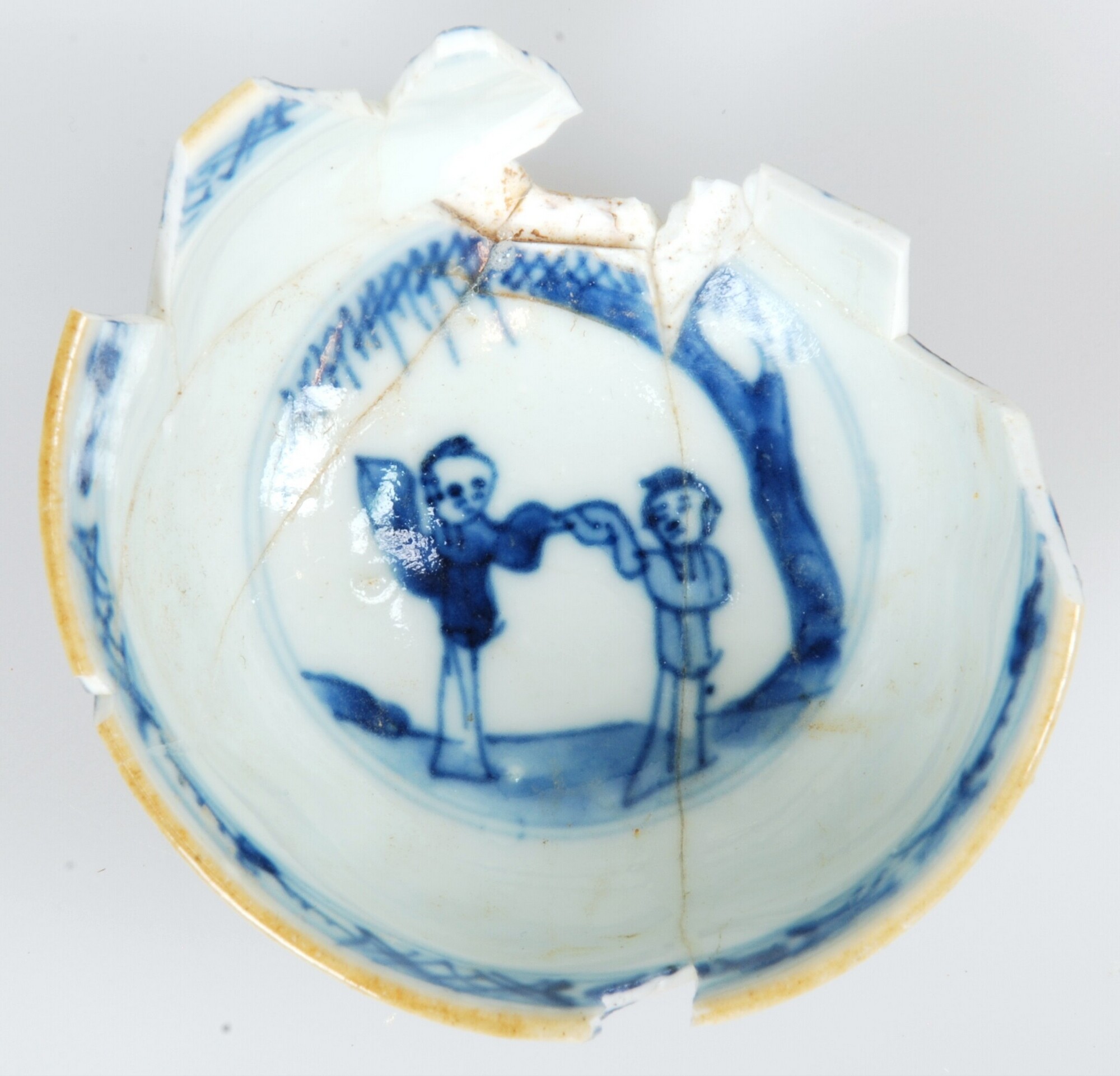 Kop; p-kop-1; kop met iets uitgebogen rand; Aziatisch porselein; veldspaatglazuur; blauwe beschildering: buitenzijde: vakken met bloemen; geometrisch motief onder rand; inwendig: twee dansende of strijdende Chinezen in landschap; geometrische motieven onder rand; 'zeemleer' op rand; standring; herkomst: China