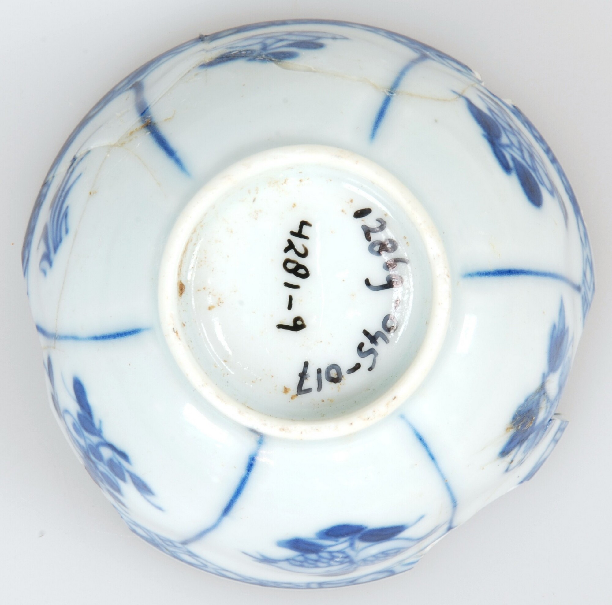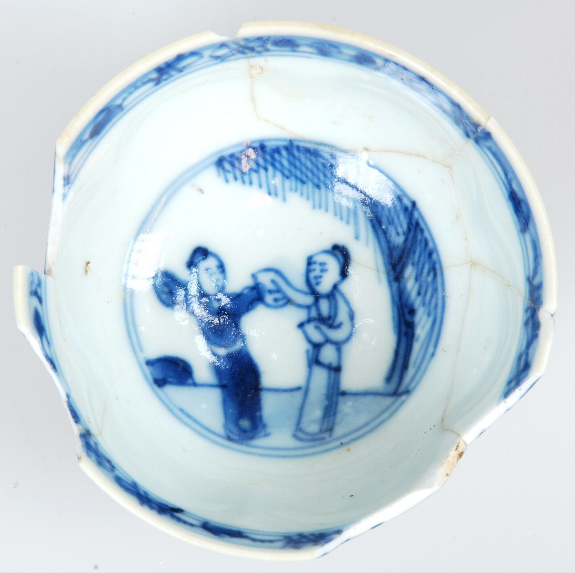 Kop; p-kop-1; kop met iets uitgebogen rand; Aziatisch porselein; veldspaatglazuur; blauwe beschildering: buitenzijde: vakken met bloemen; geometrisch motief onder rand; inwendig: twee dansende of strijdende Chinezen in landschap; geometrische motieven onder rand; 'zeemleer' op rand; standring; herkomst: China