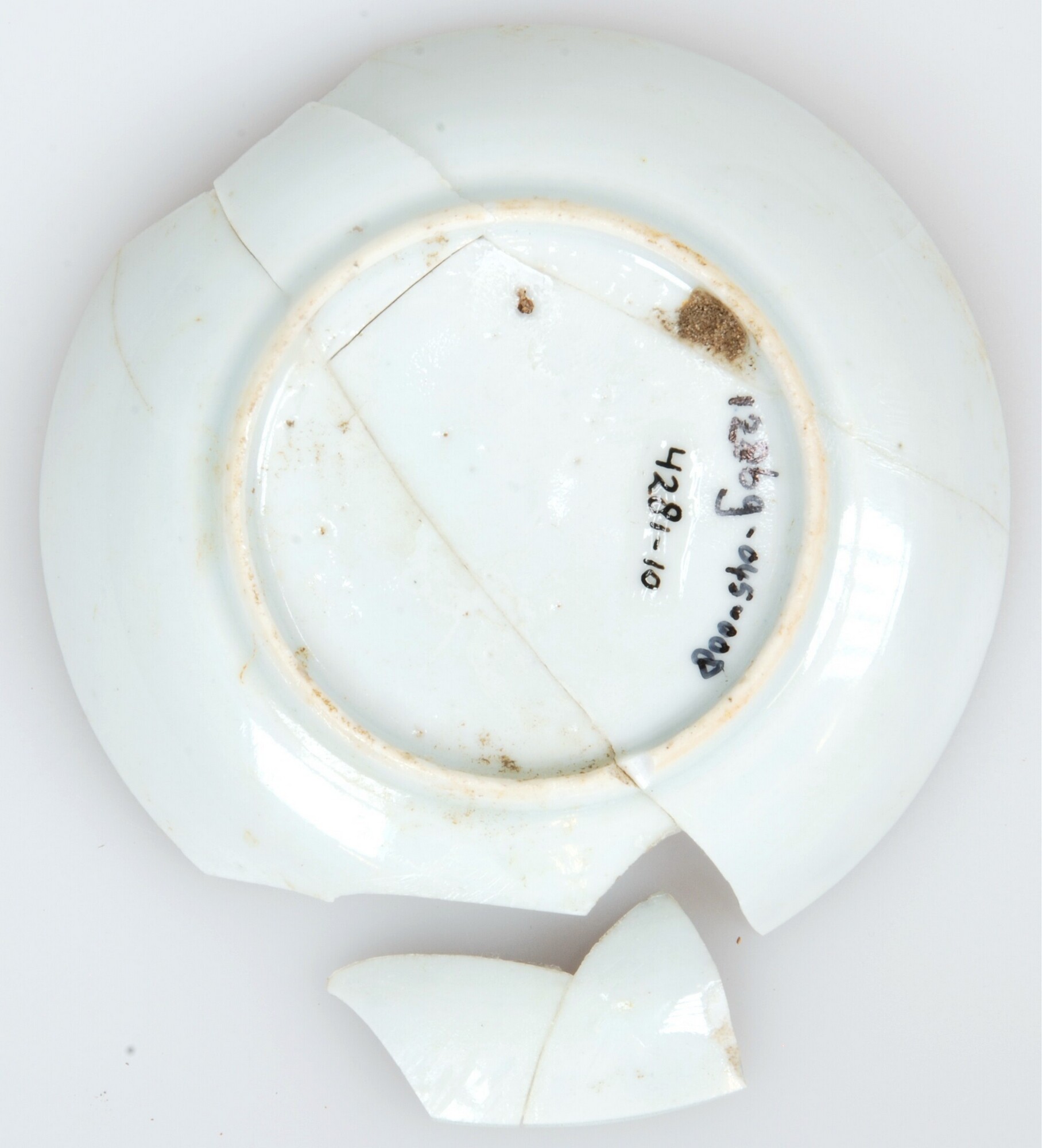 Bord; p-bor-1; klein diep bord zonder vlag met uitgebogen rand; Aziatisch porselein; veldspaatglazuur; blauwe beschildering: spiegel 'zotje' met bal, daaromheen panelen met planten en 'zotjes'; standring; herkomst: China