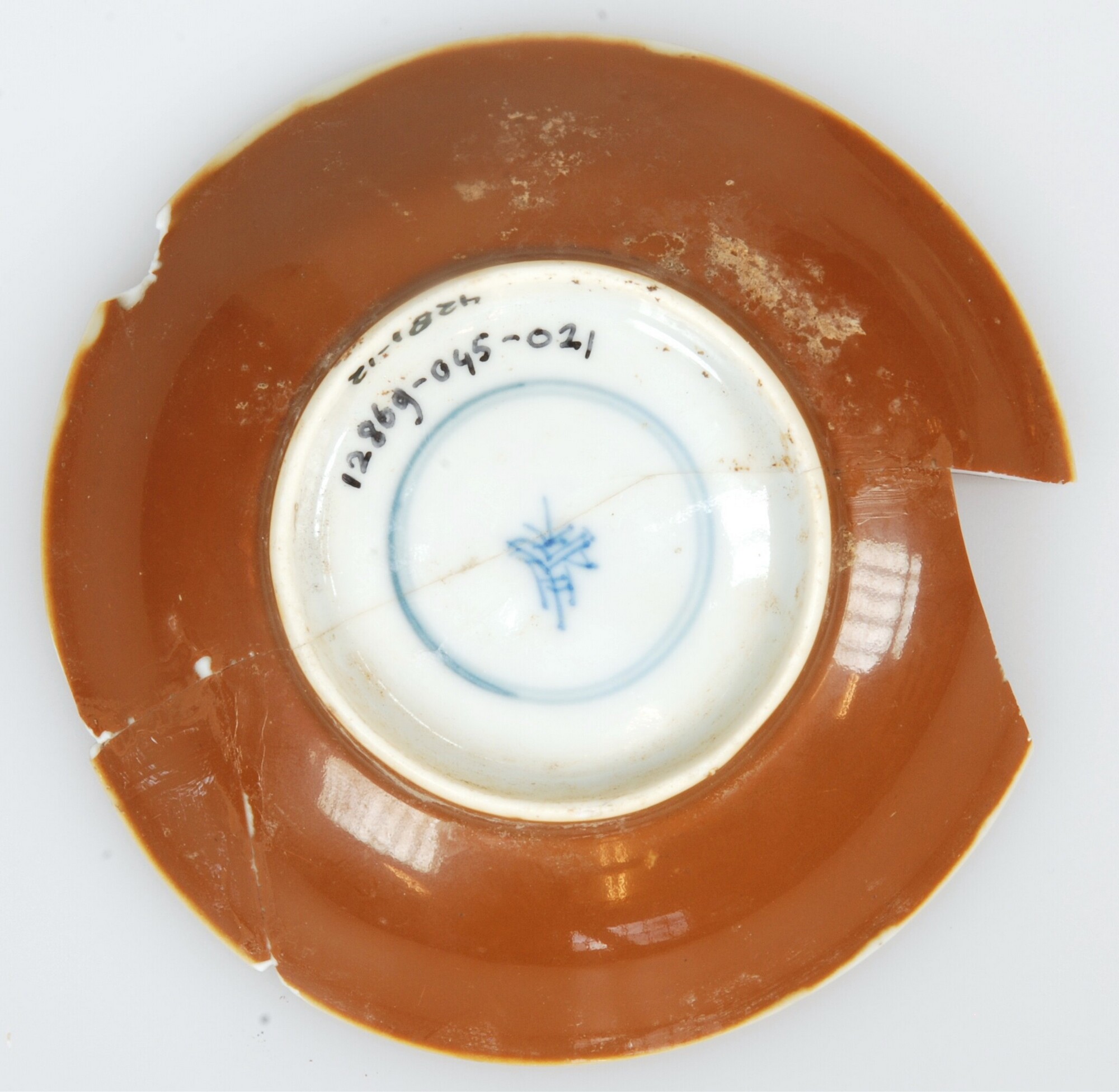 Bord; p-bor-1; klein diep bord zonder vlag met uitgebogen rand; Aziatisch porselein; veldspaatglazuur; blauwe beschildering: gestileerde rozetten en vlinders op bovenzijde, onderzijde bruin; capucijnerwaar; merkteken onderzijde; herkomst: China