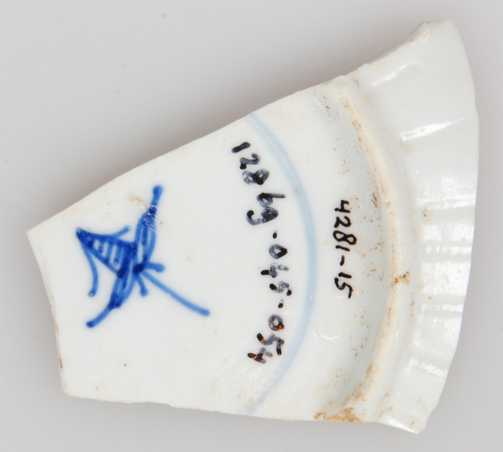 Bord; p-bor-9; klein diep bord zonder vlag en geplooide wand; Aziatisch porselein; veldspaatglazuur; blauwe en rode beschildering; spiegel: centrale chrysant in dubbele cirkel, vlag: kippen en vlinders in bloemen landschap, vlechtwerkrand, onderzijde: Chinees symbool; standring; herkomst: China
