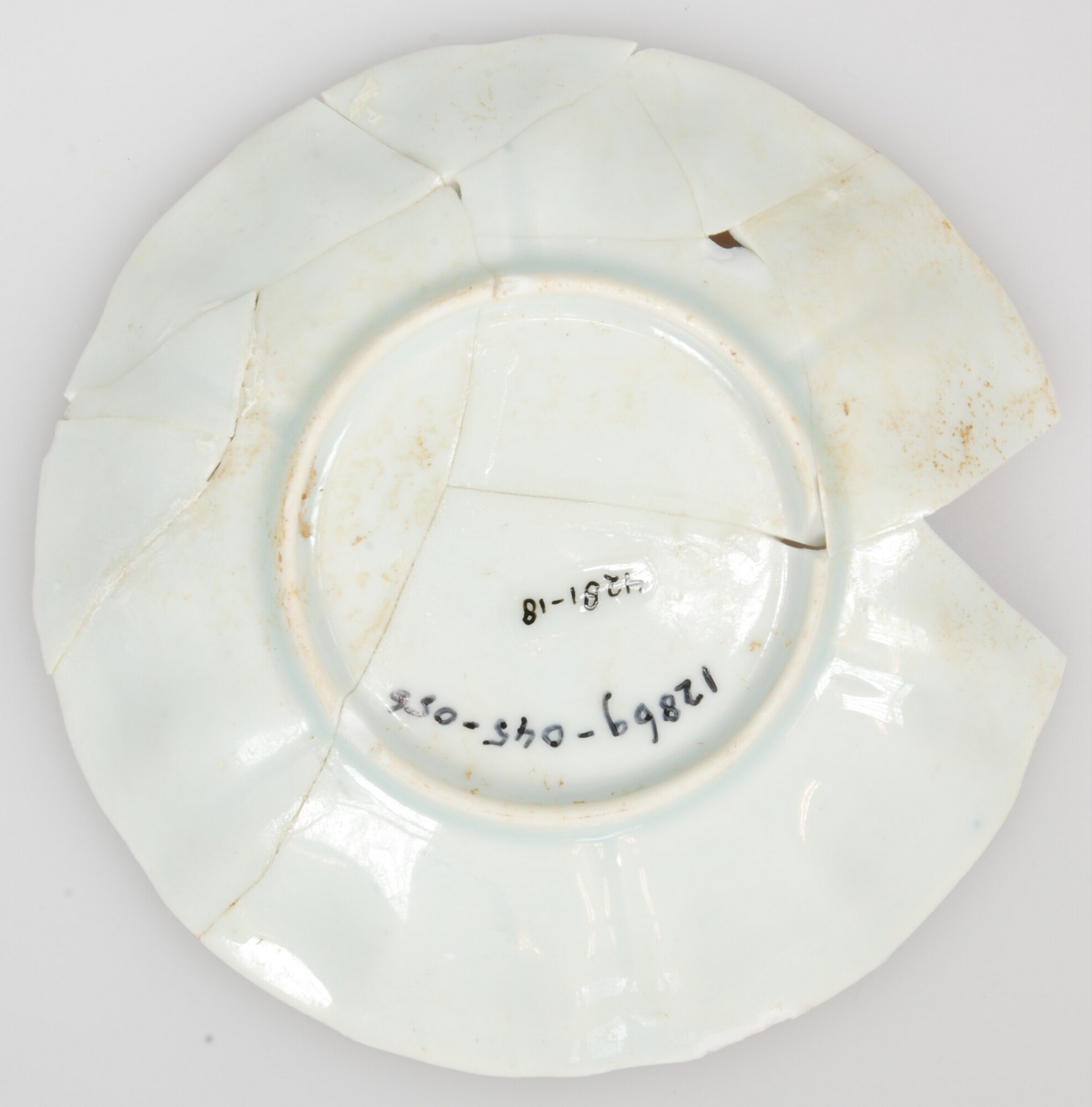 Bord; p-bor-9; klein diep bord zonder vlag en geplooide wand; Aziatisch porselein; veldspaatglazuur; blauwe beschildering: spiegel: hert, vlag: vakverdeling met repeterende bloemenmanden en landschapjes; standring; herkomst: China