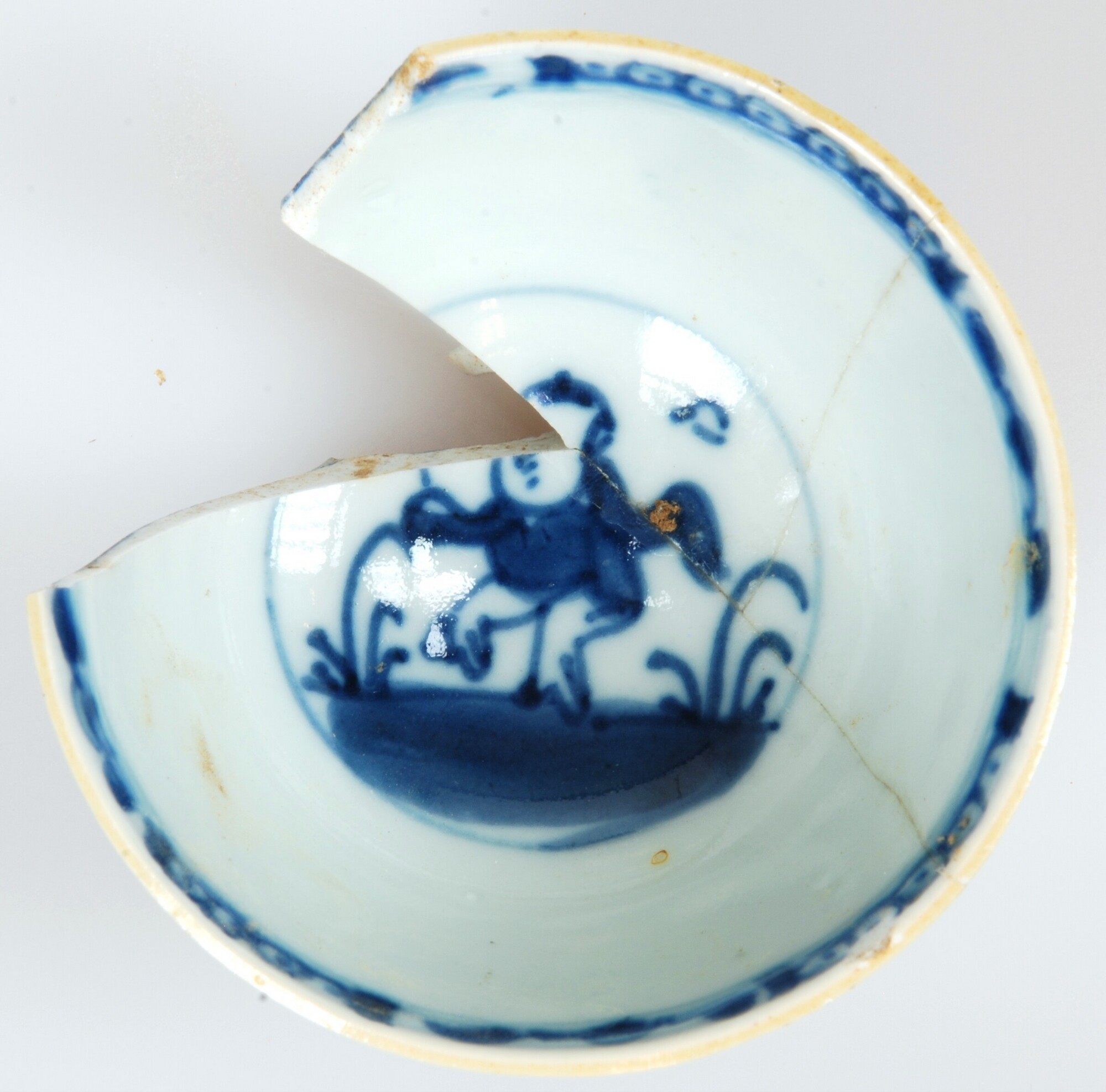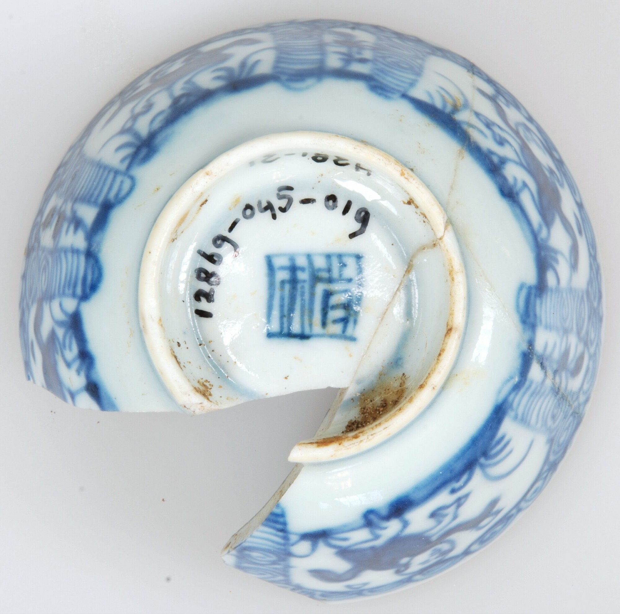 Kop; p-kop-1; kop met iets uitgebogen rand; Aziatisch porselein; veldspaatglazuur; blauwe beschildering: buitenzijde: panelen met 'zotjes' met bal; inwendig: zotje met bal, parelrand; 'zeemleer' op rand; standring; herkomst: China