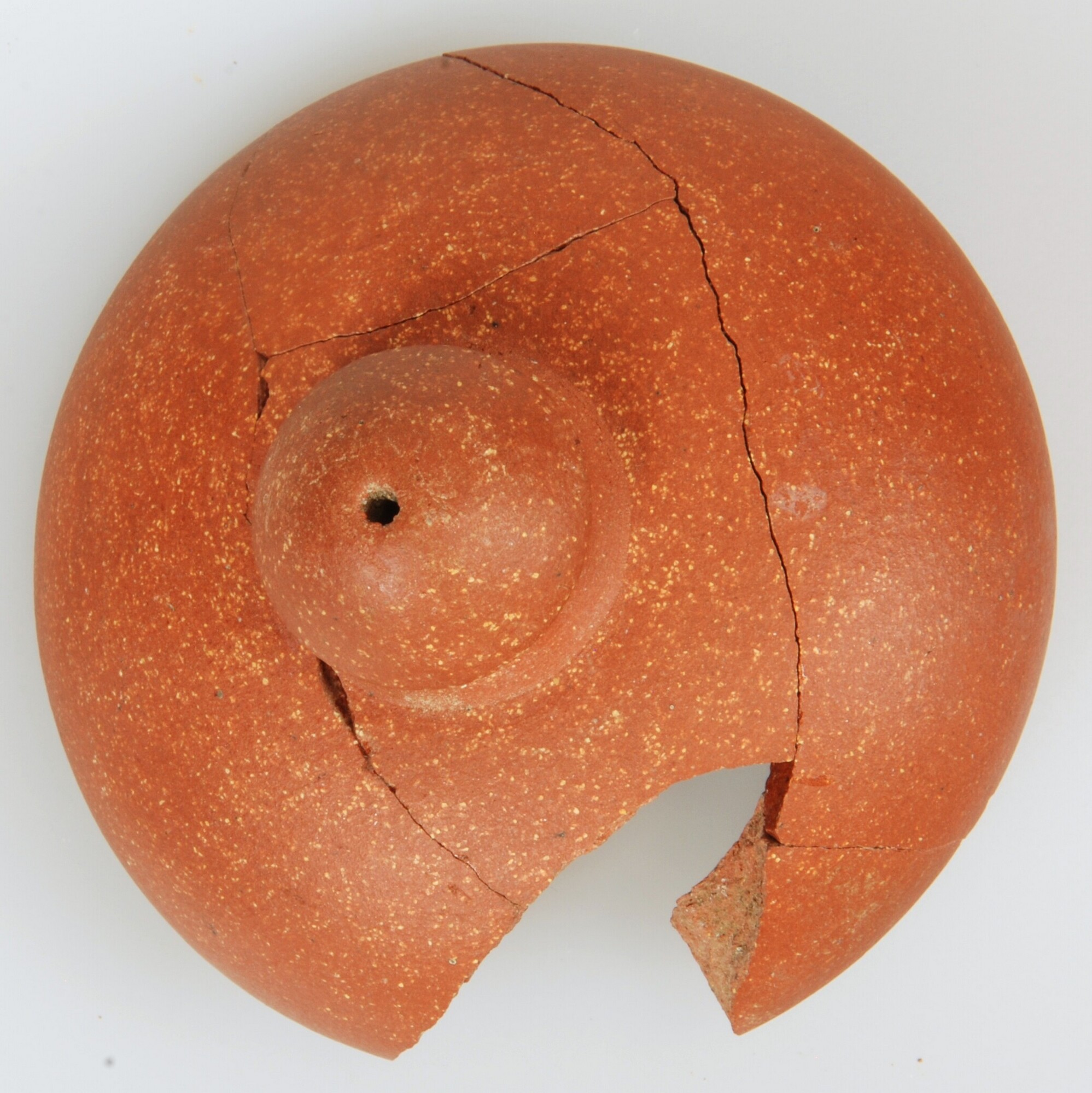 Deksel; ir-dek-2; bol deksel met sluitrand en bolle knop; Aziatisch rood steengoed; gaatje in knop; herkomst: Yixing, China