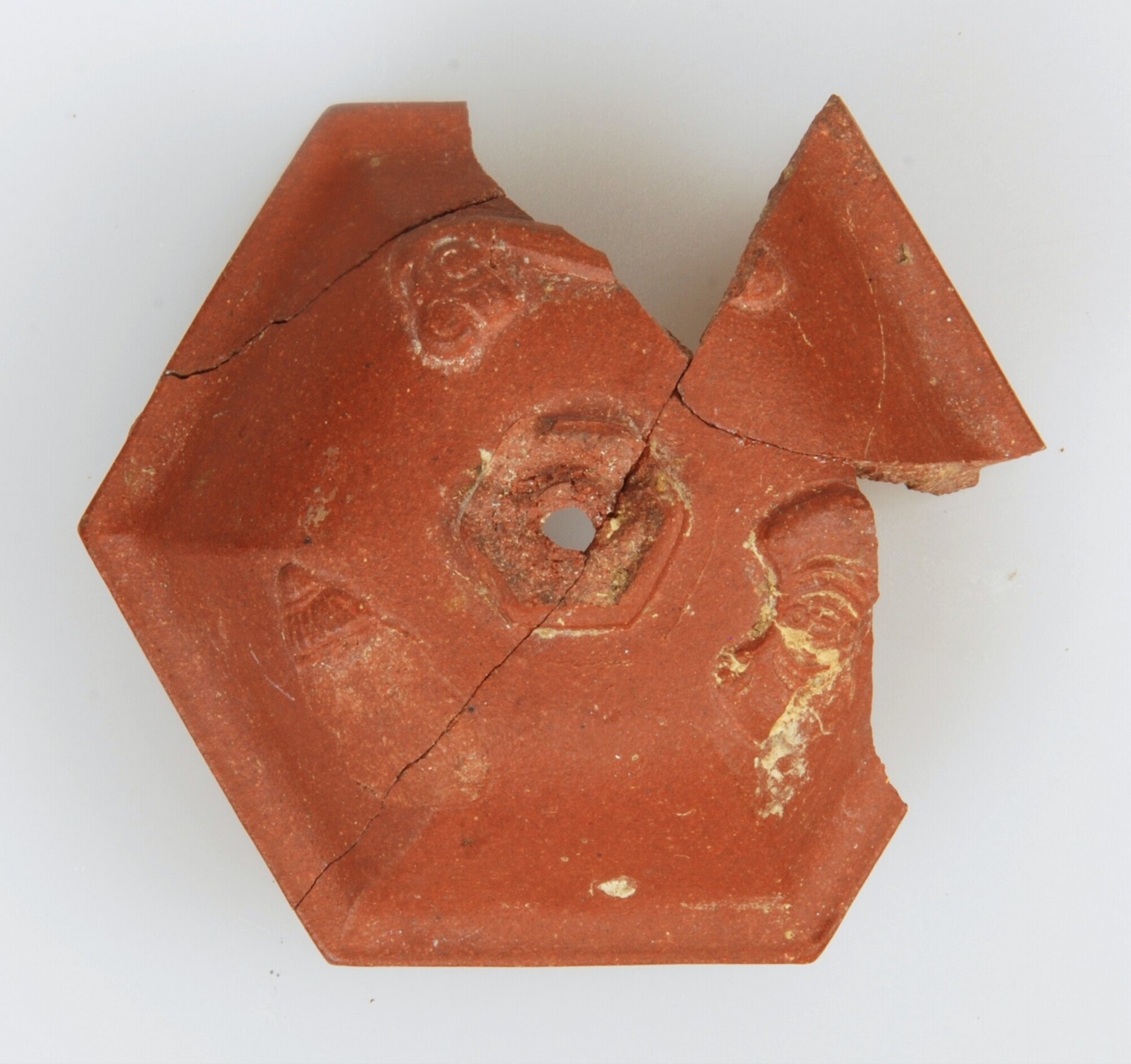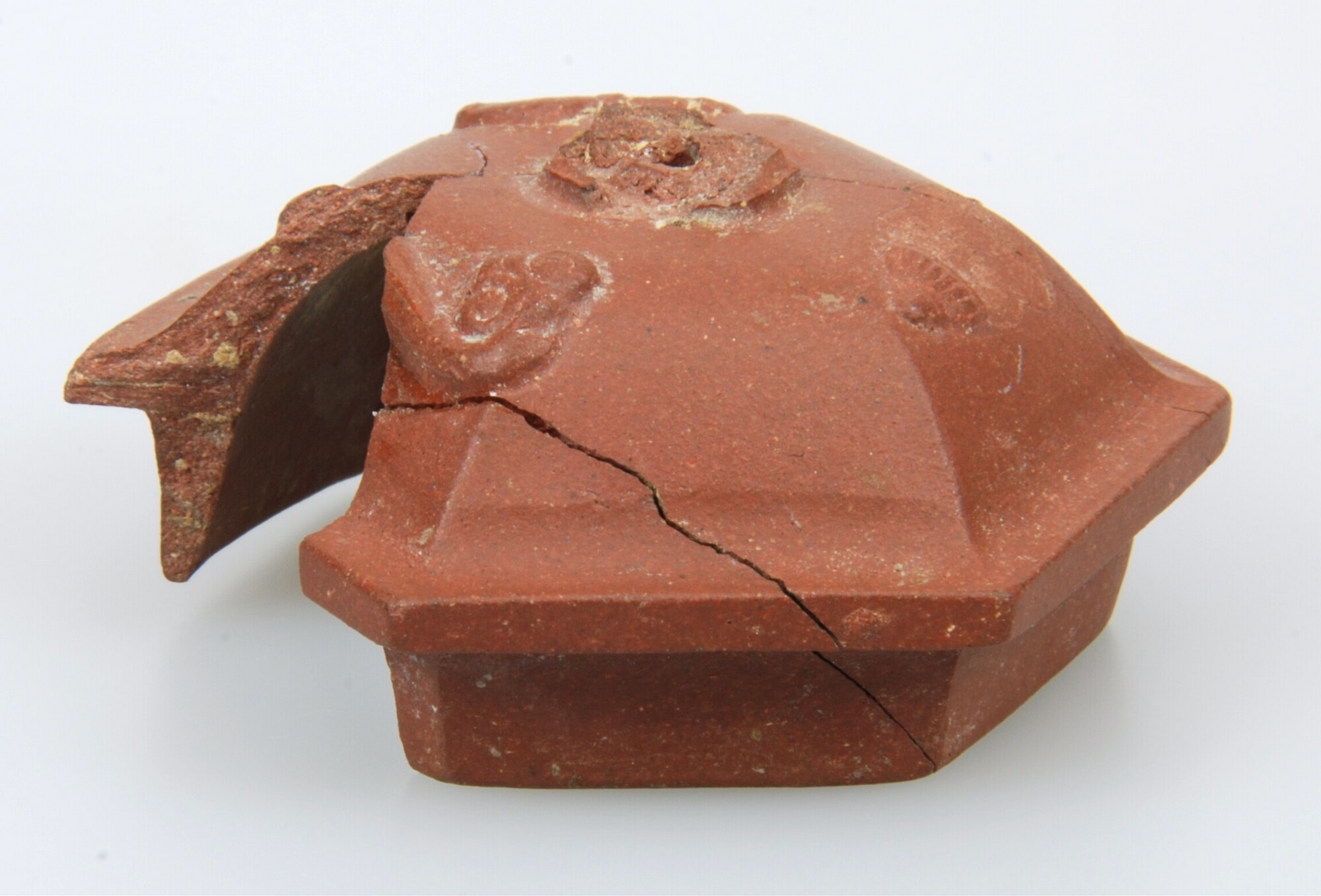 Deksel; ir-dek-; meerhoekig deksel met sluitrand en knop (ontbreekt); Aziatisch rood steengoed; resten van appliques; gaatje in knop; herkomst: Yixing, China