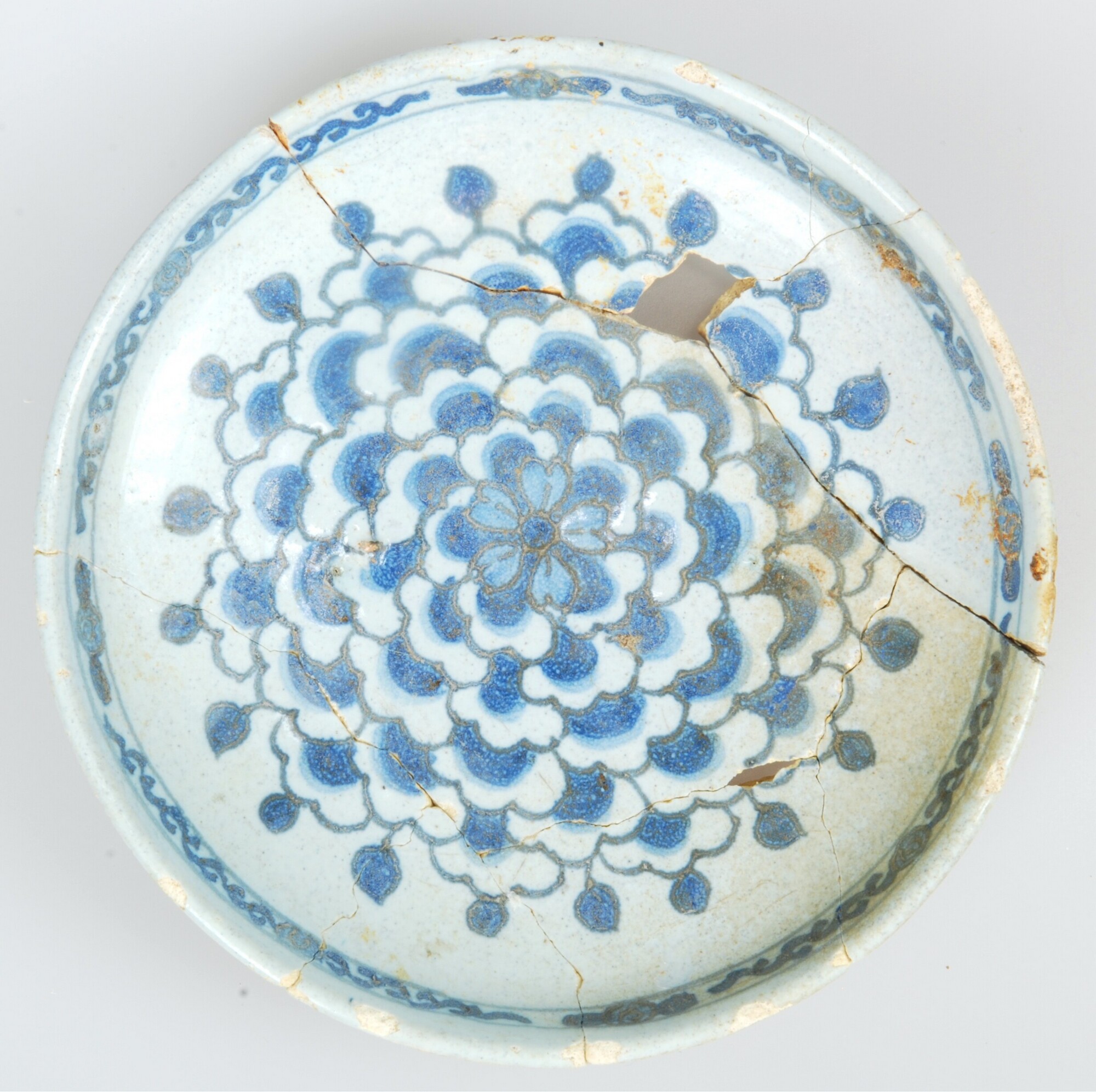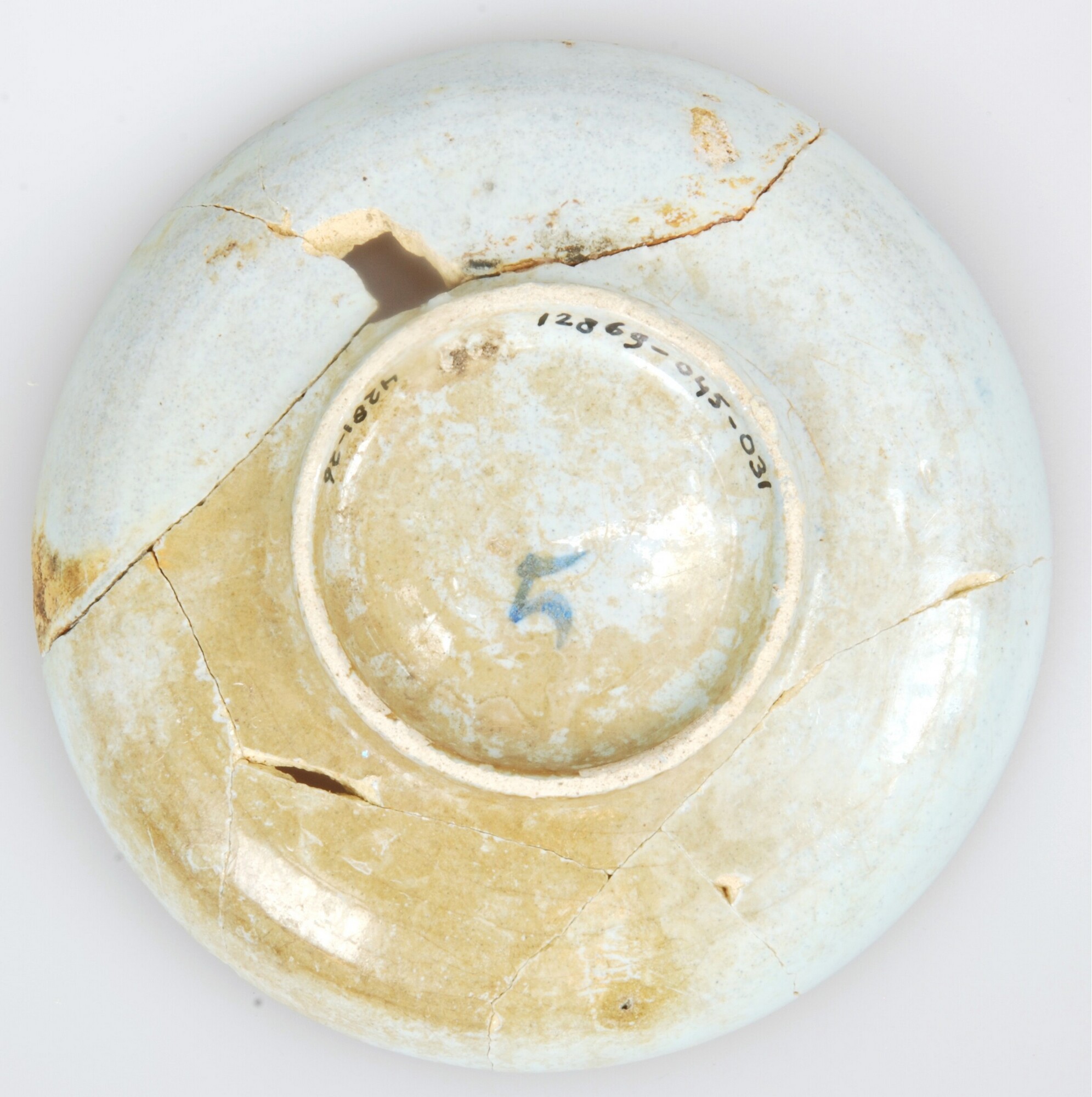 Bord; f-bor-8; diep afgerond bord met rechte rand; Nederlandse faience; tinglazuur; blauwe beschildering: rozet, takjes binnen dubbele cirkel op rand; standring; onderzijde gemerkt binnen standring: '5'