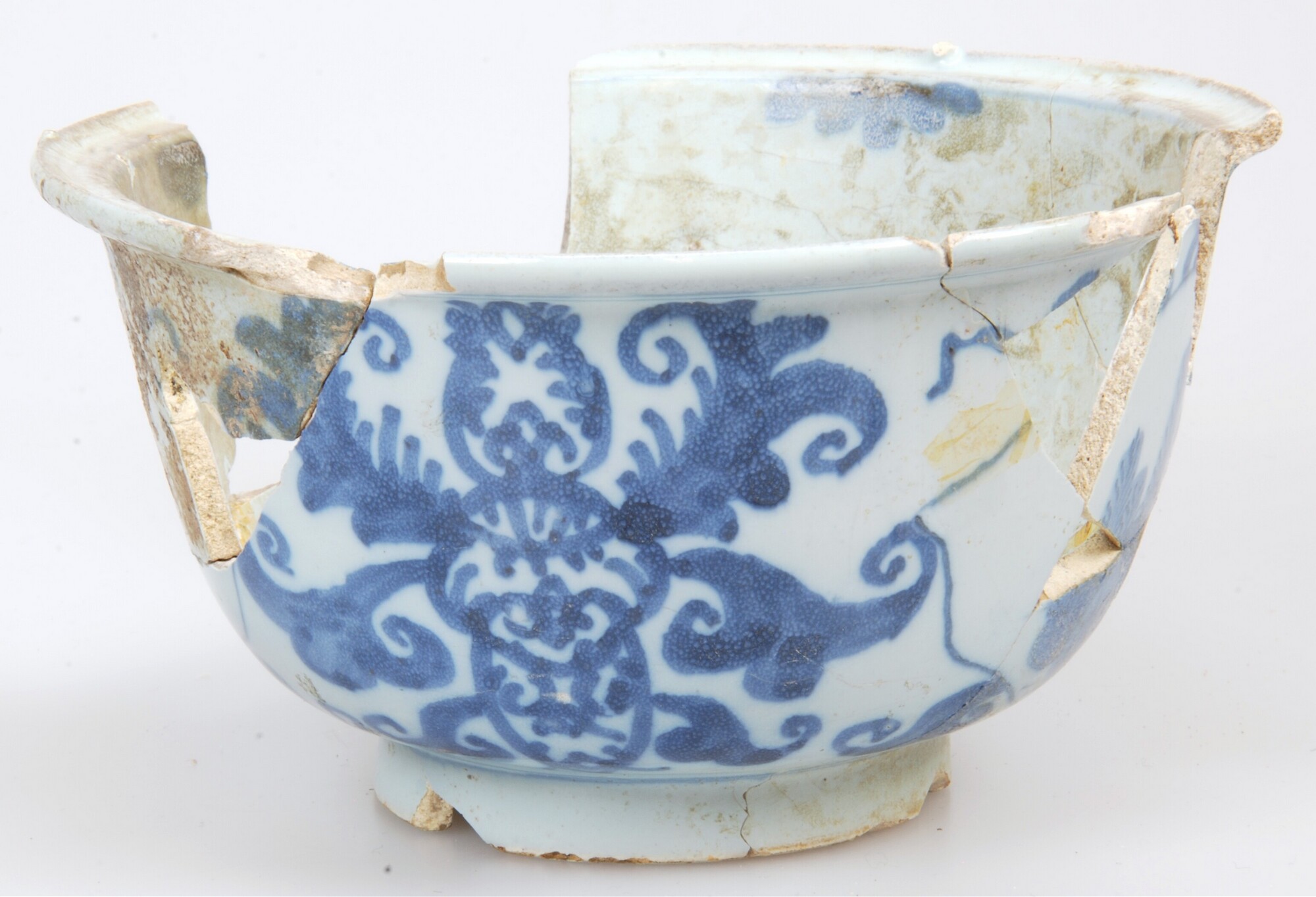 Kom; i-kom-803; diepe kom met uitgebogen opstaande rand; Italiaans faience; boven- en onderzijde tinglazuur; donkerblauw op lichtblauw: inw. gearceerd vlak binnen dubbele cirkel, bladlobben op rand; uitw. heraldische motieven, afgewisseld met cartouches met 'Toscaanse' landschapjes; standring; herkomst: Italië, Toscane ?