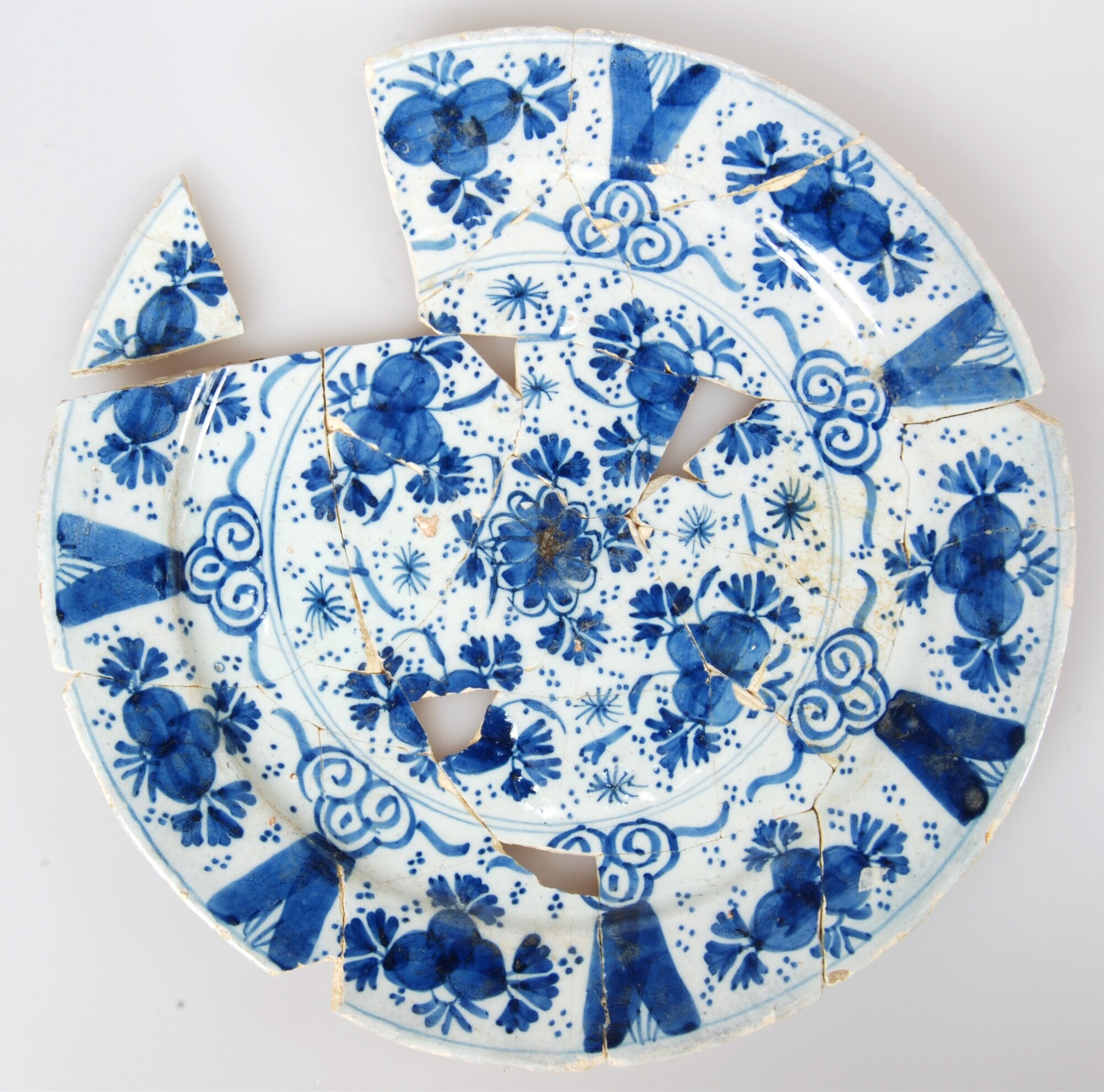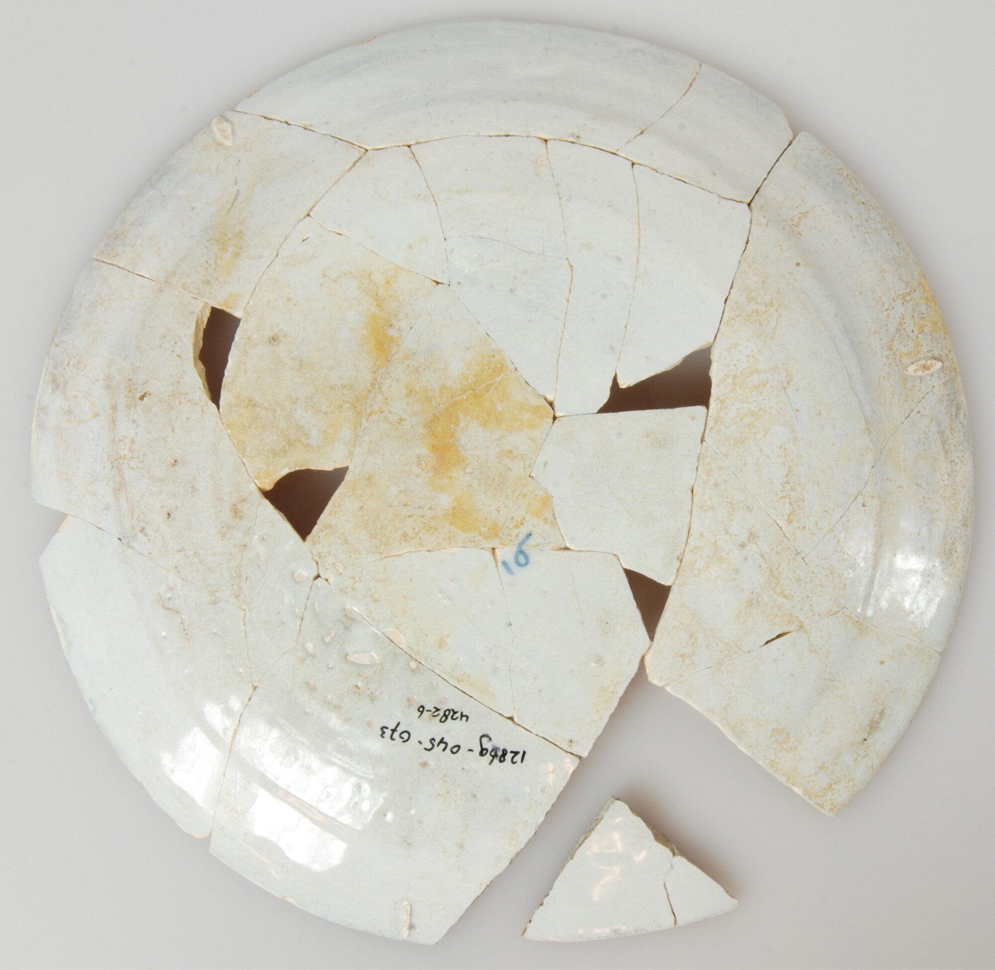Bord; f-bor-5; faience; tinglazuur; blauw op wit: strooibloemen; standvlak; archeologisch compleet, onderzijde gemerkt: '16'; herkomst: Nederland