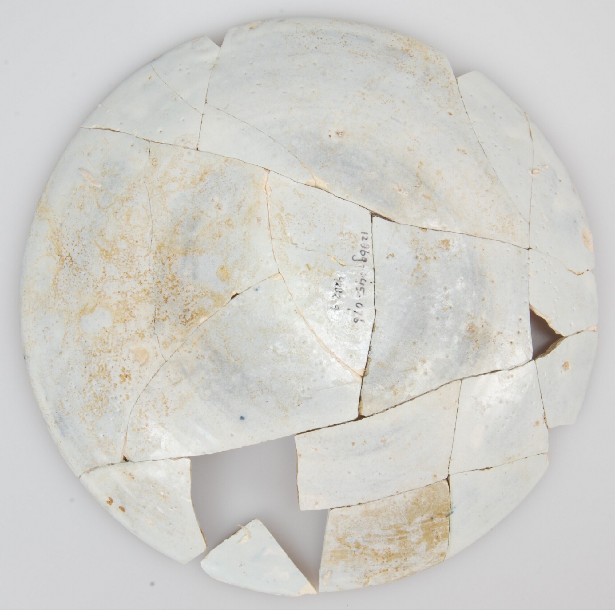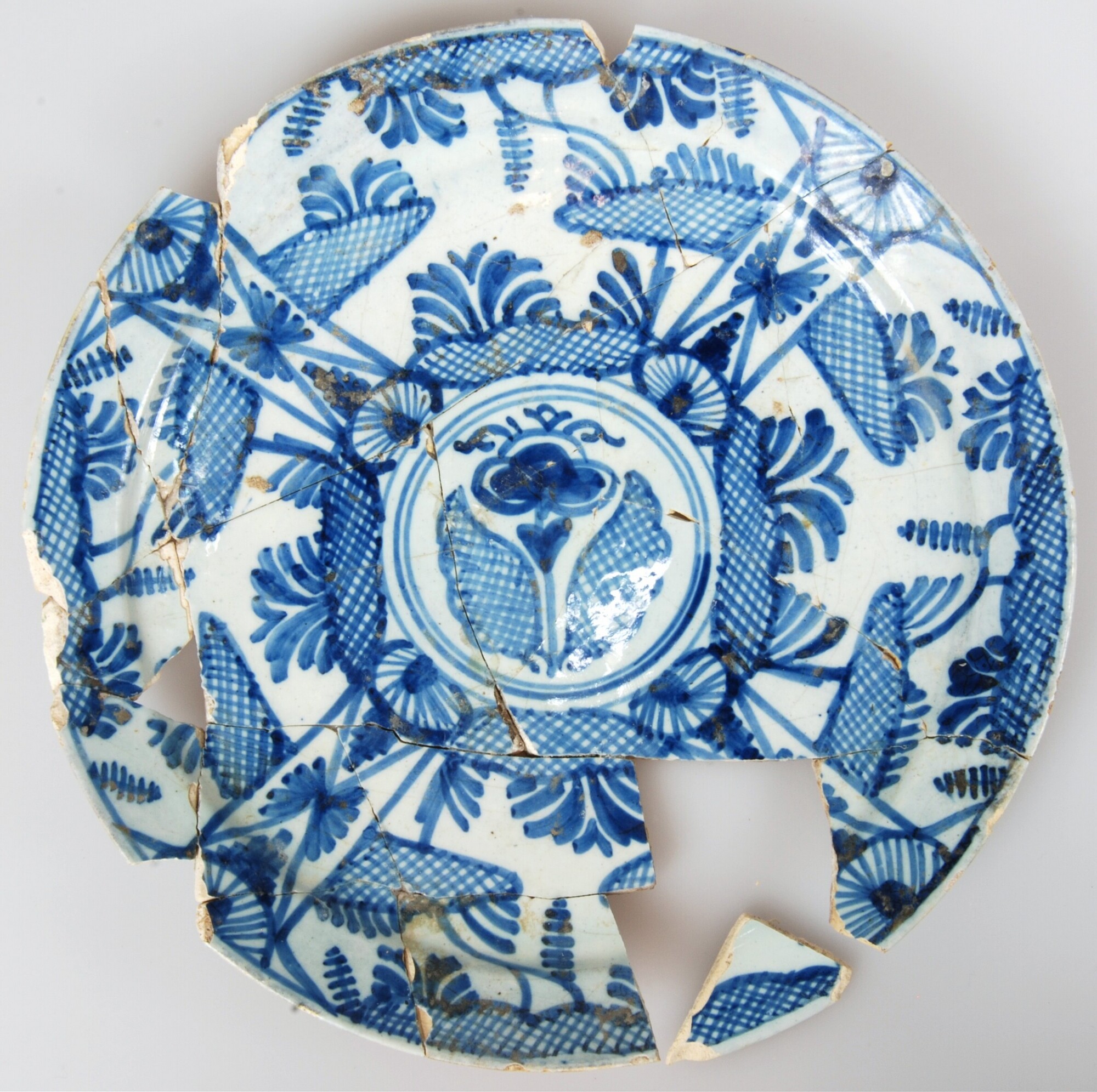 Bord; f-bor-5; faience; tinglazuur; blauw op wit: centrale bloem binnen dubbele cirkel, daaromheen servetwerk en bladerranken; standvlak; archeologisch compleet; herkomst: Nederland; 1 los randfragment (past niet aan bord)