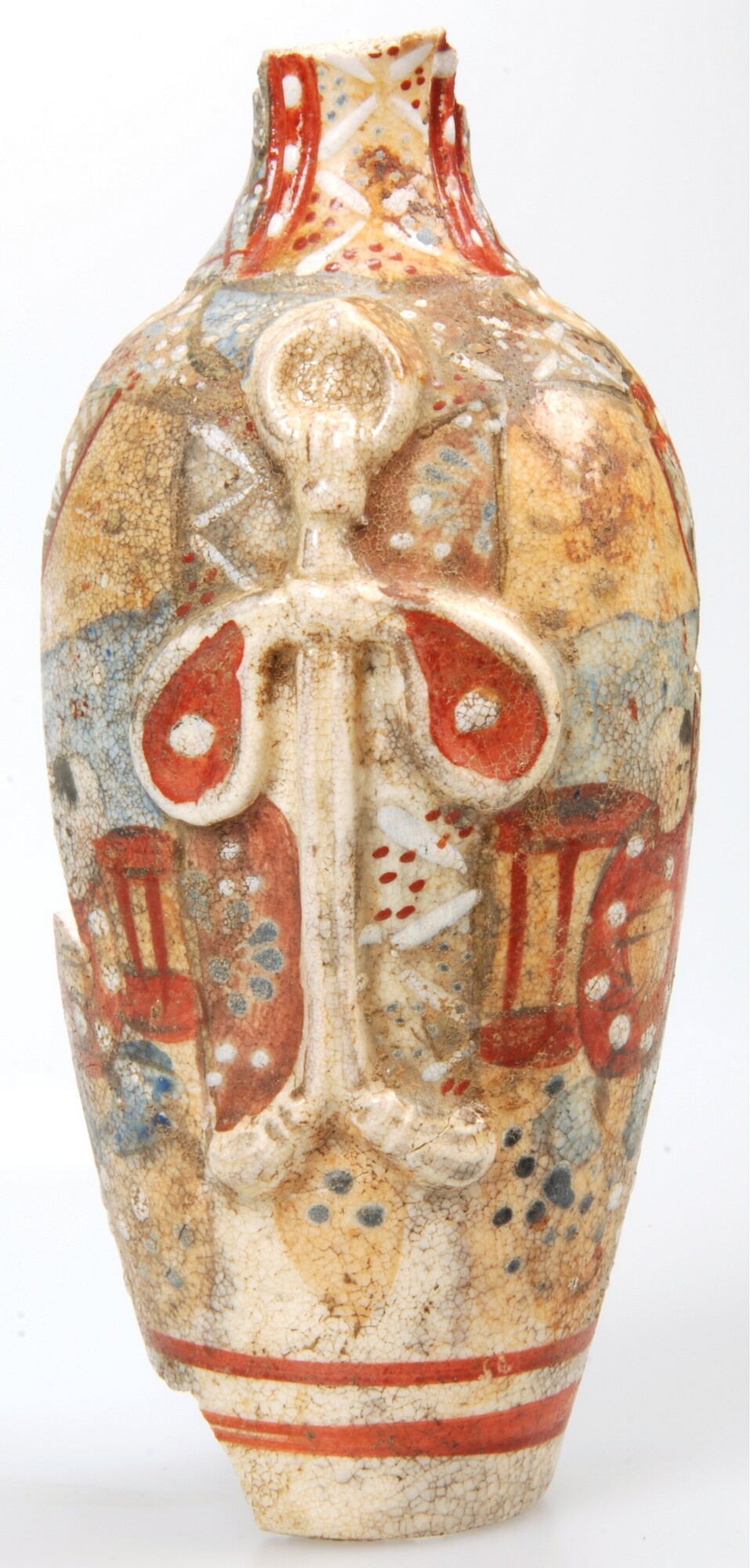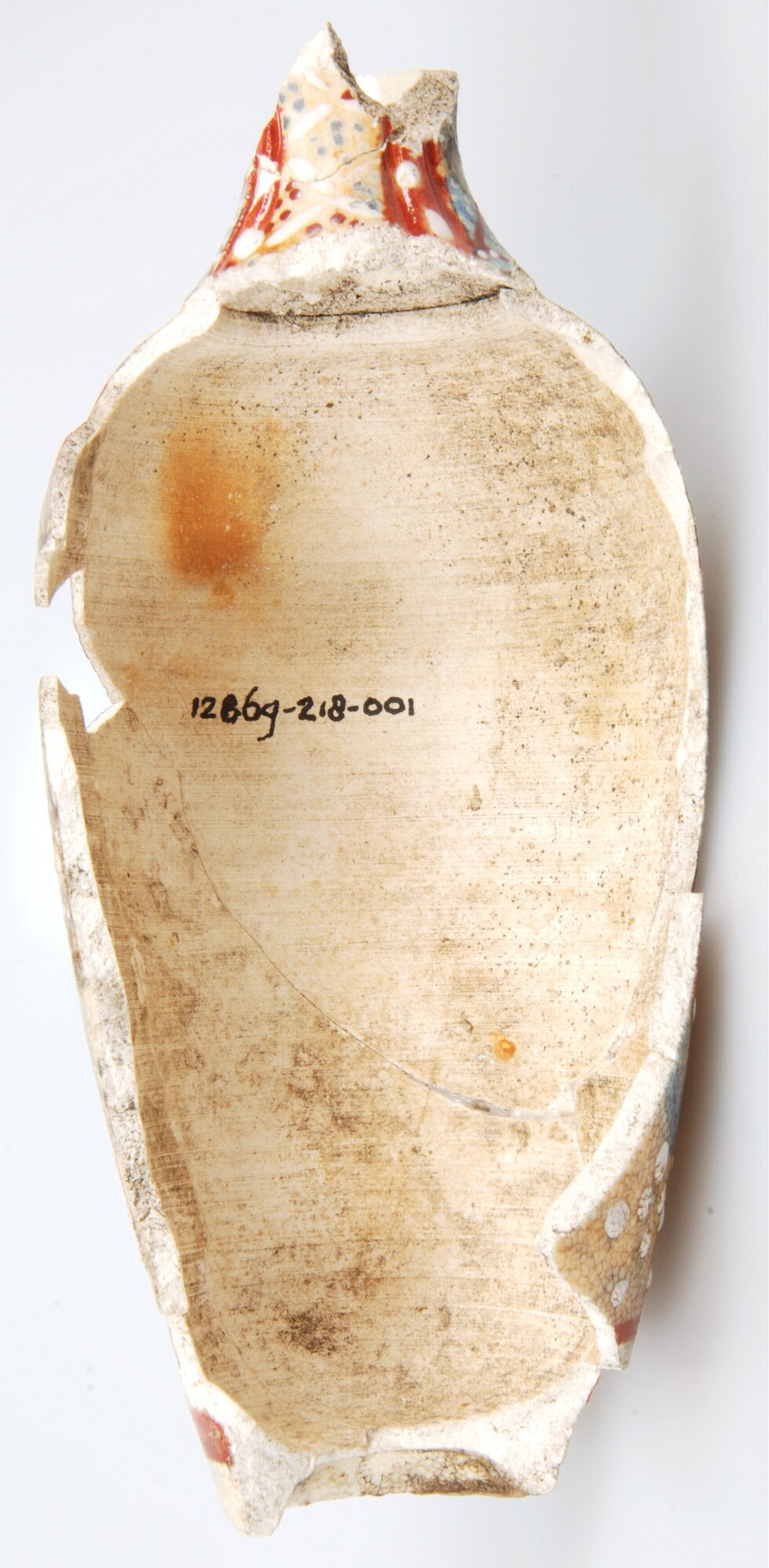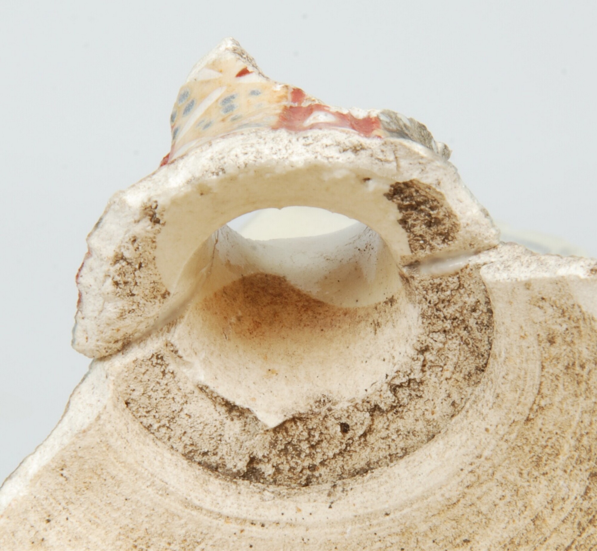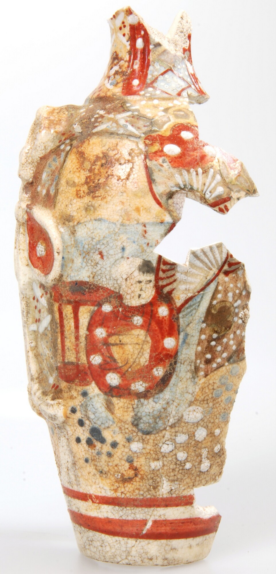 Vaas; s6-vaa; Aziatisch steengoed (Satsuma); zoutglazuur; symbool-applique en (in rood/wit/blauw) beschildering met personen; uitgeschraapt standvlak; hals ontbreekt; herkomst: Japan