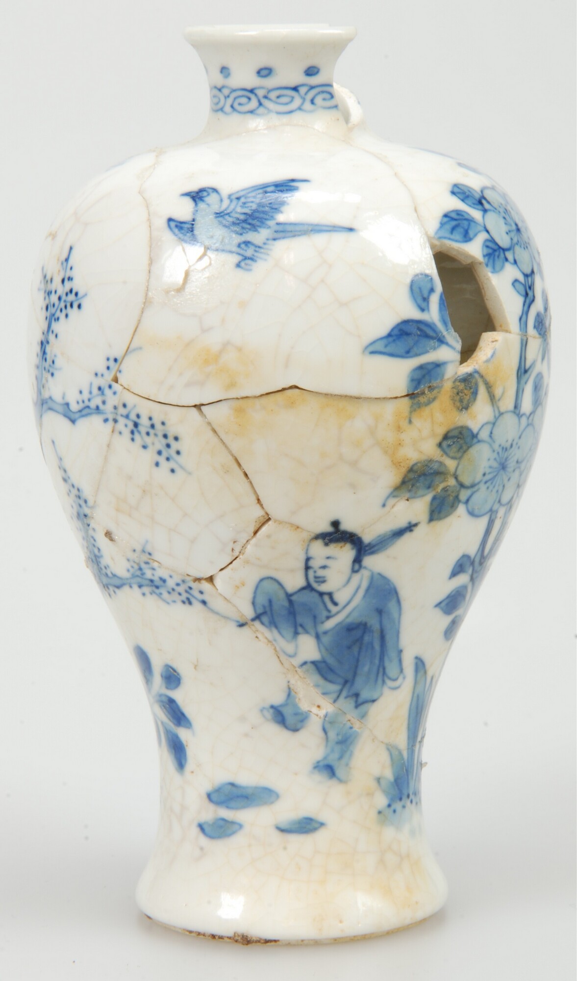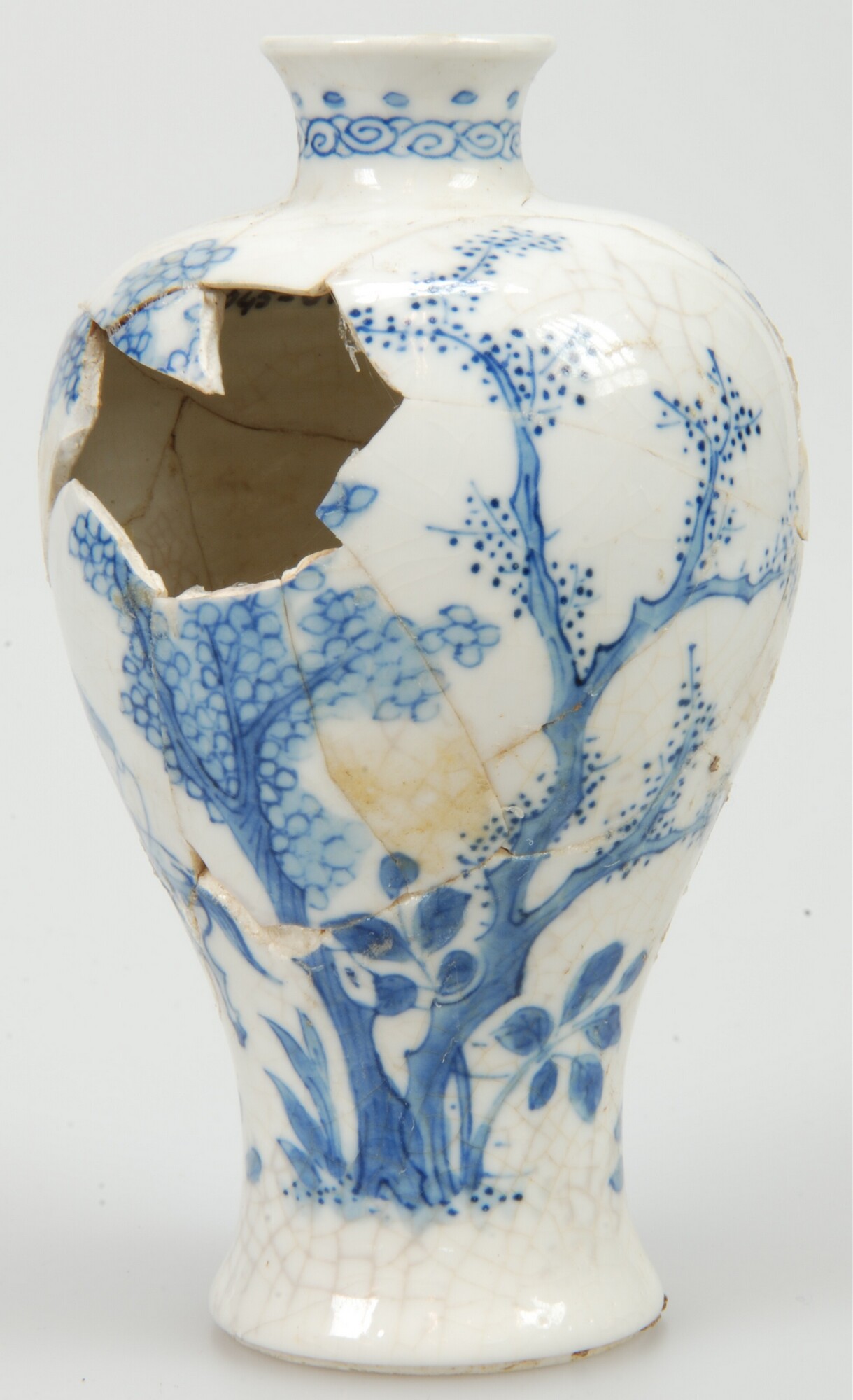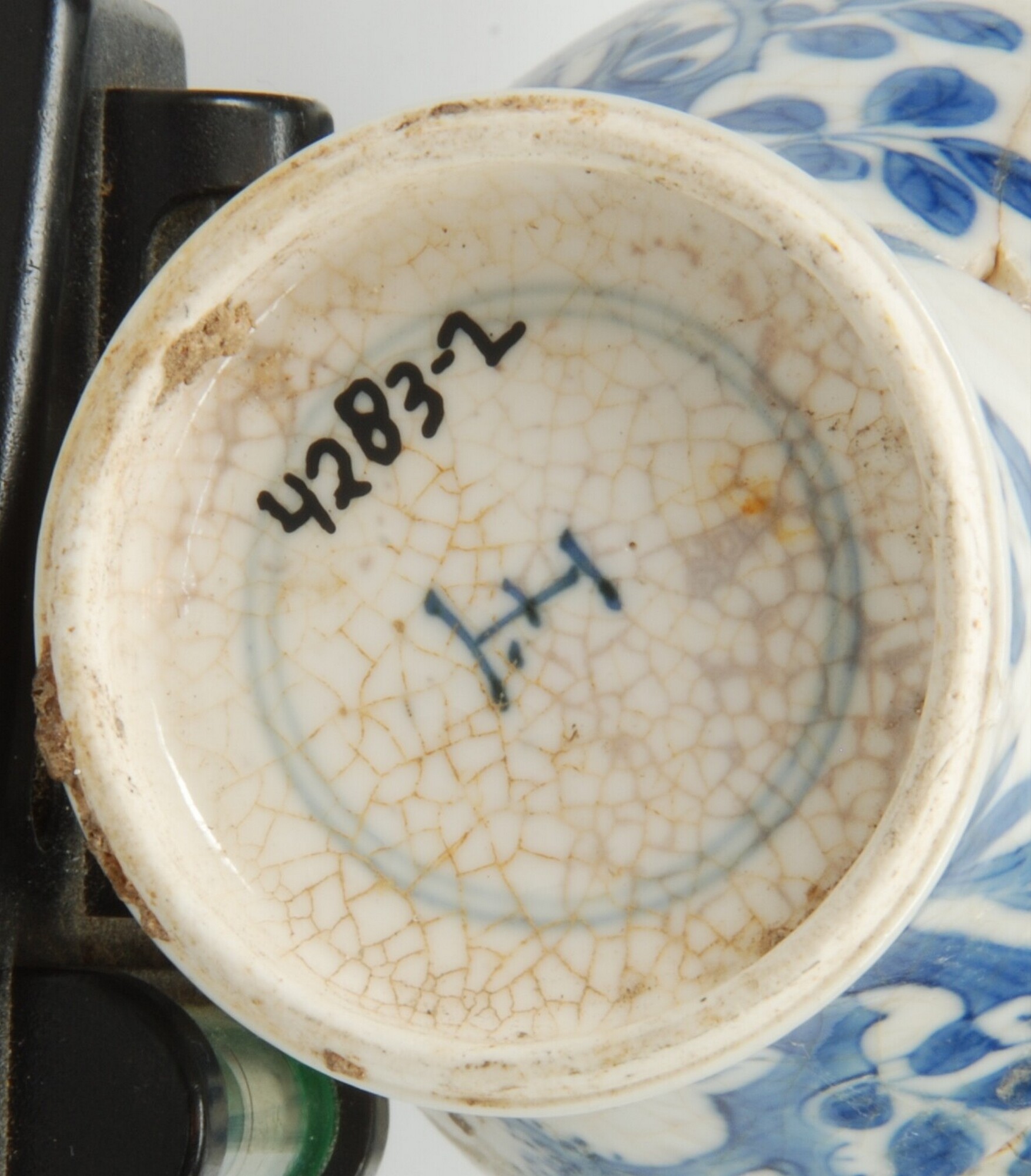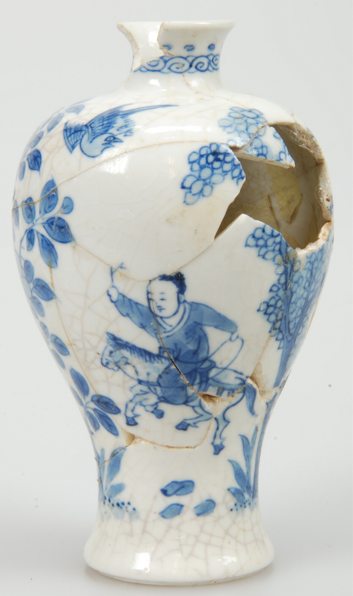 Vaas; p-vaa-; balustervormige vaas met smalle uitstaande rand, standring; Aziatisch porselein (Kangxi-periode; soft-paste porcelain); veldspaatglazuur; onderglazuur blauwe beschildering: ruiter en figuur met parasol in landschap met bomen en vliegende vogel, band van krulmotieven en stippen langs rand; bodem: schildersmerk binnen dubbele cirkel; opvallende craquelé in glazuur; herkomst: Jingdezhen, China