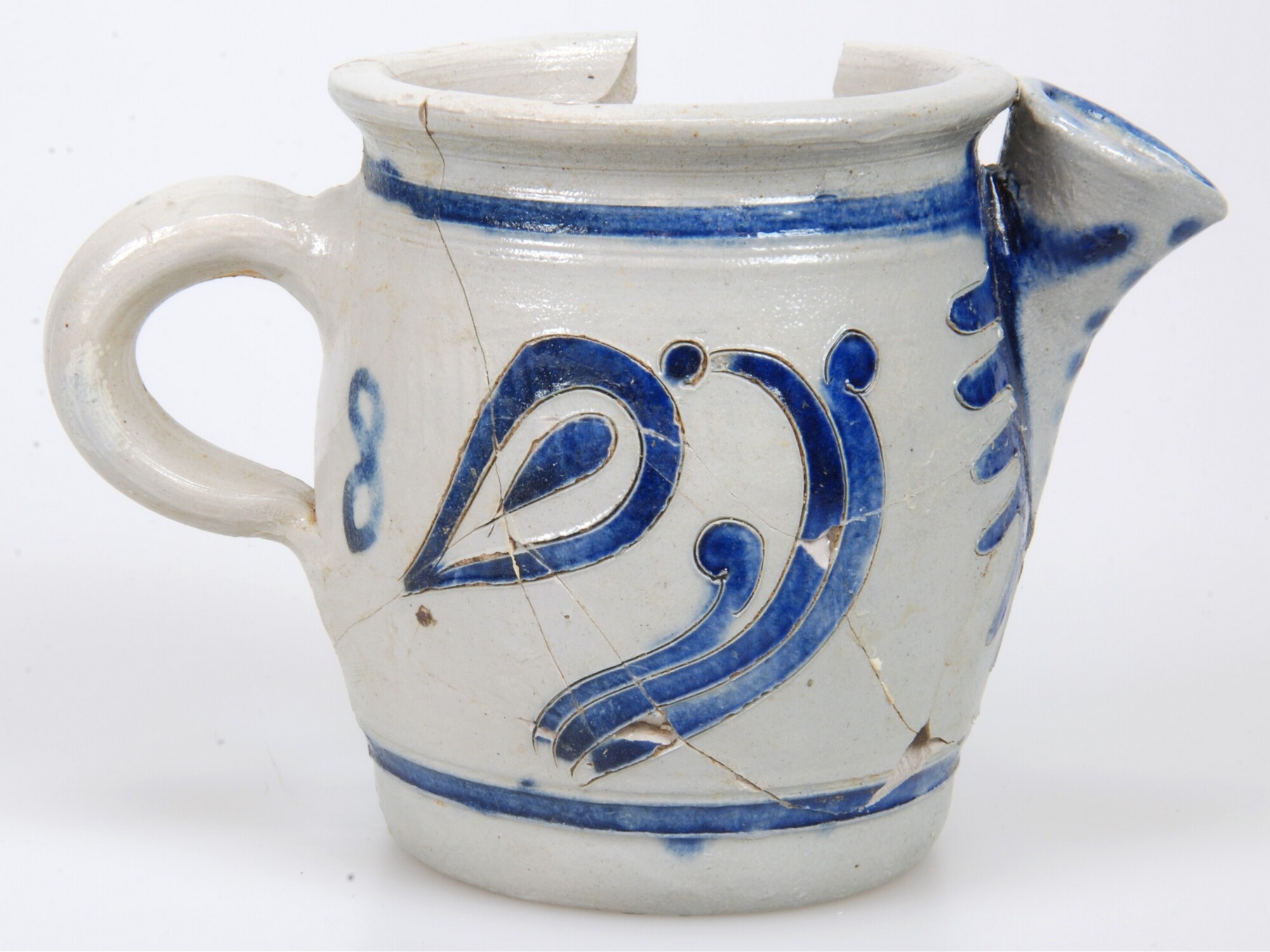 Schenkpot; s2-pot-10; steengoed; zoutglazuur/kobaltoxide; ingesneden versiering met blauwe invulling, cijfer 8 naast oor; standvlak; 1 verticaal lintoor, schenktuit tegenover oor; archeologisch compleet; herkomst: Westerwald