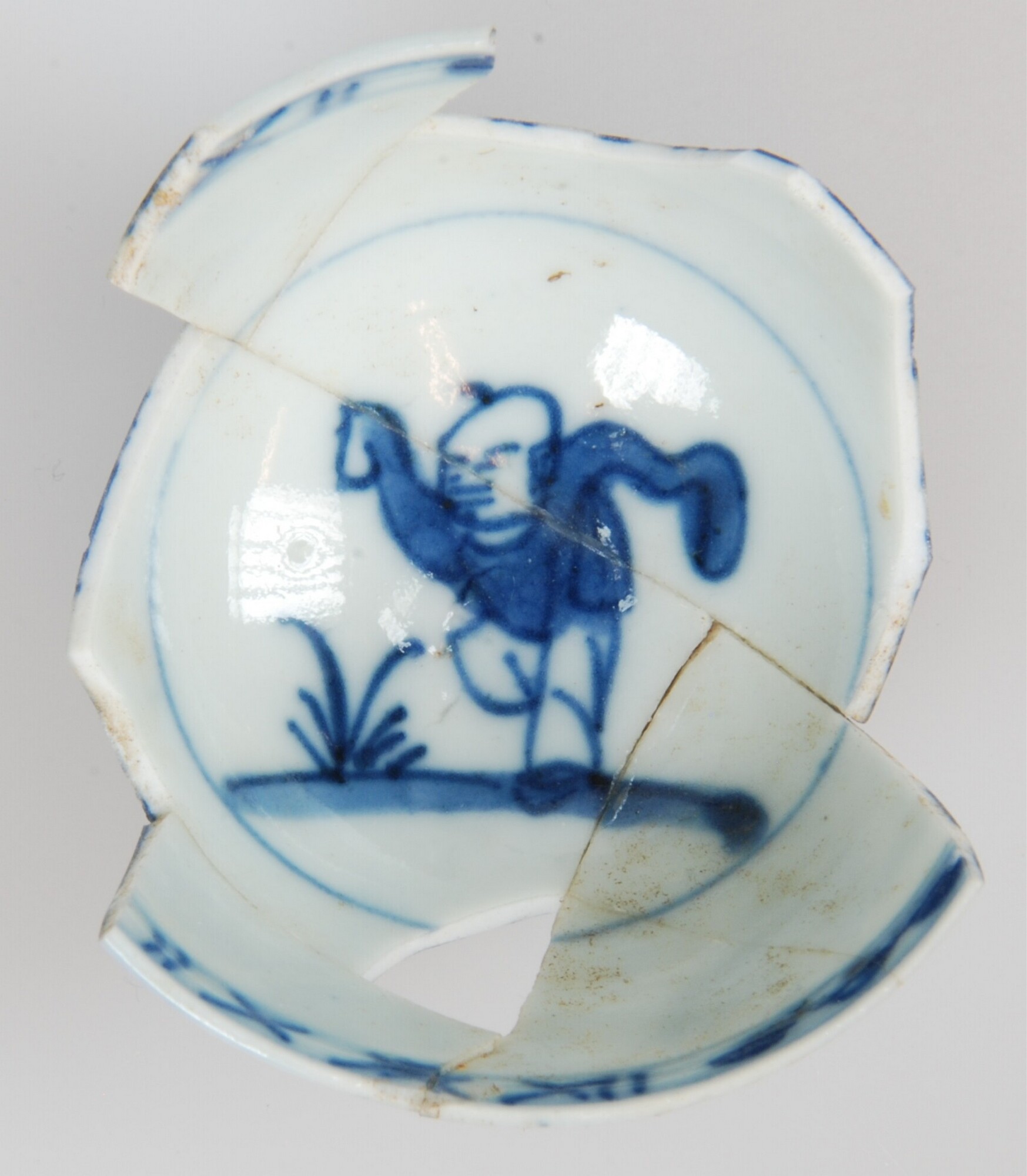 Kop; p-kop-4; porselein; veldspaatglazuur/kobaltoxide; onderglazuur blauw: 4 panelen met 'zotjes' op buitenzijde; 1 'zotje' op bodem; profiel compleet; herkomst: China