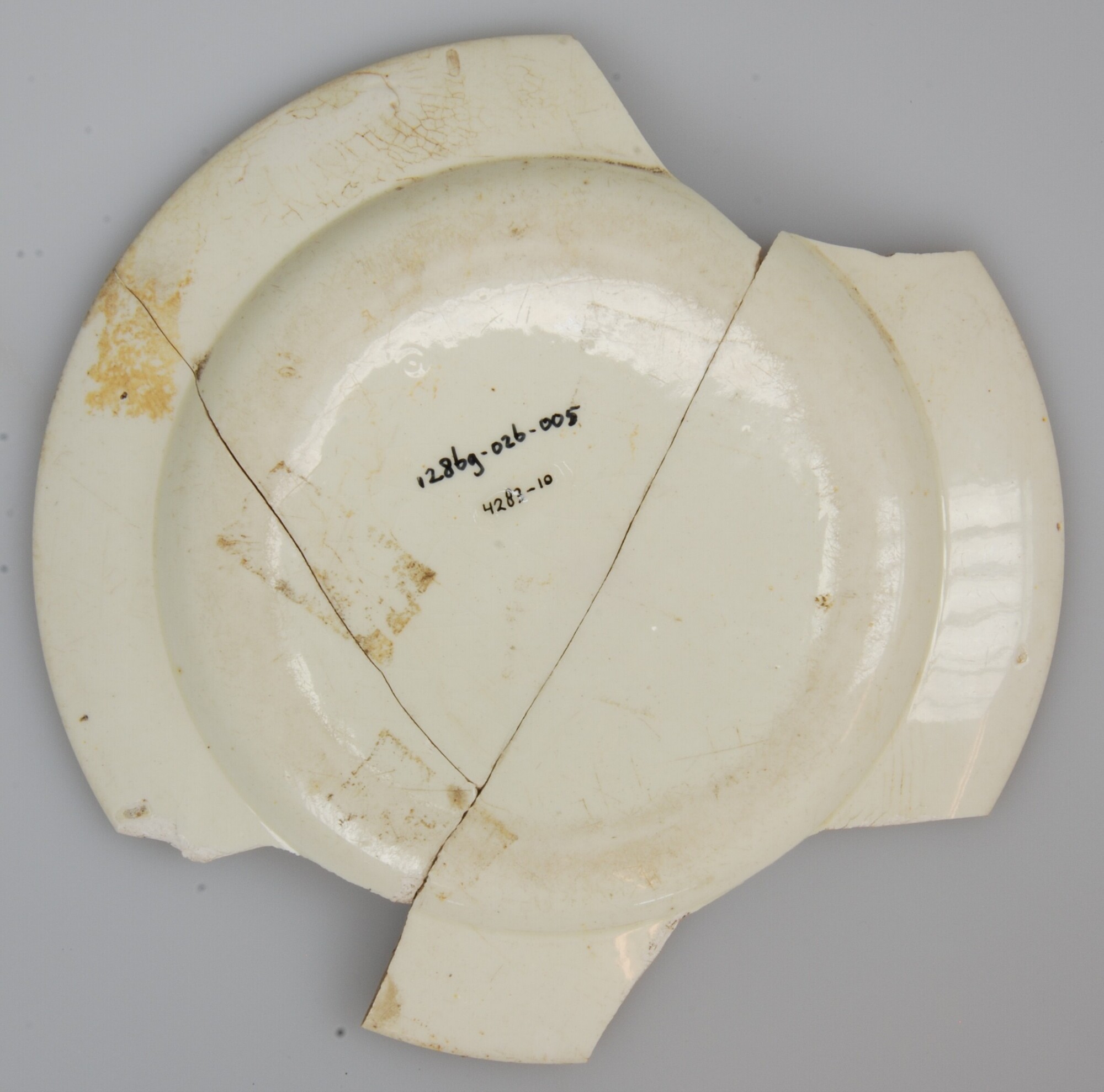 Bord; iw-bor-4; bord met naar buiten geknikte vlag, standvlak; industrieel wit aardewerk (creamware); loodglazuur; profiel compleet; herkomst: vermoedelijk Engeland