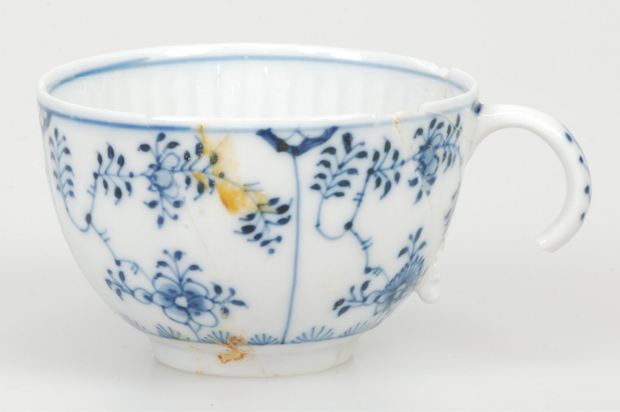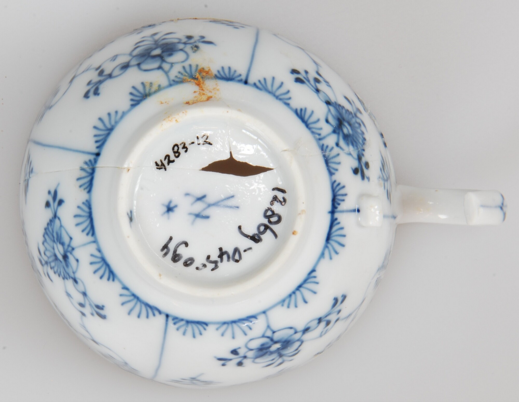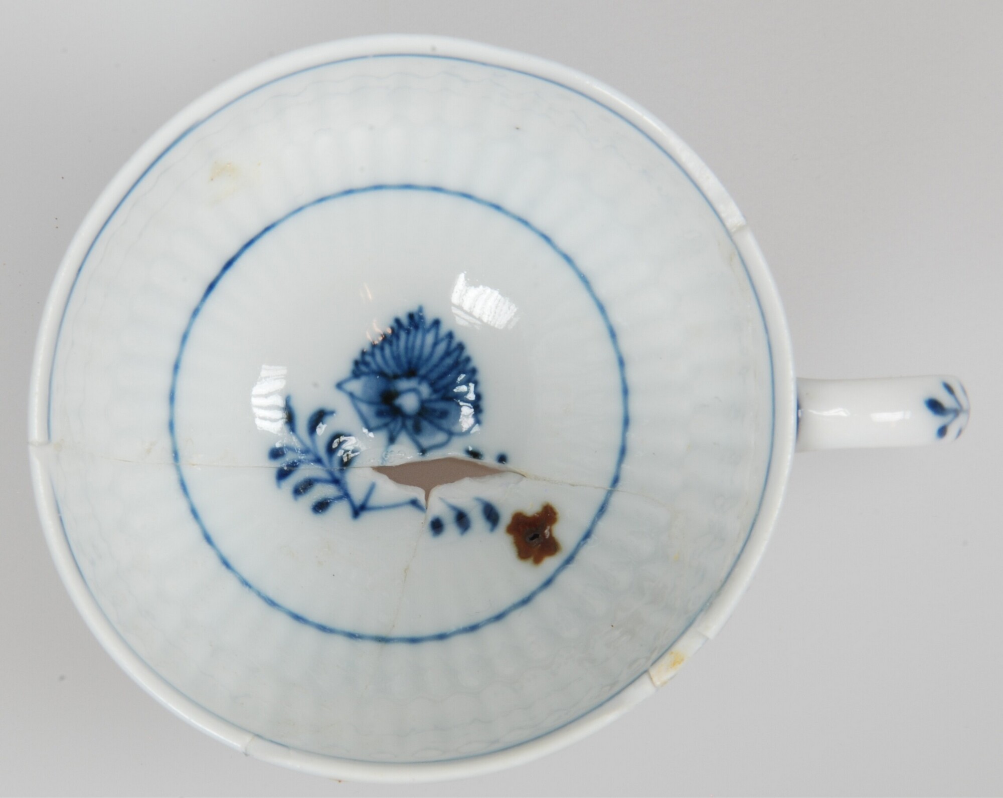 Kop; ep-kop-4; europees porselein; veldspaatglazuur; onderglazuur blauw: inwendig centrale bloem binnen cirkel, uitwendig vakken met 'Zwiebelmuster'; standring; 1 verticaal oor; profiel compleet, onderzijde beeldmerk: gekruiste degens met asterix