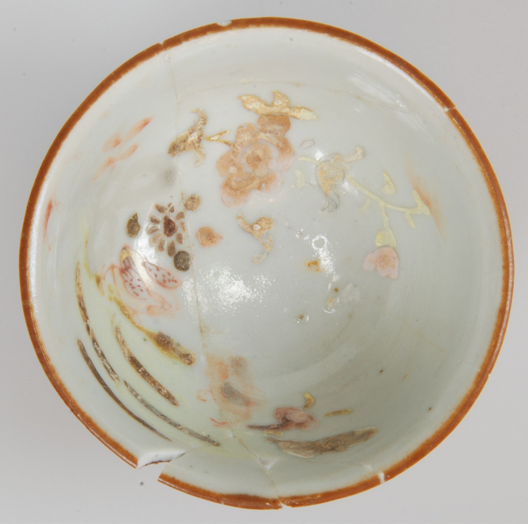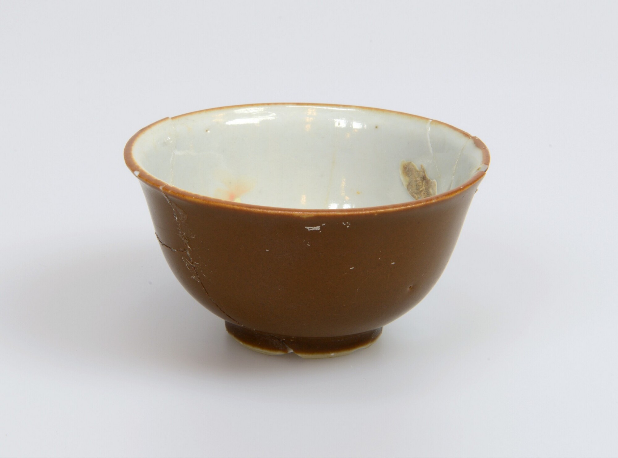 Kop; p-kop-1; Chinees porselein; veldspaatglazuur-ijzeroxide/goud; bovenglazuur rood/bruin/goud: inw. (water) vogels in gestileerd bloemenmotief, uitw. egaal bruin (capucijnergoed); standring