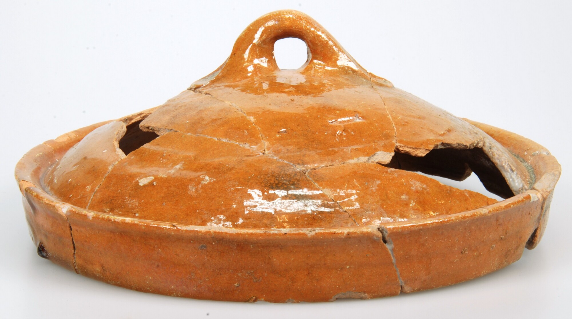 Deksel; r-dek-14; roodbakkend aardewerk; loodglazuur; 1 verticaal worstoor; archeologisch compleet; herkomst: Nederland
