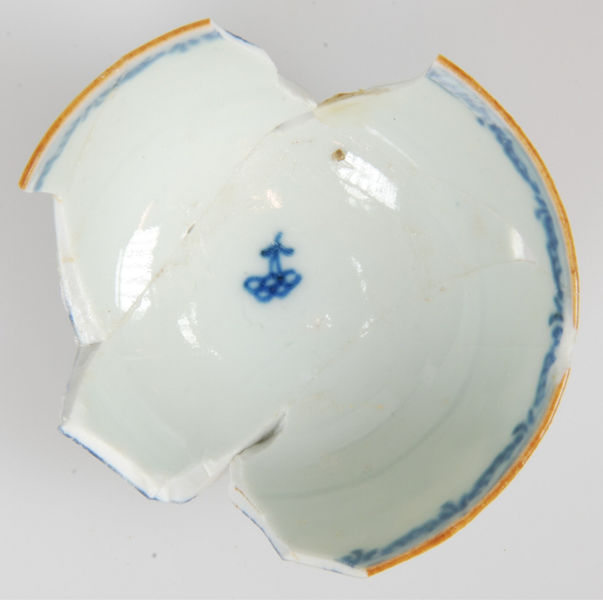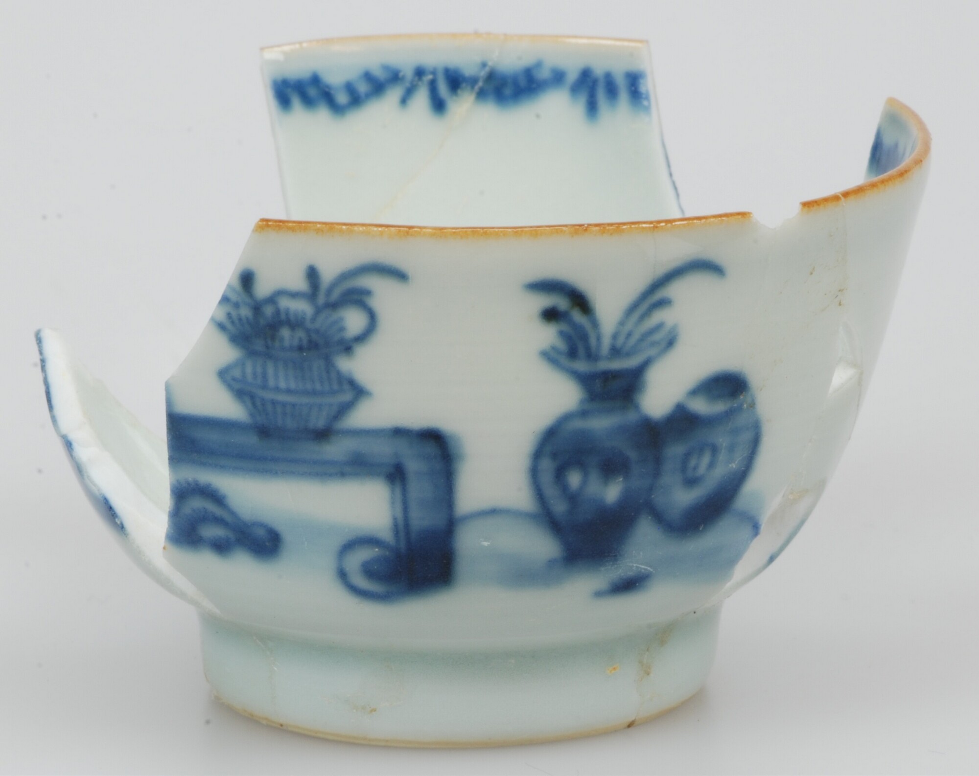 Kop; p-kop-4; porselein; veldspaatglazuur/kobaltoxide; onderglazuur blauw/bruingeel: buitenzijde: bananenboom en tafel met bloemenvazen; inwendig: centrale bloem en guirlandes; 'zeemleer' op rand; standring; archeologisch compleet; herkomst: China