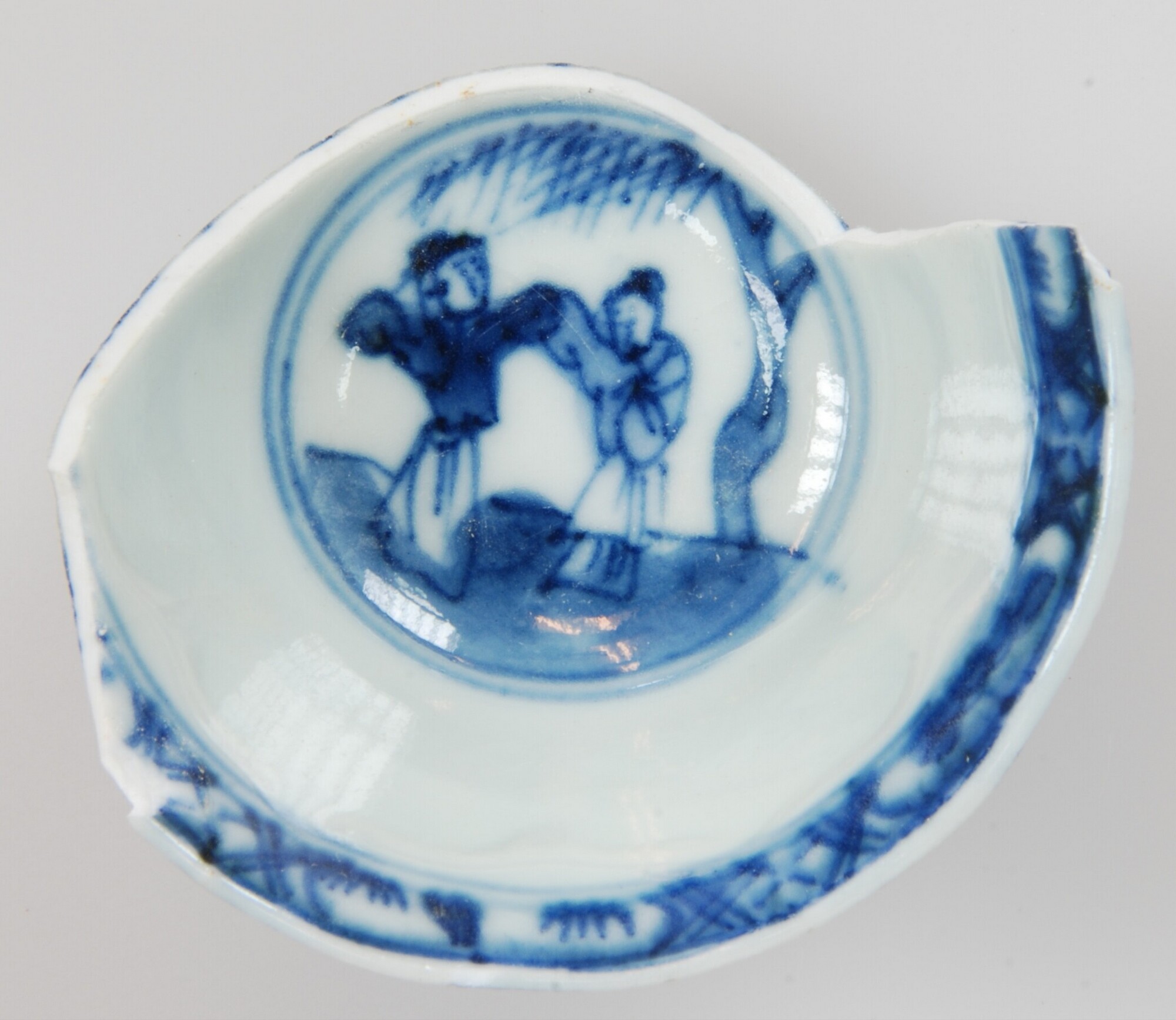 Kop; p-kop-1; veldspaatglazuur/kobaltoxide; onderglazuur blauw; buitenzijde: vakken met bloemen; geometrische motief onder rand; inwendig: twee dansende of strijdende Chinezen in landschap; geometrische motieven onder rand; standring; archeologisch compleet; herkomst: China