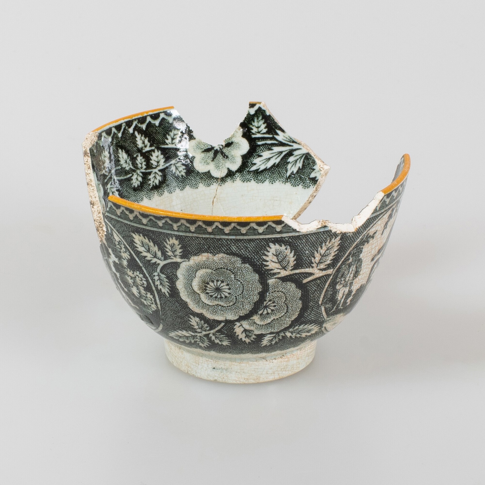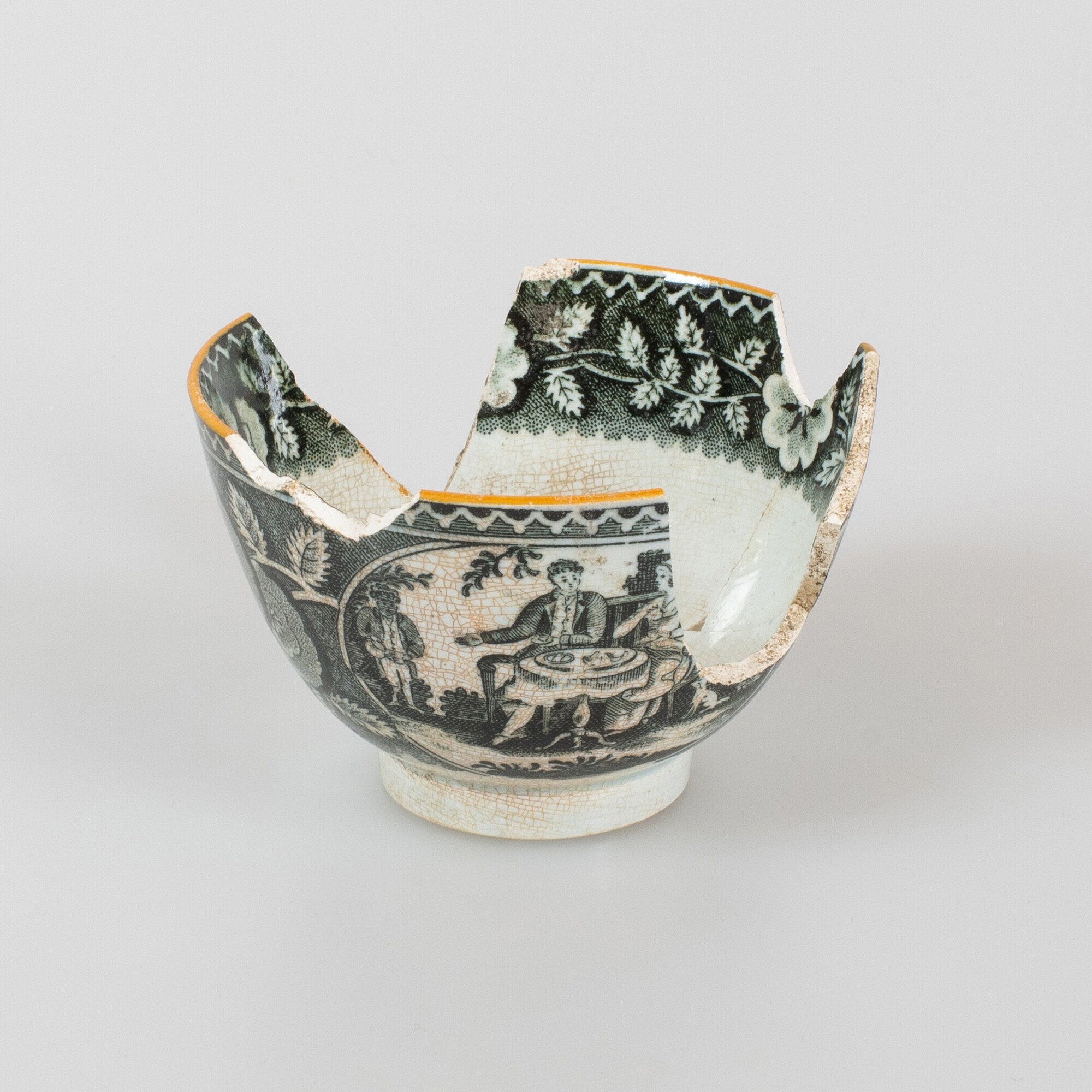 Kop; iw-kop-1; bolle kop met rechte rand, rechte standring; industrieel wit aardewerk (pearlware / transferware); loodglazuur, onderglazuur zwart drukdecor: uitw.: theedrinkend stel in tuin, inw.: florale motieven; decor 'teadrinker' / 'tea party'; okerkleurige rand; herkomst: Engeland, vermoedelijk regio Newcastle