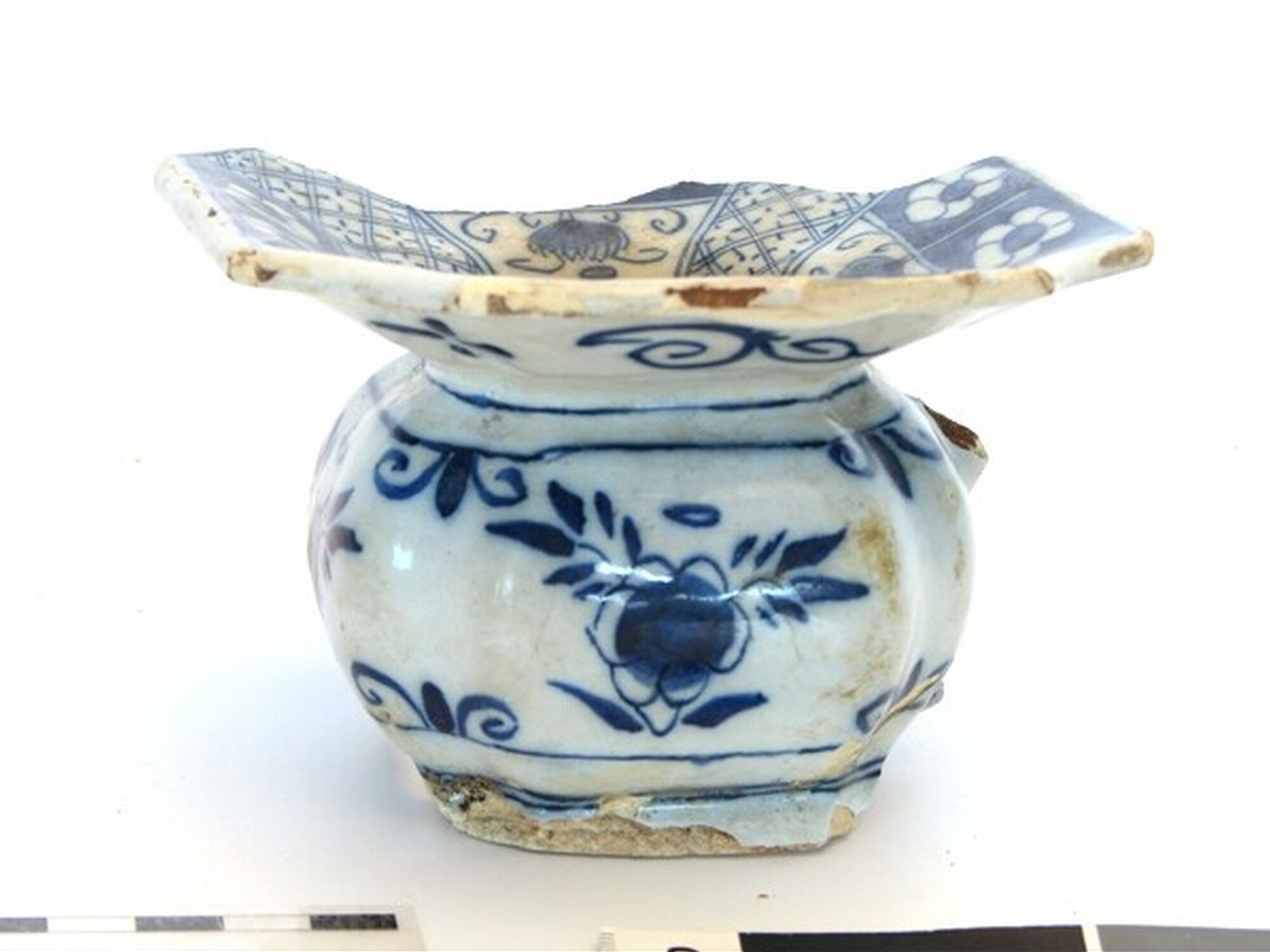 Kwispedoor; f-kwi-3, Nederlandse faience; tinglazuur; blauw motief: bloemen en ruitvormen op vlag, onderzijde vlag slingers, buitenkant met bloemmotief, onderzijde gemerkt; standvoet