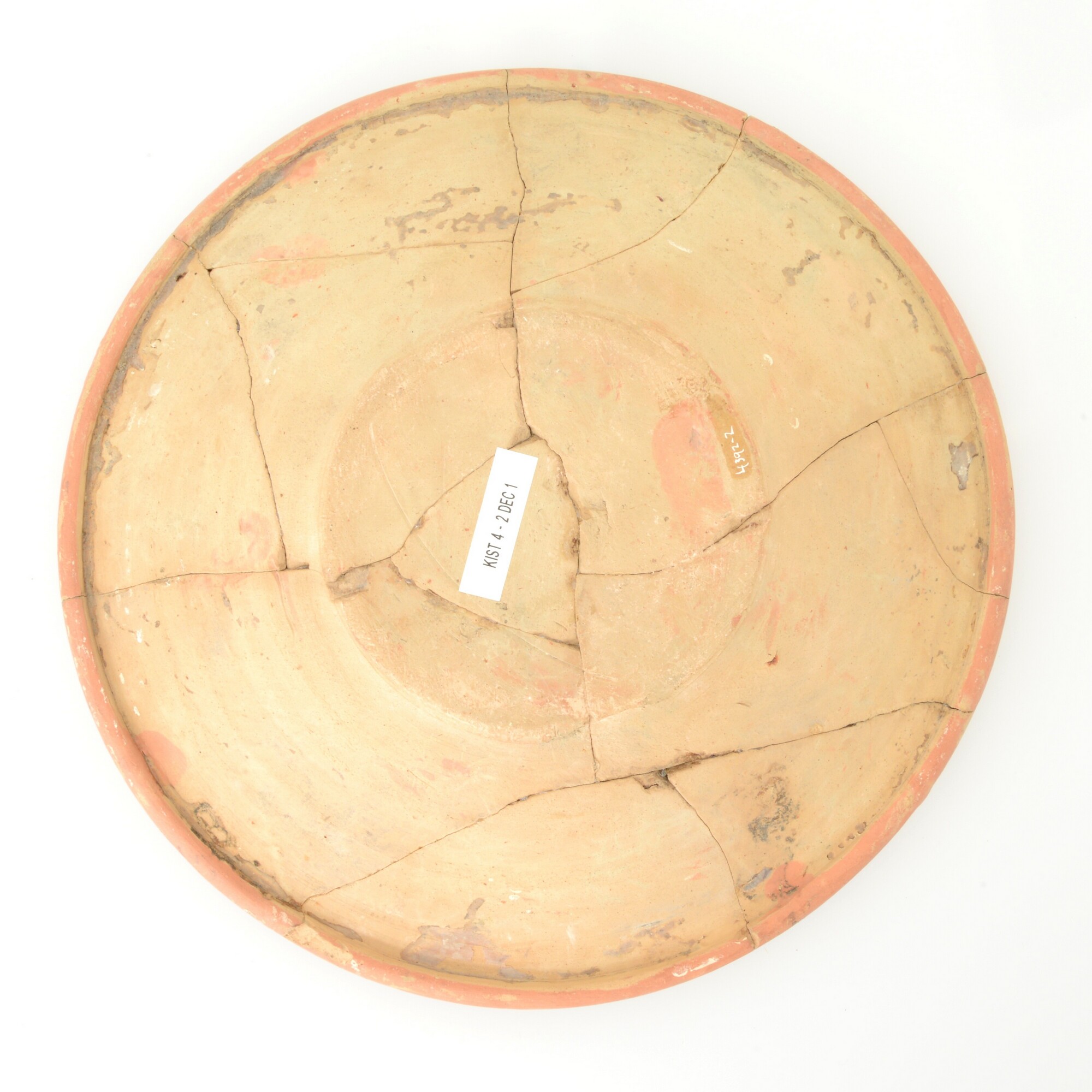 Schotel; wa-bor-1; roodbakkend; halffabricaat, biscuit; slibversiering, slib-krastechniek; vlag: concentrische cirkels, ornamentbanden, spiegel: twee vissen en jaartal 1605; standvlak; productieplaats: Enkhuizen