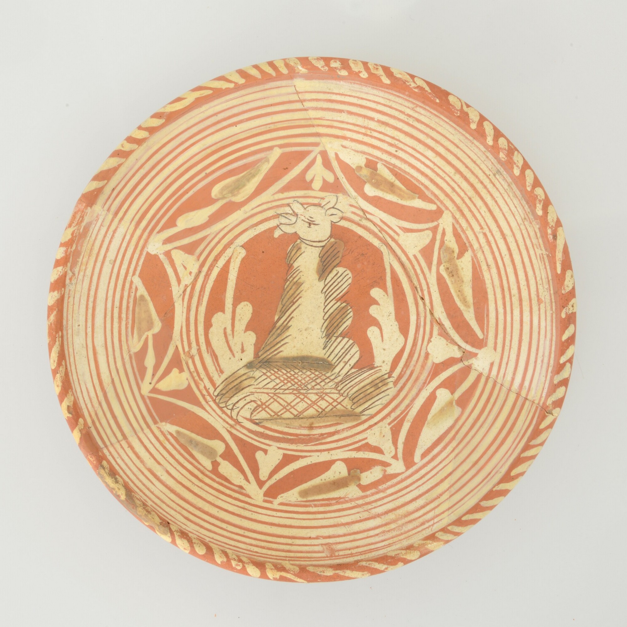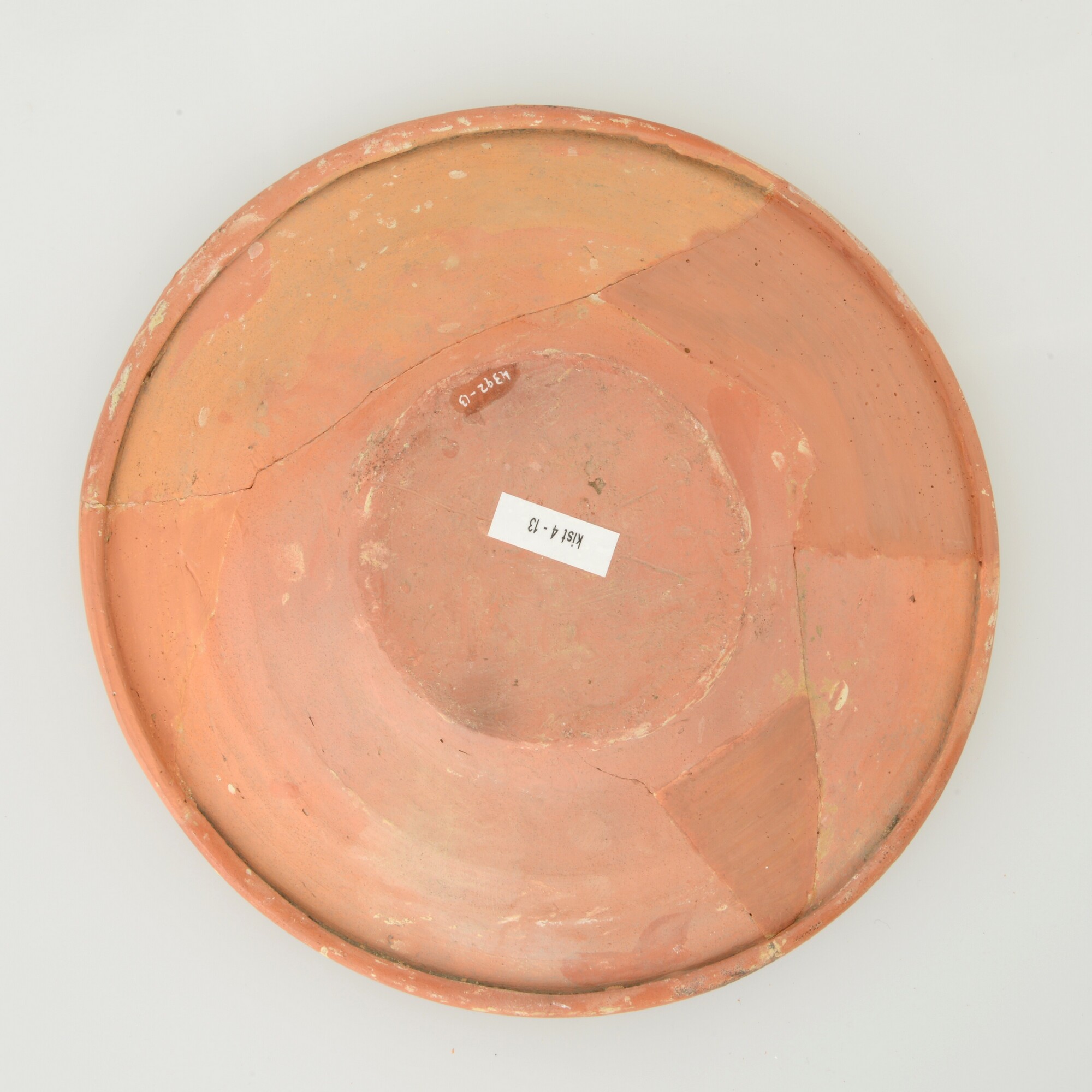 Schotel; wa-bor-1; roodbakkend; halffabricaat, biscuit; slibversiering, slib-krastechniek; vlag: concentrische cirkels, ornamentbanden, spiegel: dierenbuste; standvlak; productieplaats: Enkhuizen.
