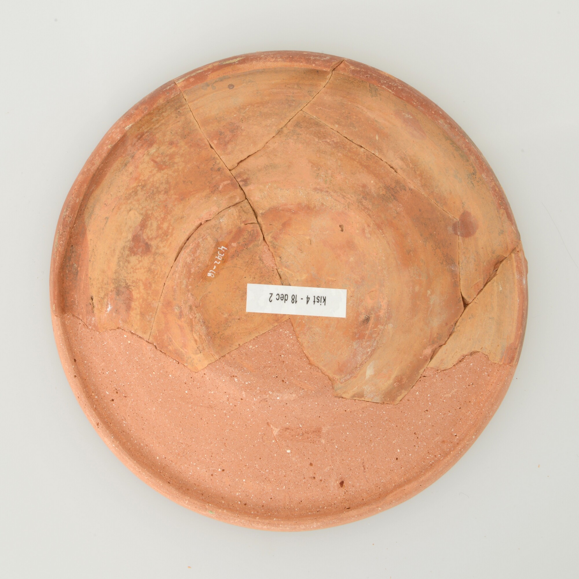 Schotel; wa-bor-1; roodbakkend; halffabricaat, biscuit; slibversiering, slib-krastechniek; vlag: concentrische cirkels, ornamentbanden, spiegel: vogel met gespreide vleugels en jaartal 1605; standvlak; productieplaats: Enkhuizen