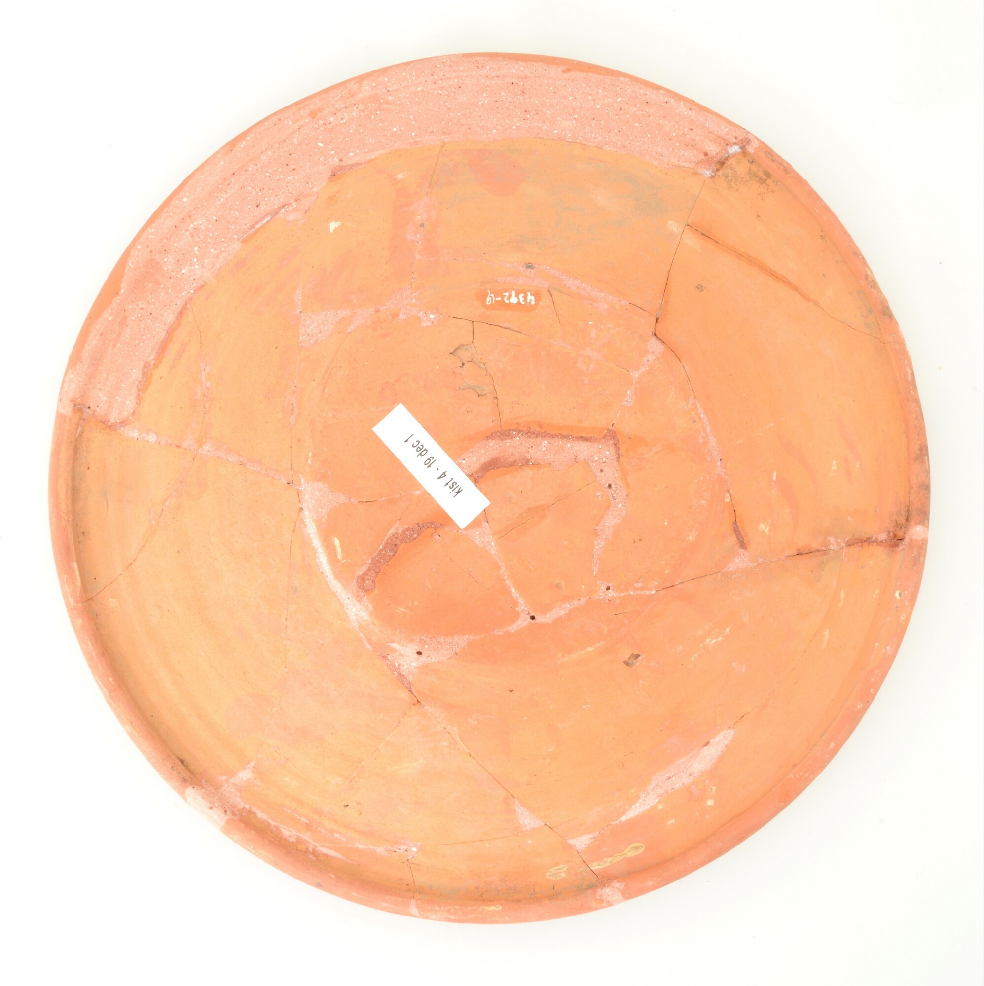 Schotel; wa-bor-1; roodbakkend; halffabricaat, biscuit; slibversiering, slib-krastechniek; vlag: concentrische cirkels, ornamentbanden, spiegel: Haas, initialen DCS en jaartal 1605; standvlak; productieplaats: Enkhuizen