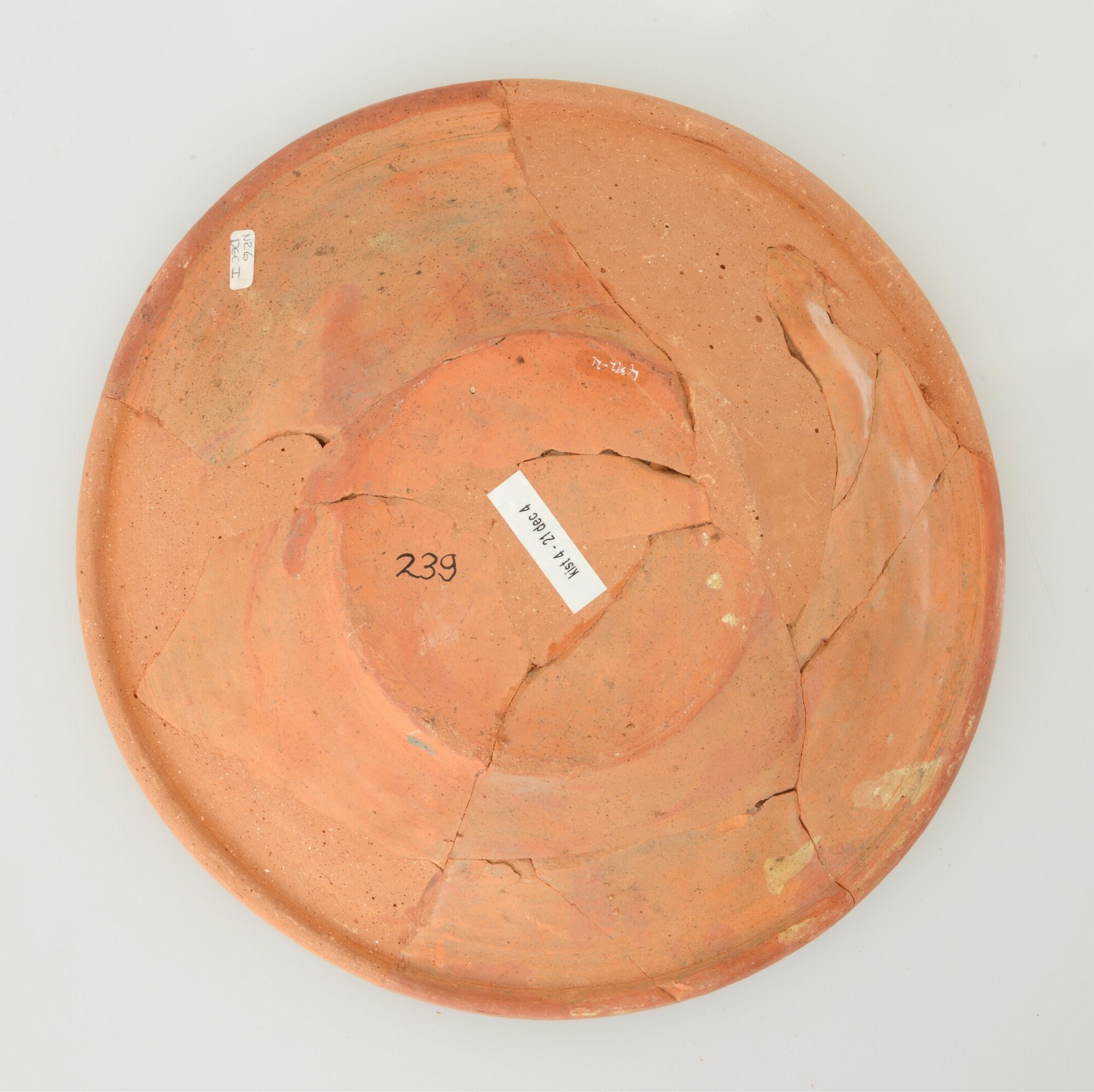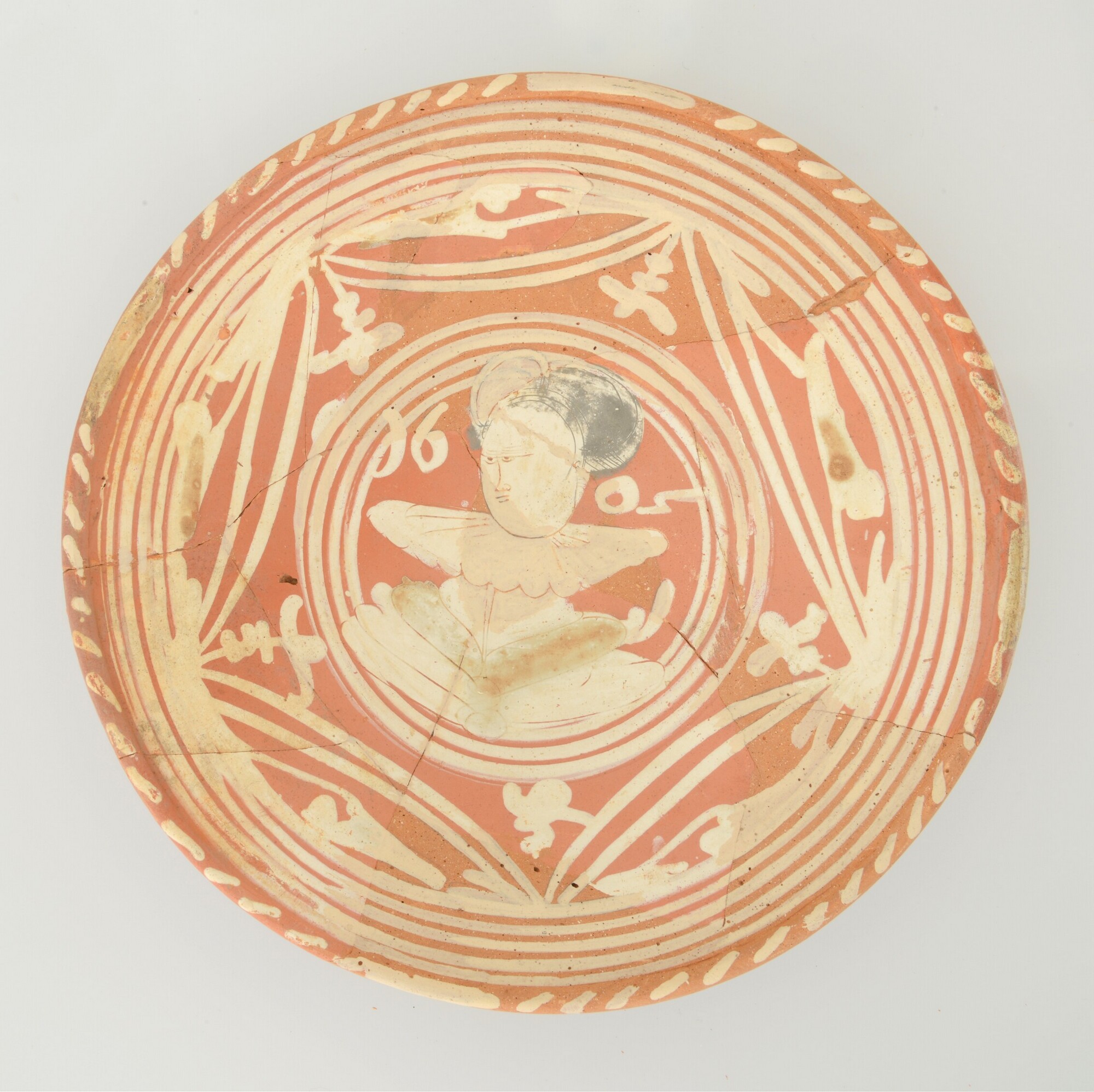 Schotel; wa-bor-1; roodbakkend; halffabricaat, biscuit; slibversiering, slib-krastechniek; vlag: concentrische cirkels, ornamentbanden, spiegel: vrouwenkop en jaartal 1605; standvlak; productieplaats: Enkhuizen