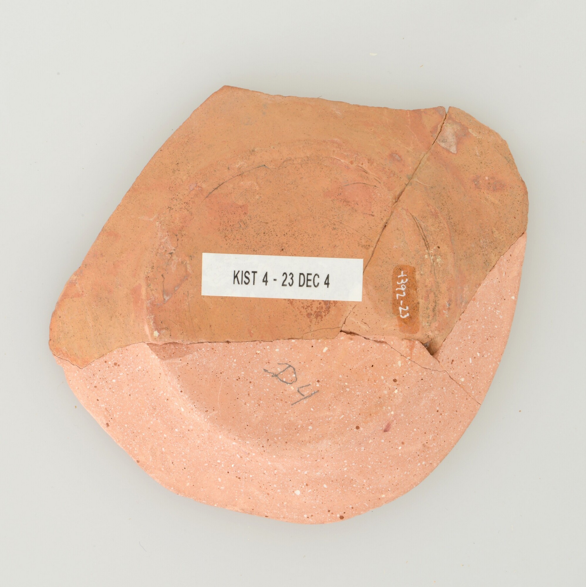 Schotel; wa-bor-1; bodemfragment; roodbakkend; halffabricaat, biscuit; slibversiering, slib-krastechniek; vlag: concentrische cirkels, ornamentbanden; spiegel: drie vissen; standvlak; productieplaats: Enkhuizen