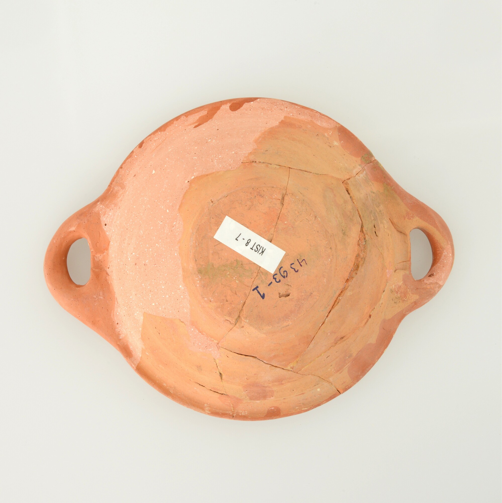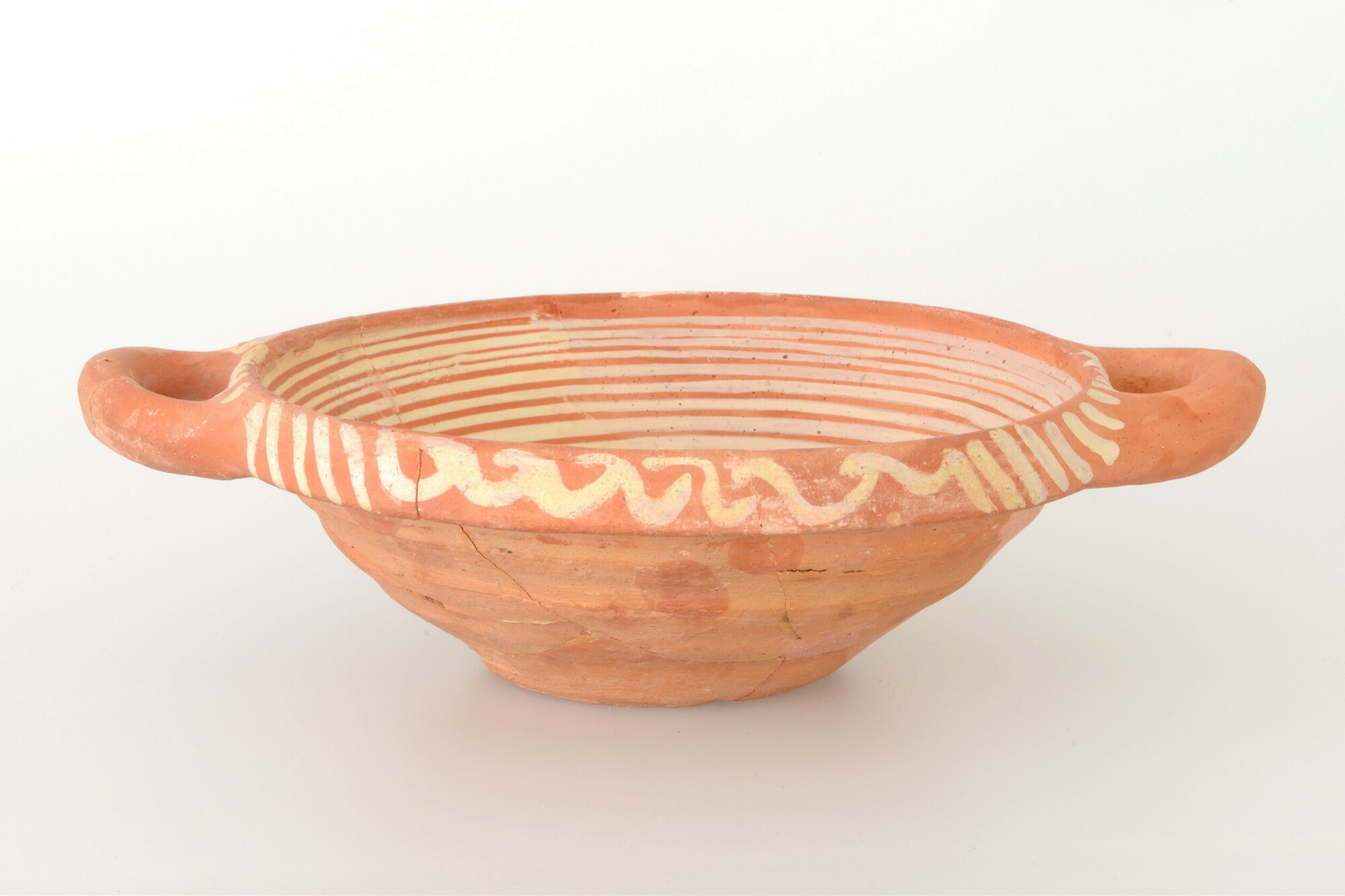 Kom; wa-kom-1; roodbakkend, halffabricaat, biscuit; slibversiering; slib-krastechniek; vl: concentrische cirkels, ornamentbanden, sp: vogel met gesloten vleugels en boom; twee horizontale worstoren; standvlak; productieplaats: Enkhuizen