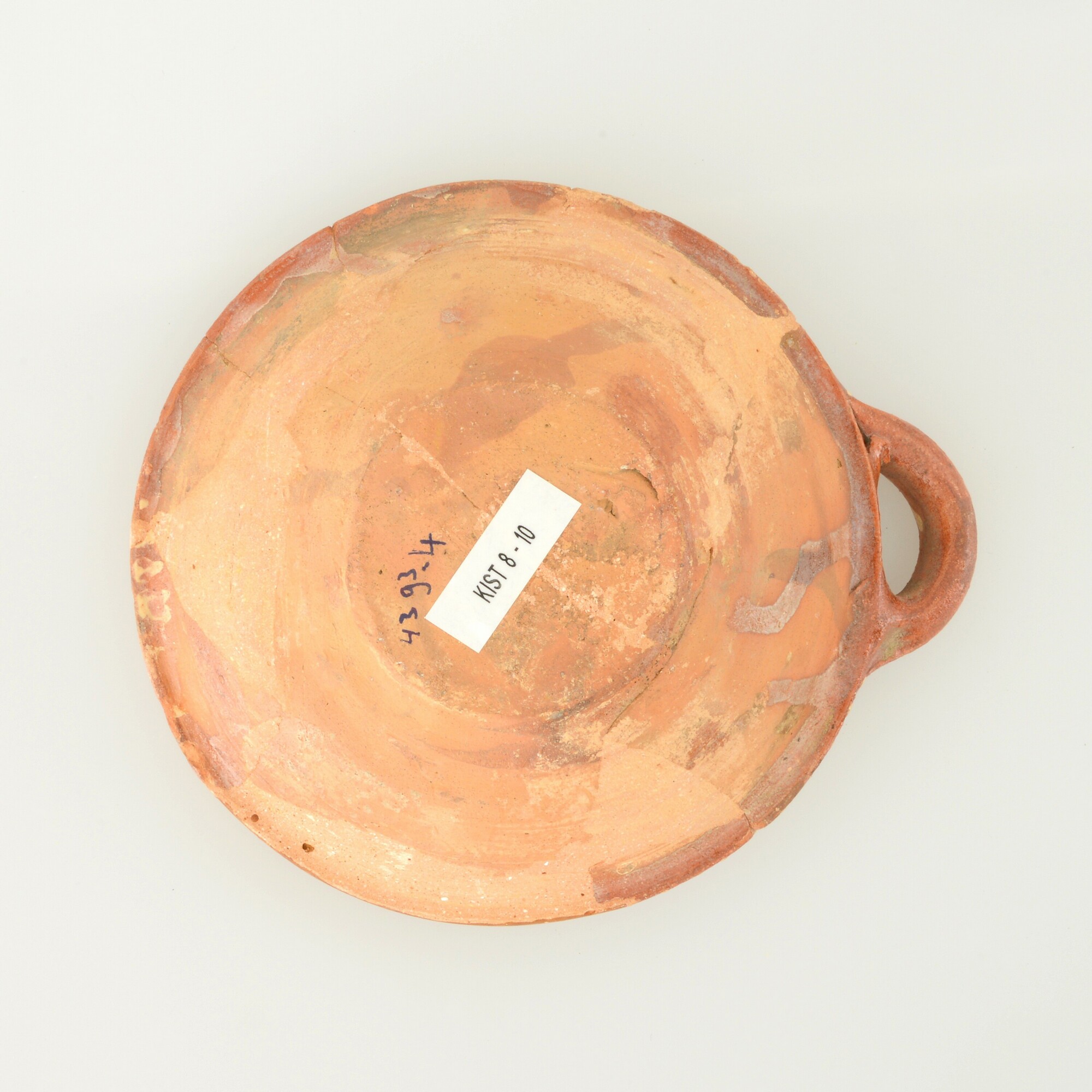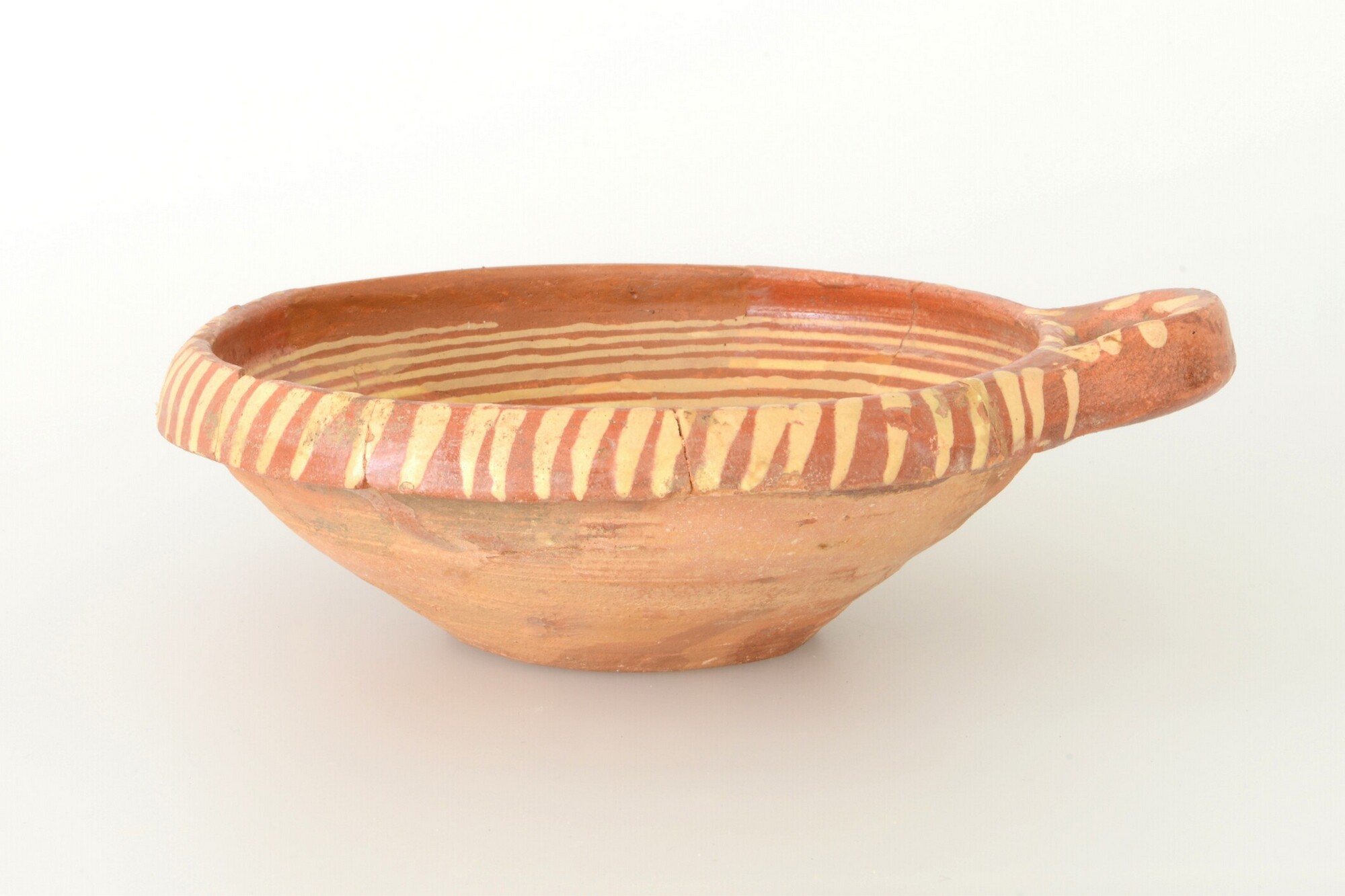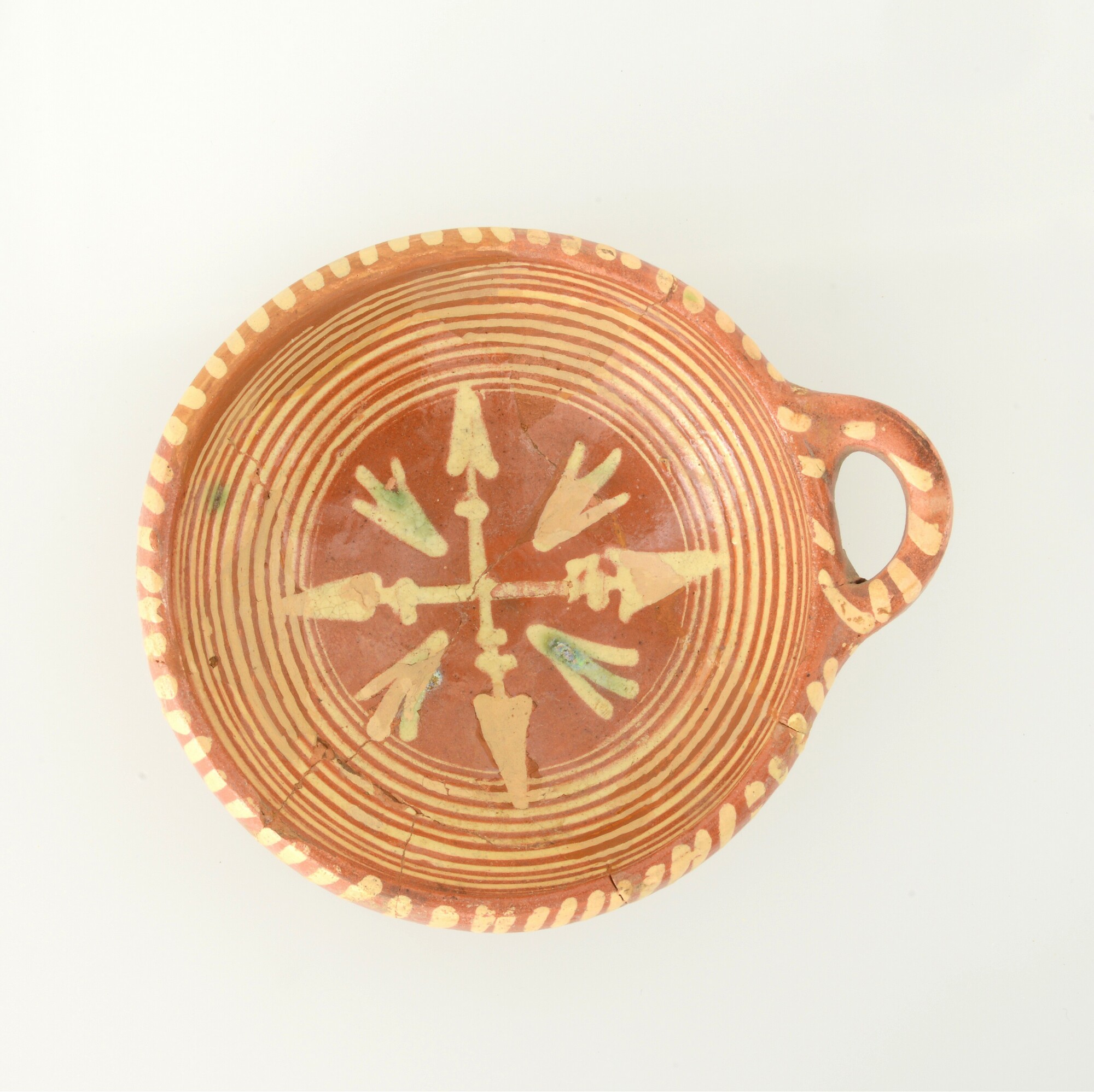 Kom; wa-kom-1; roodbakkend, loodglazuur, slibversiering; vl: concentrische cirkels, ornamentbanden, sp: geometrische motieven in slibversiering, horizontaal worstoor, standvlak; productieplaats: Enkhuizen
