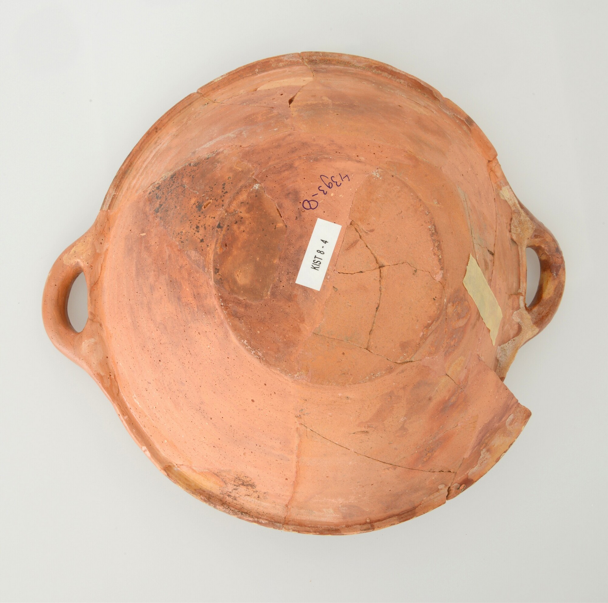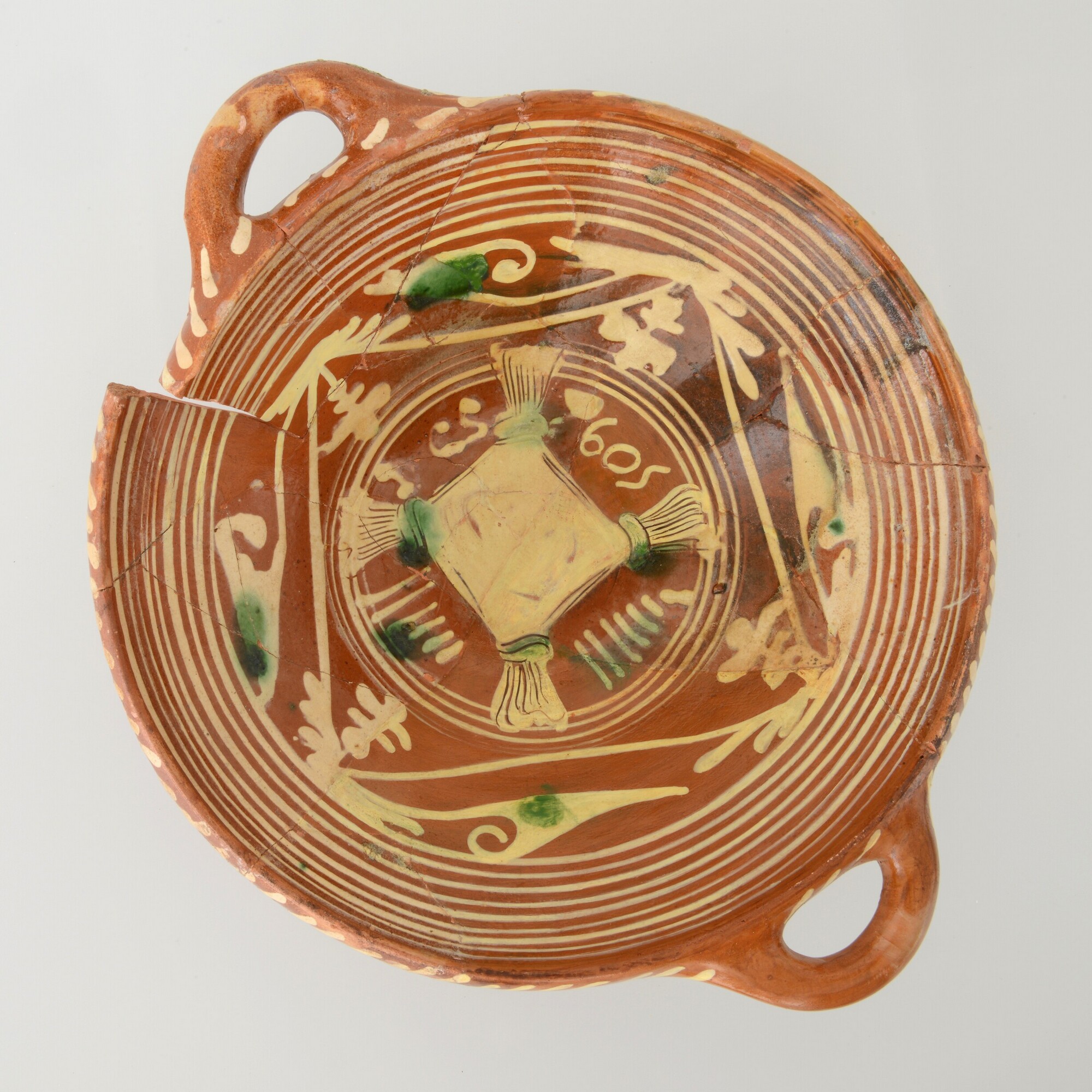 Kom; wa-kom-1; roodbakkend, vervormd en gescheurd; loodglazuur; slibversiering; slib-krastechniek, vl: concentrische cirkels, ornamentbanden, sp: kussen en jaartal 1605; standvlak; twee horizontale worstoren; productieplaats: Enkhuizen