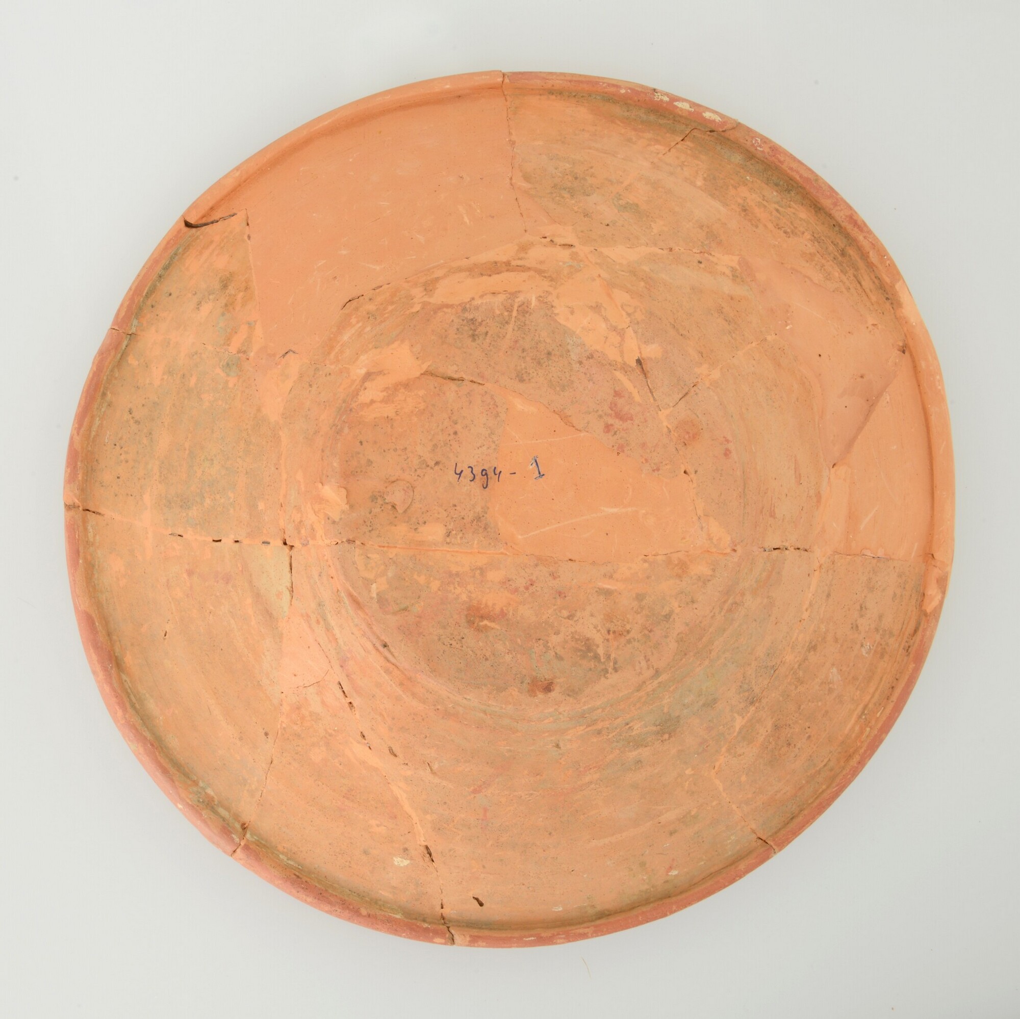 Schotel; wa-bor-1; roodbakkend; halffabricaat, biscuit; slibversiering, slib-krastechniek; vl: concentrische cirkels, ornamentbanden, sp: twee druiventrossen met distel; standvlak; productieplaats: Enkhuizen
