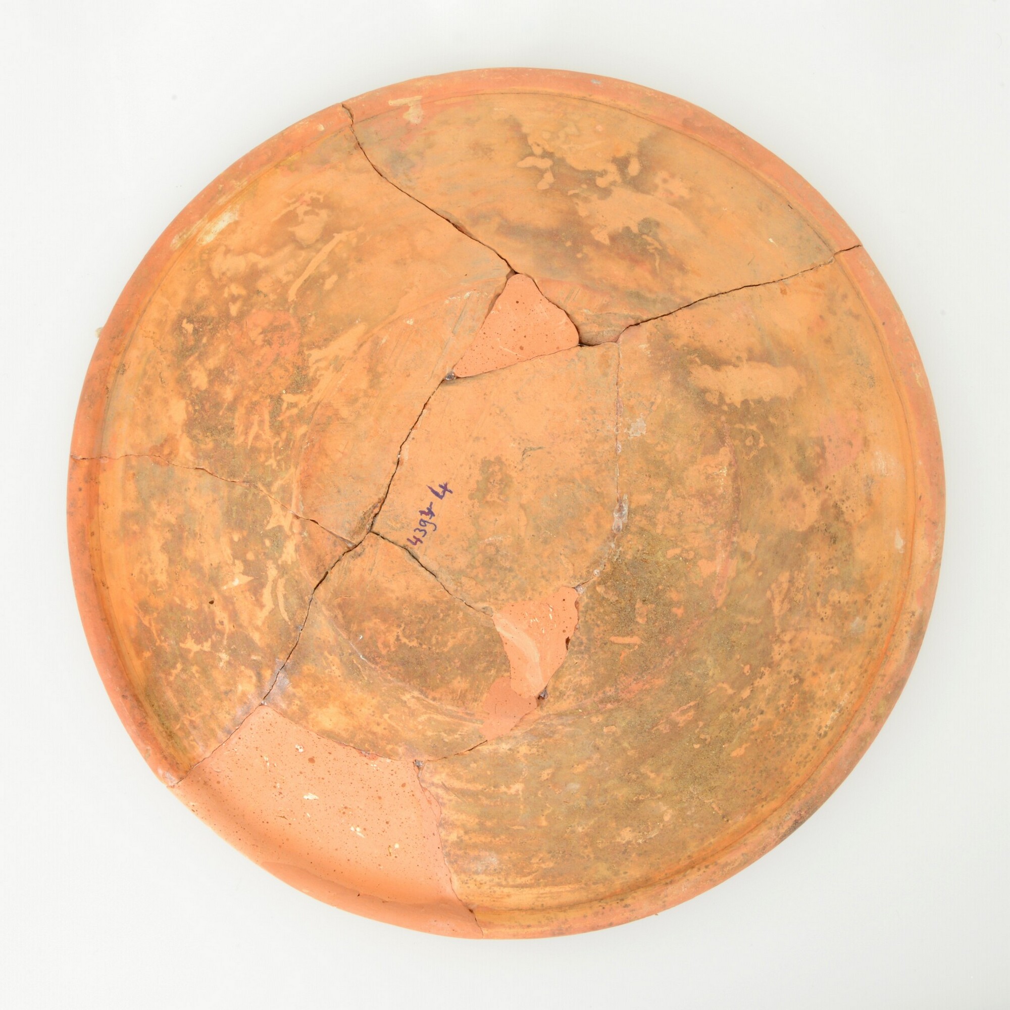 Schotel; wa-bor-1; roodbakkend; halffabricaat, biscuit; slibversiering, slib-krastechniek; vl: concentrische cirkels, ornamentbanden, sp: springend hert, standvlak; productieplaats: Enkhuizen