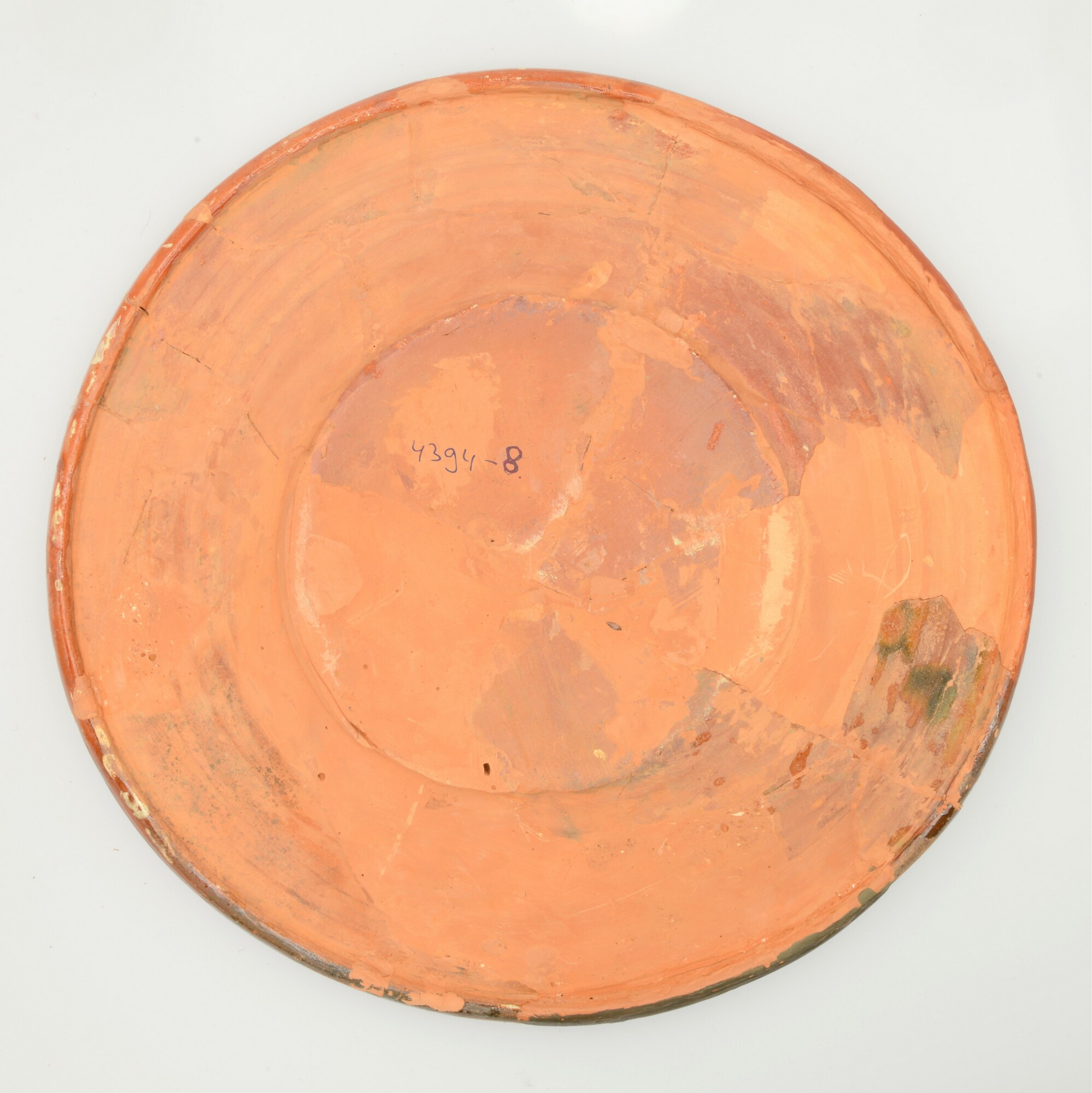 Schotel; wa-bor-1; roodbakkend, loodglazuur, deels verbrand; slibversiering; slib-krastechniek; vl: concentrische cirkels, ornamentbanden, sp: druiventros, initialen DCS en jaartal (160)5; standvlak; productieplaats: Enkhuizen
