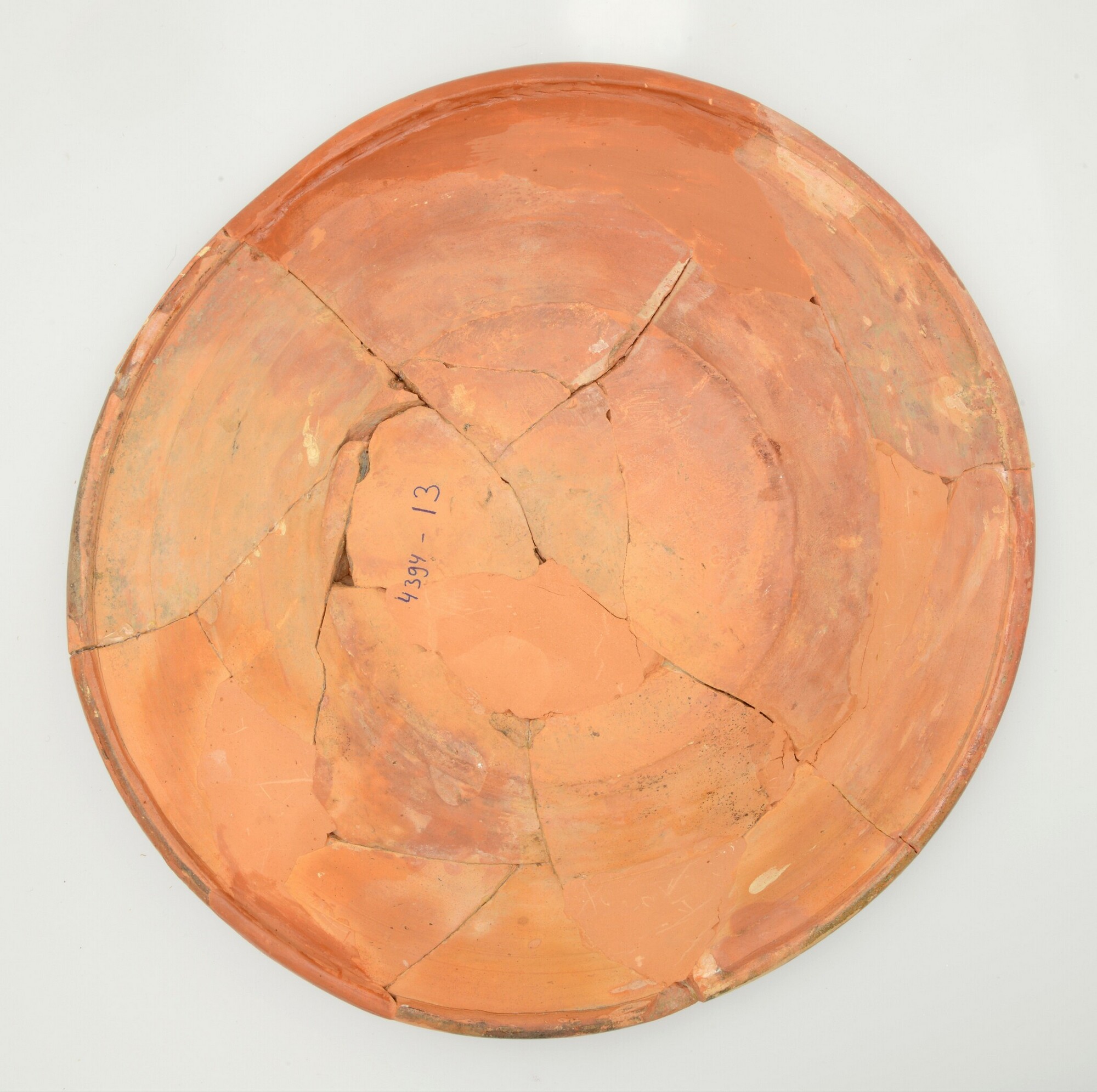 Bord; wa-bor-1; roodbakkend, misbaksel; loodglazuur, slibversiering; slib-krastechniek; vl: concentrische cirkels, ornamentbanden, sp: druiventros, initialen DCS en jaartal 1605; standvlak; productieplaats: Enkhuizen