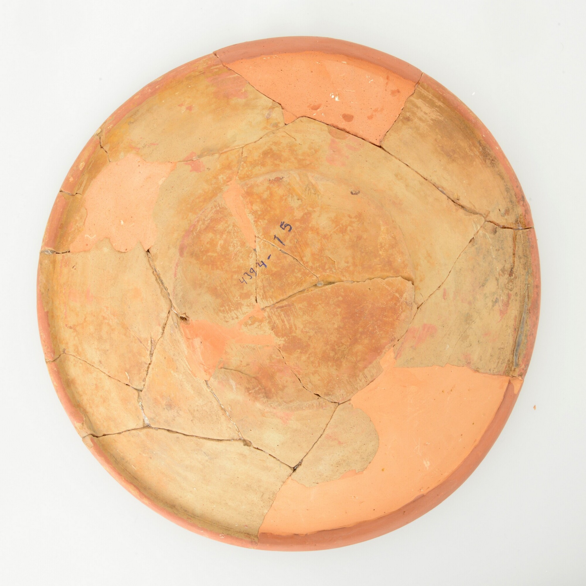 Schotel; wa-bor-1; roodbakkend; halffabricaat, biscuit; slibversiering, slib-krastechniek; vl: concentrische cirkels, ornamentbanden; sp: zon, zevenpuntig; standvlak; productieplaats: Enkhuizen