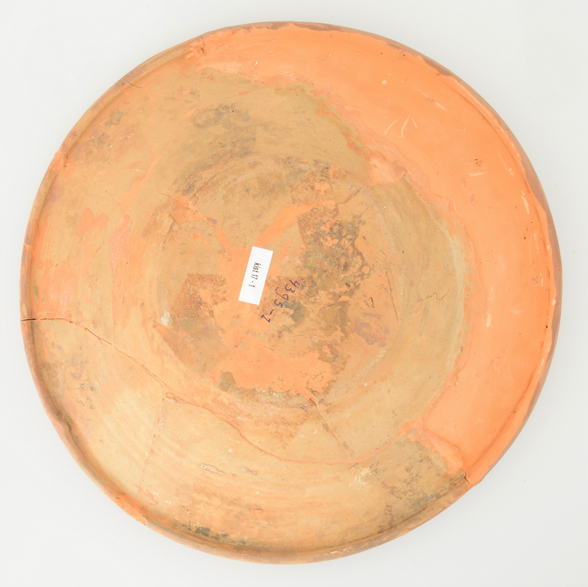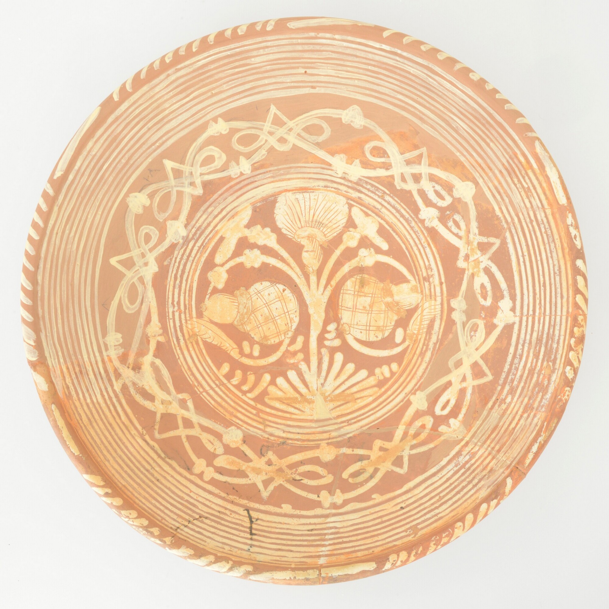 Schotel; wa-bor-1; roodbakkend; halffabricaat, biscuit; slibversiering, slib-krastechniek; vl: concentrische cirkels, ornamentbanden, sp: twee eikels met distel; standvlak; productieplaats: Enkhuizen