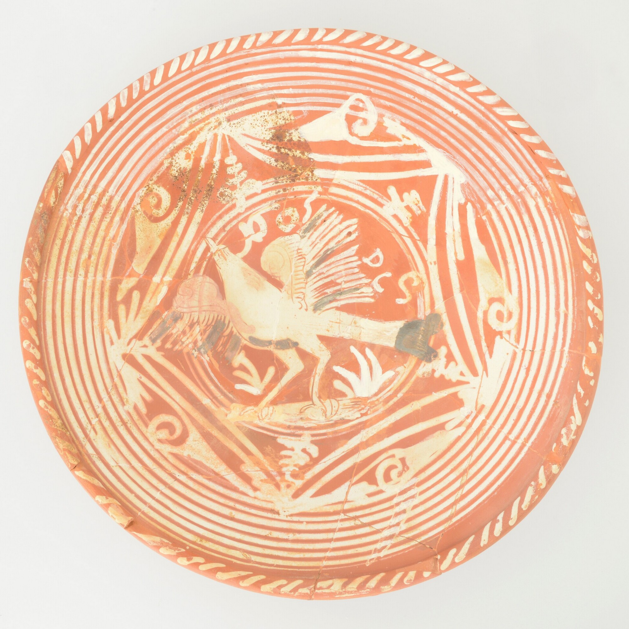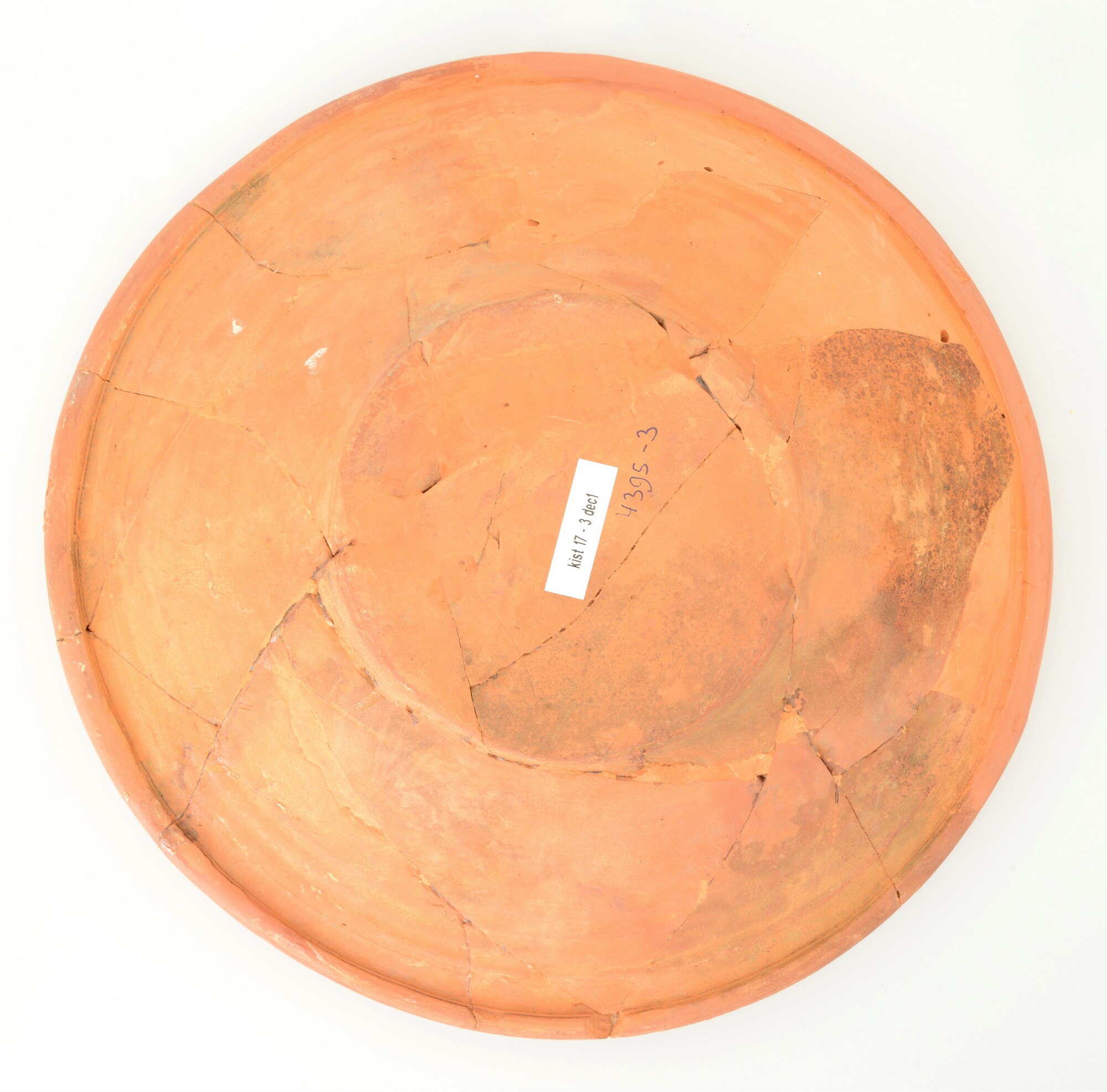 Schotel; wa-bor-1; roodbakkend; halffabricaat, biscuit; slibversiering, slib-krastechniek; vl: concentrische cirkels, ornamentbanden, sp: vogel met gespreide vleugels, initialen DCS en jaartal 1605; standvlak; productieplaats: Enkhuizen